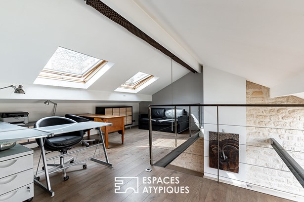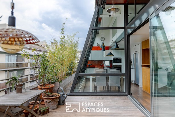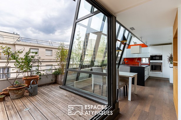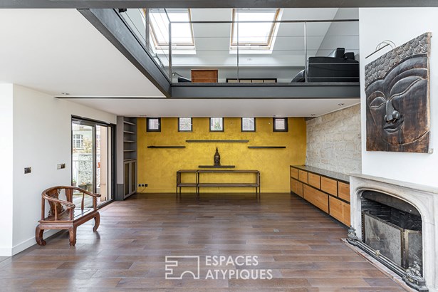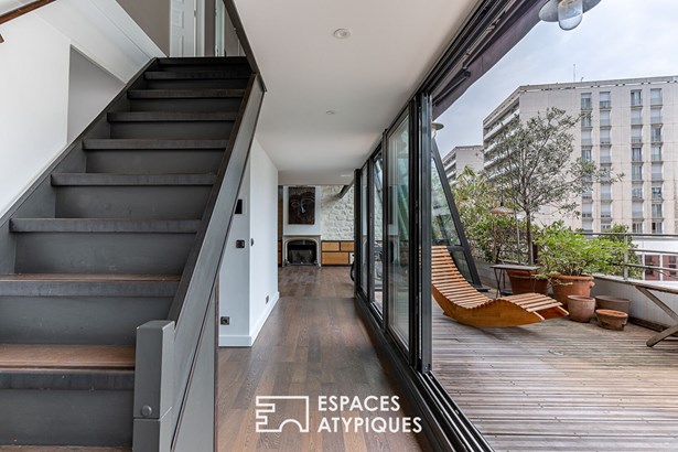 This top-floor duplex stands out for its atypical vertical layout, dramatic volumes, seamless indoor-outdoor flow, and discreet, desirable address, an increasingly rare find on the Parisian market.