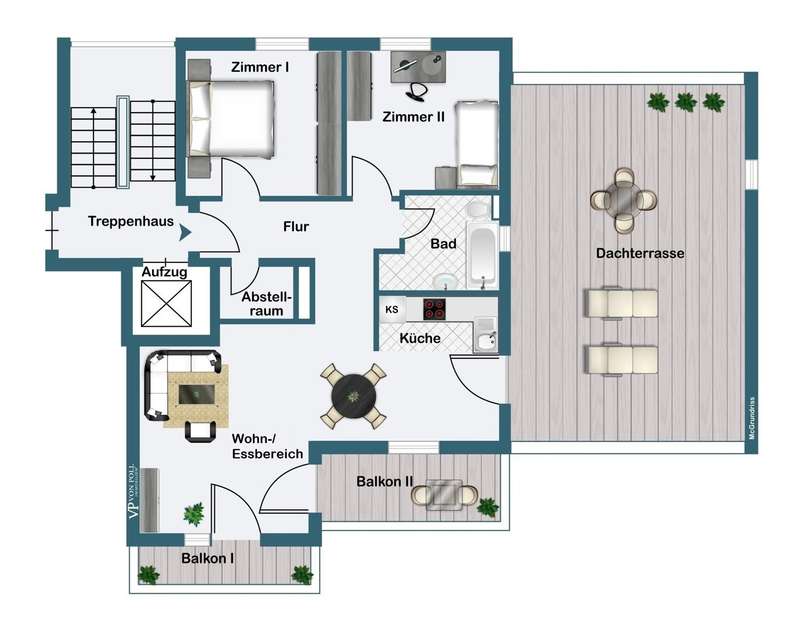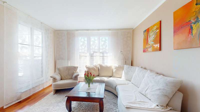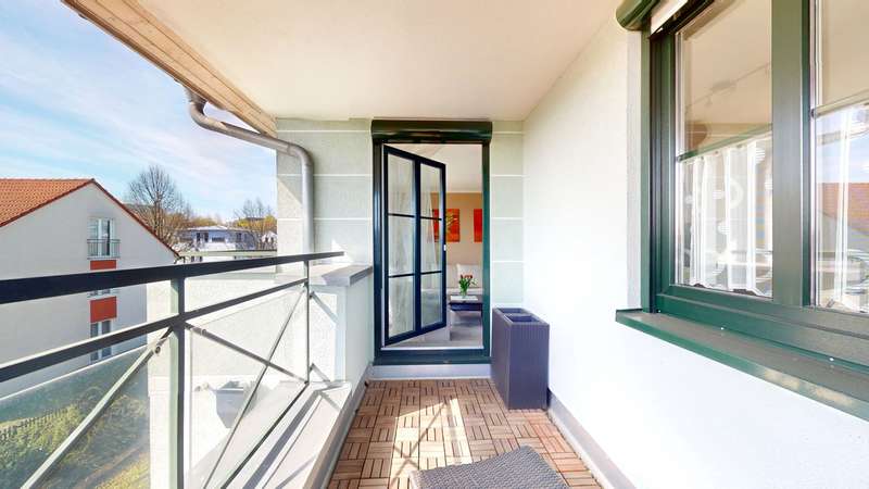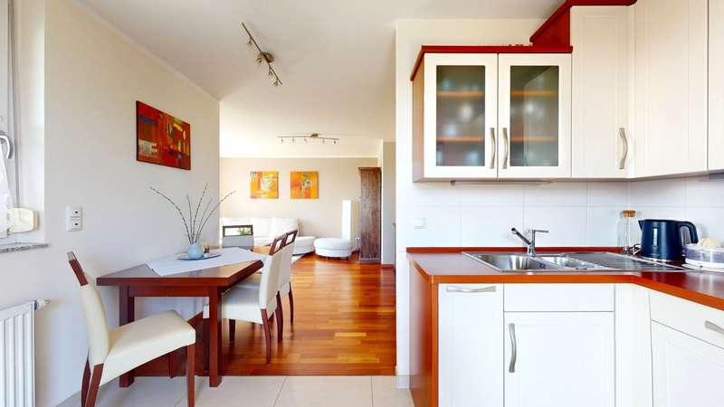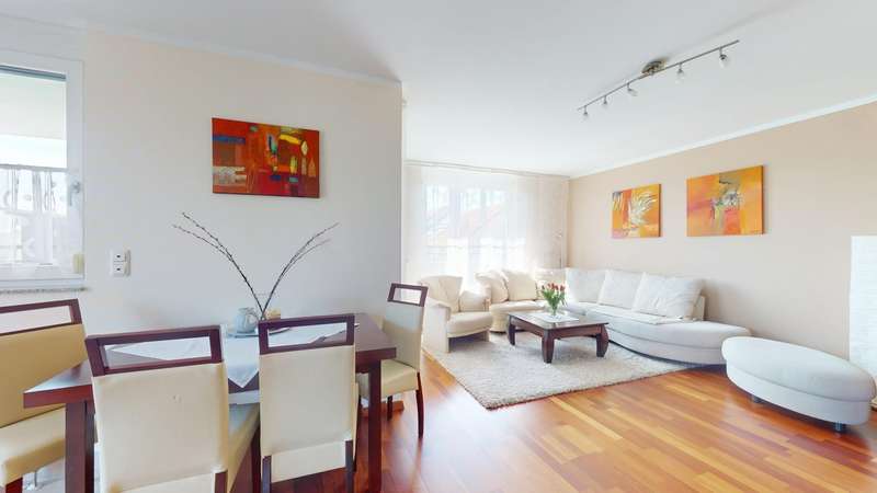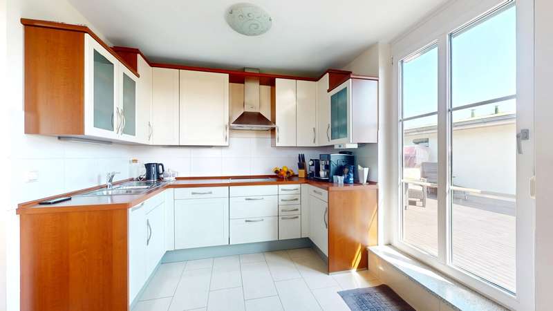 This well-kept three-room apartment is located on the top floor of a modern property on the popular Riedberg. Thanks to the tasteful furnishings and full equipment with everyday items, you can move in here and feel at home from day one. Particularly noteworthy is the wonderful roof terrace measuring around 45 m², where you can enjoy the sun at any time of day. Numerous amenities make living here a permanently pleasant experience. Be it the spacious fitted kitchen, the bathroom with window or the parquet flooring and much more. The apartment has a spacious living/dining area with an open-plan kitchen and direct access to the roof terrace and balconies. The bedroom and a further room offer plenty of space for a small family. The hallway leads to the daylight bathroom and the practical storage room. In the basement there is the obligatory cellar room, a laundry room with its own washing machine and the extra-wide underground parking space (plus €100/month).