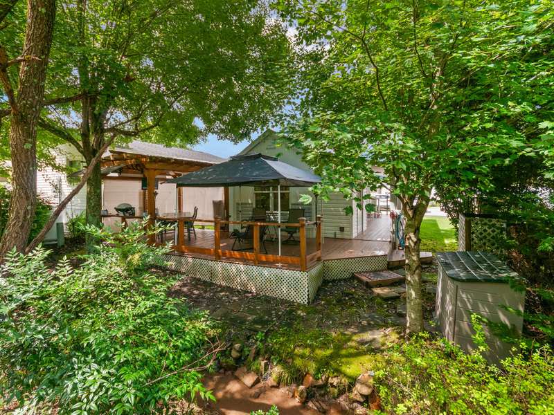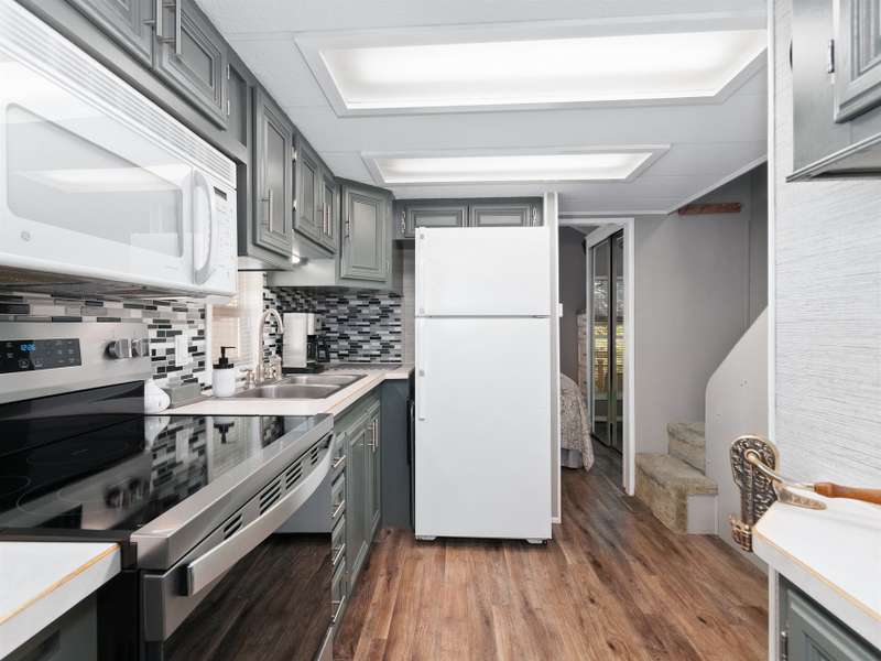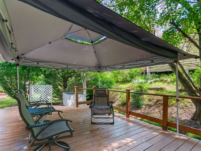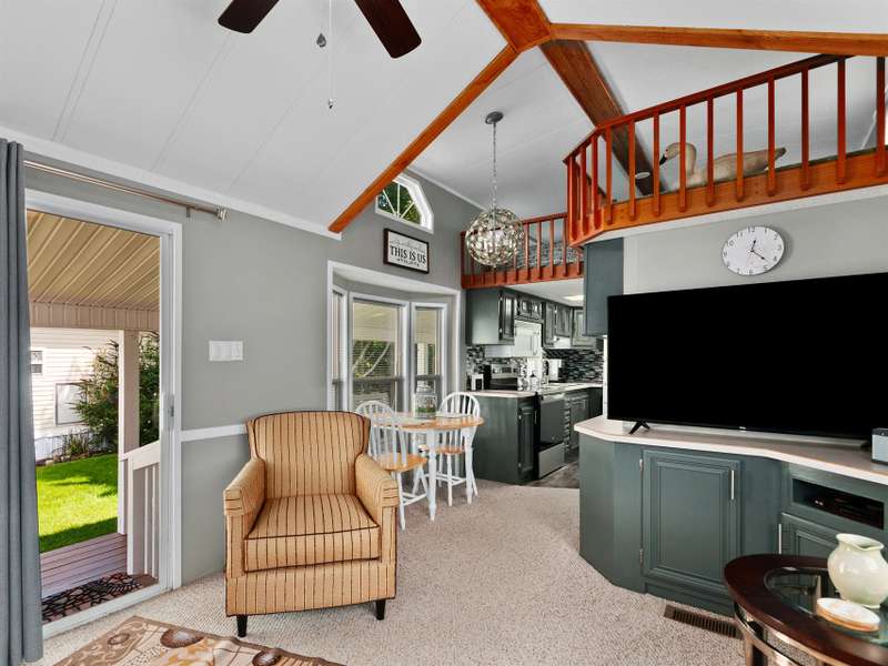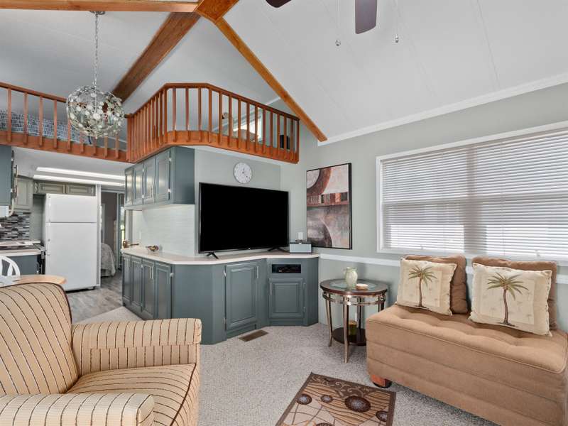 WITH additional RV LOT!! This charming 400+ sq ft park model boasts vaulted ceilings and an open floor plan, creating a cozy, move-in-ready retreat. Featuring one bedroom, bathroom, and an open sleeping loft, offering ample space for relaxation. The spacious kitchen includes abundant cabinetry for storage & entertaining. Enjoy a large covered side deck and over 250 sq ft of partially covered rear deck, perfect for soaking in the serene Creekside views. The private, relaxing setting includes an additional level lot with full electrical, water, and sewer hookups, plus a concrete pad and a 10x12 outbuilding with vinyl flooring, electricity and concrete driveway with extra rebar for heavy RV's. Both lots offer year-round paved access and stunning mountain views. Located just minutes from Maggie Valley, downtown Waynesville, and the Blue Ridge Parkway, this property is an ideal getaway or permanent home.