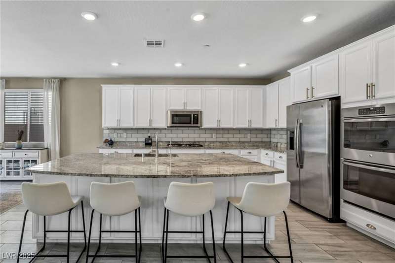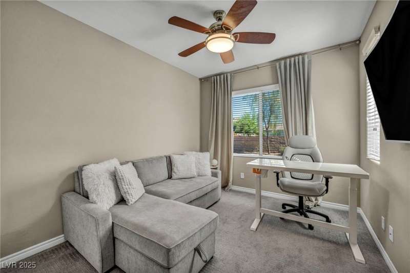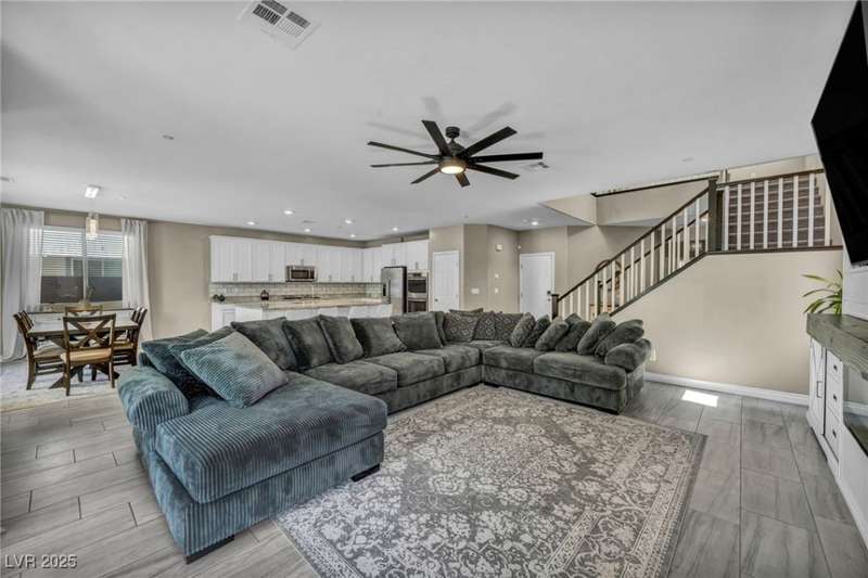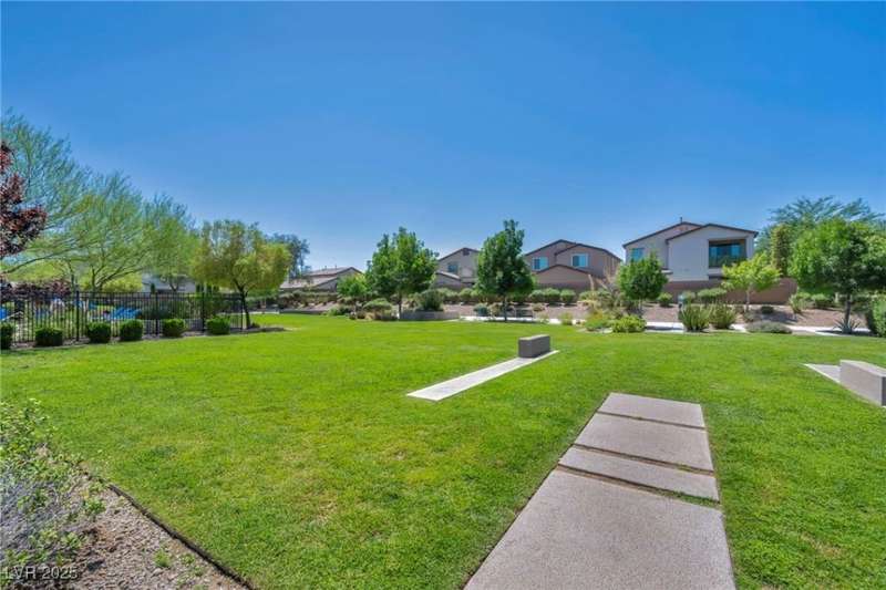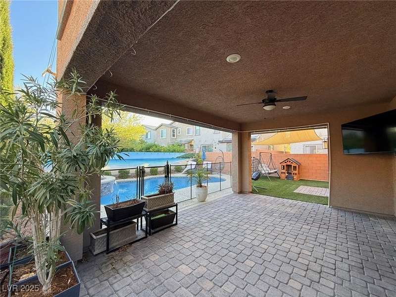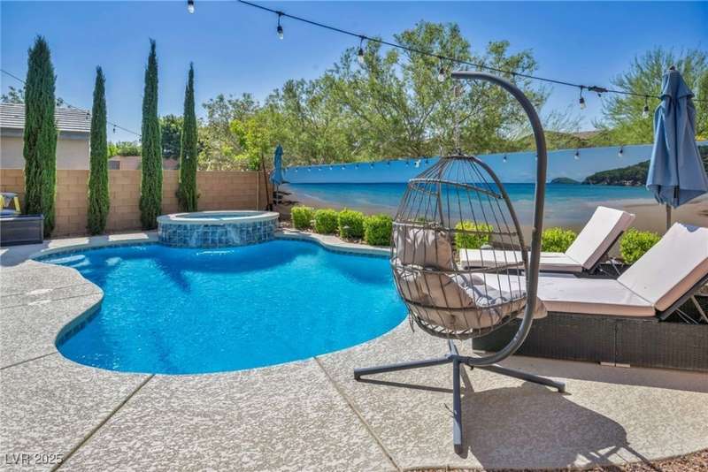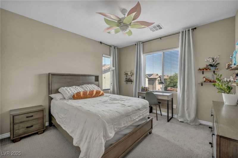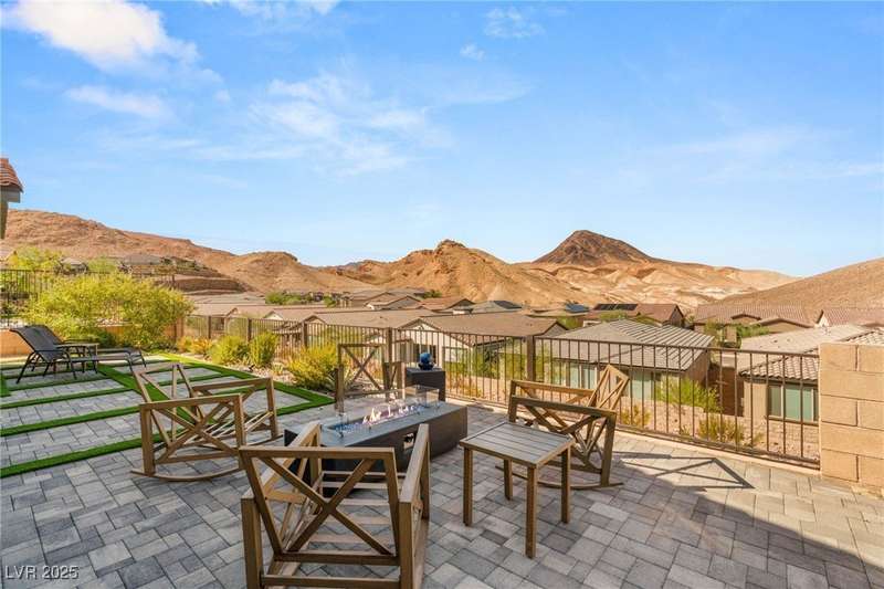 Beautifully maintained and move-in ready, this spacious 5-bedroom, 3-bath home offers the perfect blend of comfort, function, and style in a gated Henderson community. The open-concept floor plan features a bright living area, modern kitchen with island, stainless steel appliances, and walk-in pantry. Upstairs, the primary suite boasts a private balcony with park views and a large custom closet. Step outside to one of the best backyards around?with a sparkling heated pool, covered patio, and professionally landscaped yard ideal for family gatherings and outdoor fun. Additional highlights include solar panels, powered shades, custom storage throughout, Ring cameras, and an oversized garage with built-ins. Appx living area -3,058 sq., garage - 497 sq.ft. Best value per sq.ft. Immaculate condition and pride of ownership throughout?this is the home your family has been waiting for!