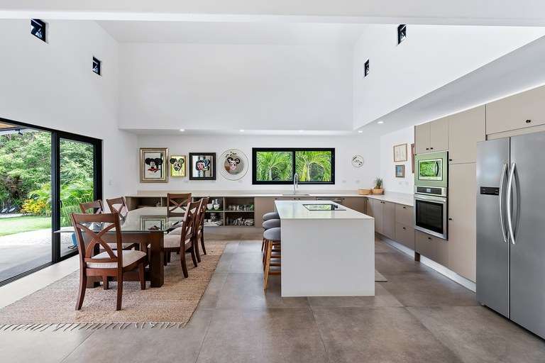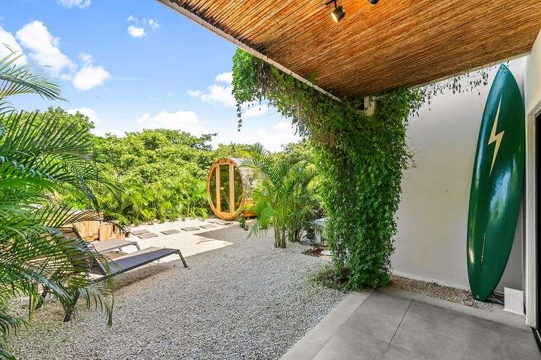 Nestled in Hacienda Pinilla's prestigious Reserva de Golf, this newly built (Nov 2022) luxury home offers 3,649 sq. ft. of air-conditioned living space on a private half-acre lot next to a seasonal stream. The elevated pad ensures optimal drainage, and a covered outdoor dining area inspired by Valencia overlooks a creek frequented by deer. Enjoy a newly installed sauna, cold plunge, and a 226 sq. ft. pool with a 477 sq. ft. covered patio. The layout is designed for both family living and rental potential, with space for a separate casita with its own entrance. A 103 sq. ft. garage adds convenience. The home backs onto an additional half-acre of unbuildable green space, providing over an acre of exclusive enjoyment. Residents have access to world-class surf spots, an 18-hole golf course, bike trails, a beach club, and the JW Marriott with five restaurants and the largest pool in Central America. Just 15 minutes from Playa Tamarindo and 1 hour from Liberia International Airport (LIR).