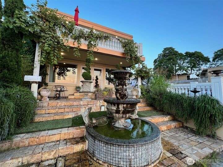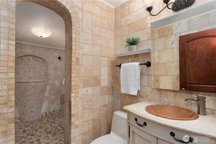 Amazing trophy property on the shores of Puget Sound, with protected views across the street from Weather Watch Park on Beach Drive. Reminiscent of an Italian Villa, this opulent stone manse presents a once-in-a-lifetime opportunity for lavish living. La Villa Rustica is a palatial residence w/marble floors & fireplace, overflowing with crystal chandeliers and golden flourishes. True chef’s kitchen with Viking gas range, refrigerator, microwave & dishwasher, classic cabinetry & granite counters, plus a built-in professional pizza oven. Main floor has office (or 3rd bedroom) w/bedroom suite with sandstone shower worthy of a Roman emperor. Upstairs can be a separate suite or an amazing primary suite with balcony and Puget Sound views