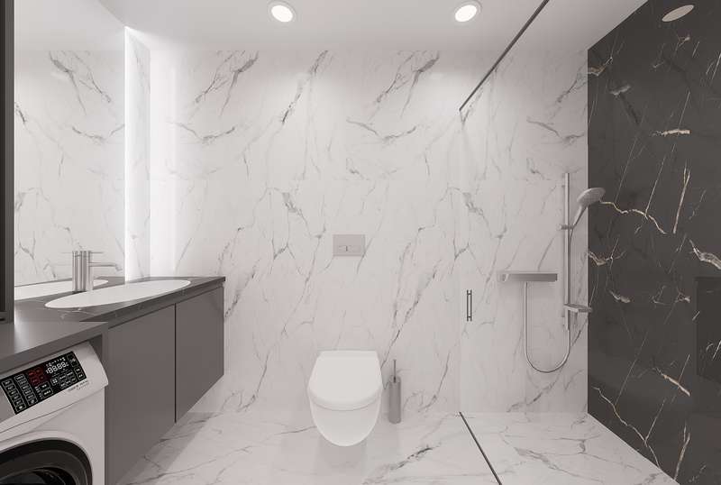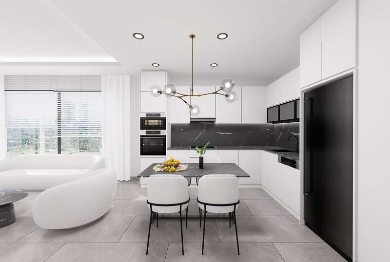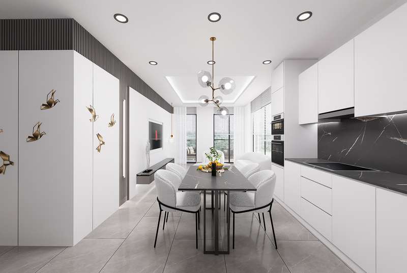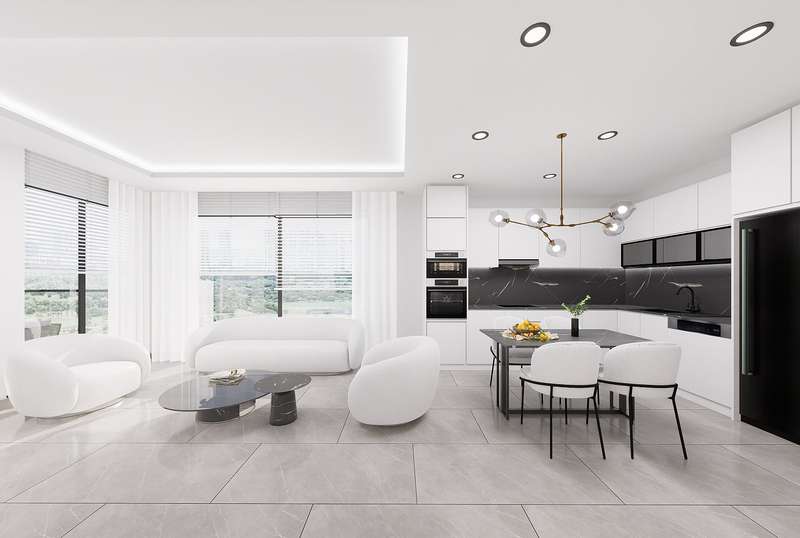 The properties are equipped with panoramic double glazing, suspended ceilings, spot and LED lighting, a steel outdoor door, MDF lacquered interior doors, ceramic flooring, erasable wall paint, lacquered kitchen cabinets, granite kitchen and bathroom countertops, high-quality sanitary ware, shower cabins, and underfloor heating in the bathrooms.
