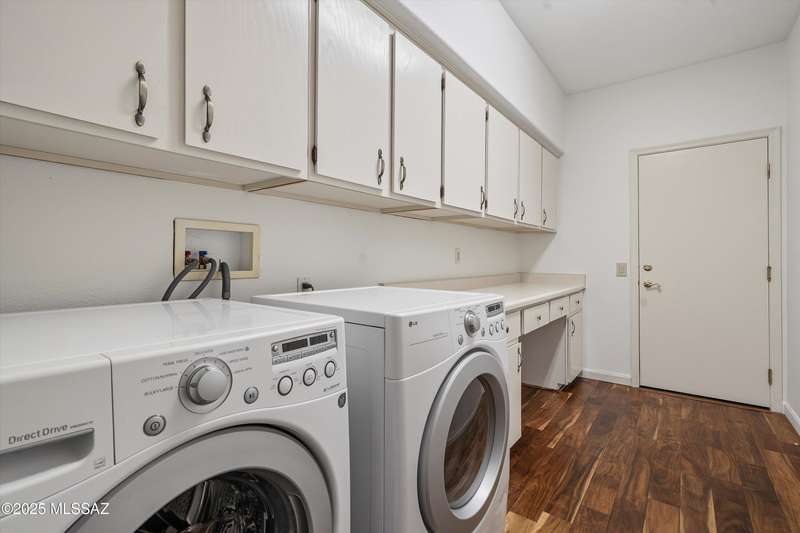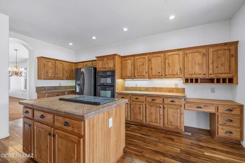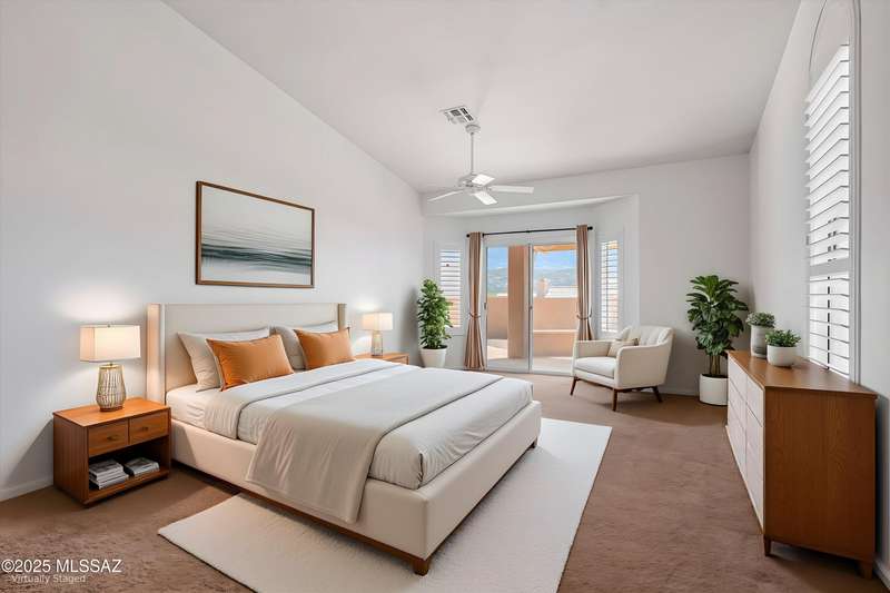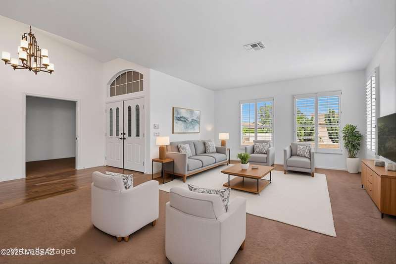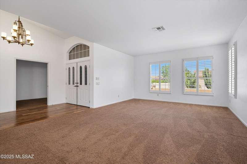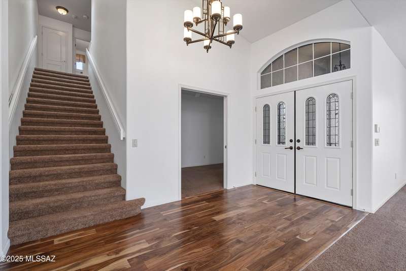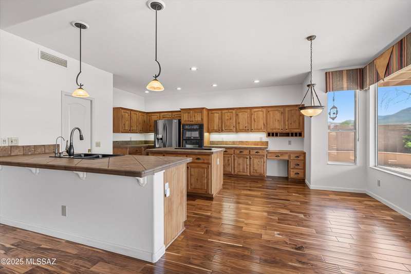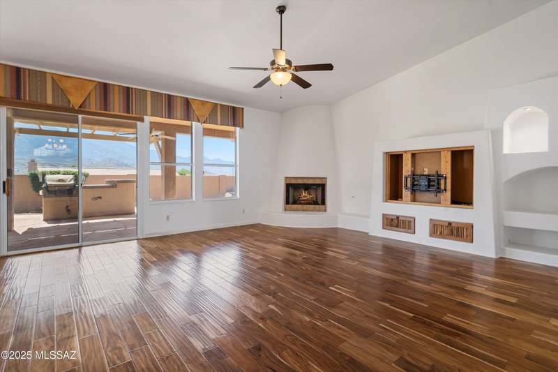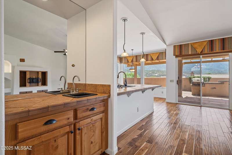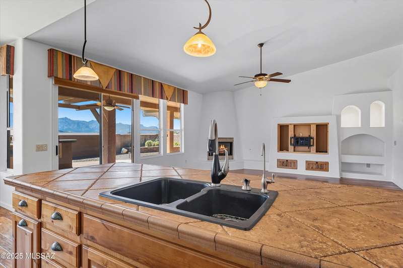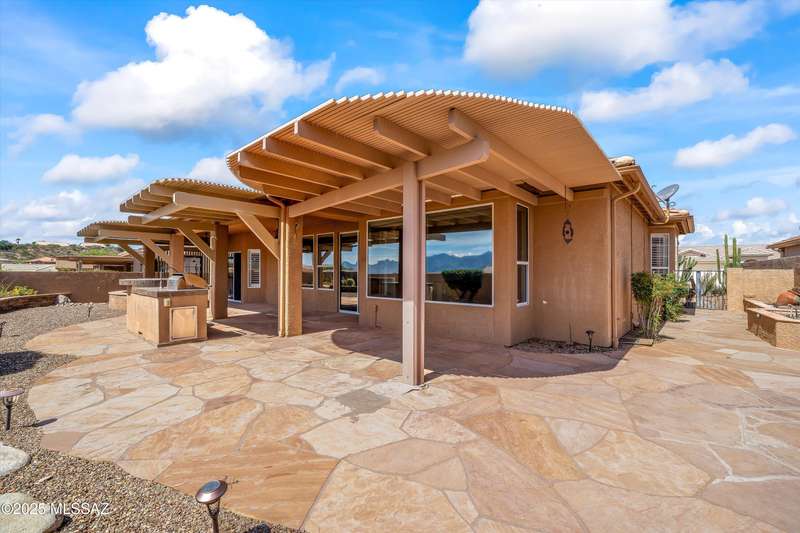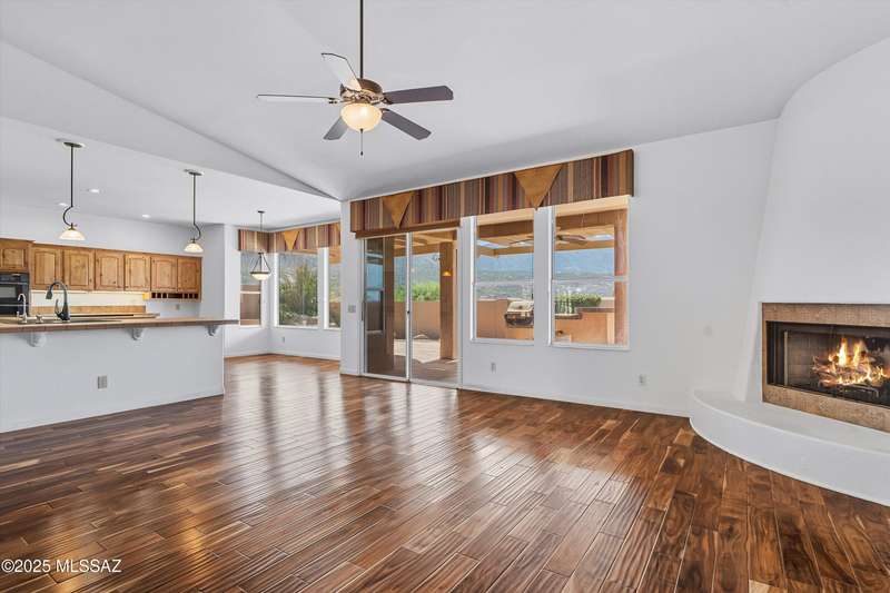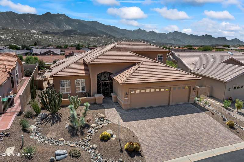 Double door entry welcomes you into this expansive residence, where elegant wood flooring guides you to breathtaking Catalina Mountain views. The generous gathering room and spacious formal dining area are perfectly suited for hosting guests. An island kitchen offers ample cabinetry and counter space while showcasing the stunning vistas. The open family room features a Kiva fireplace, ideal for cool SaddleBrooke evenings, and provides continuous mountain scenery. The owner's suite boasts an en-suite bath and patio access. Upstairs, a private casita presents two bedrooms and a full bath, offering an exceptional retreat for guests. Additional amenities include a conveniently located den, powder room, and a three-car garage.