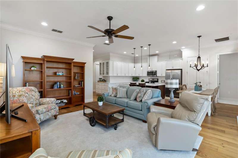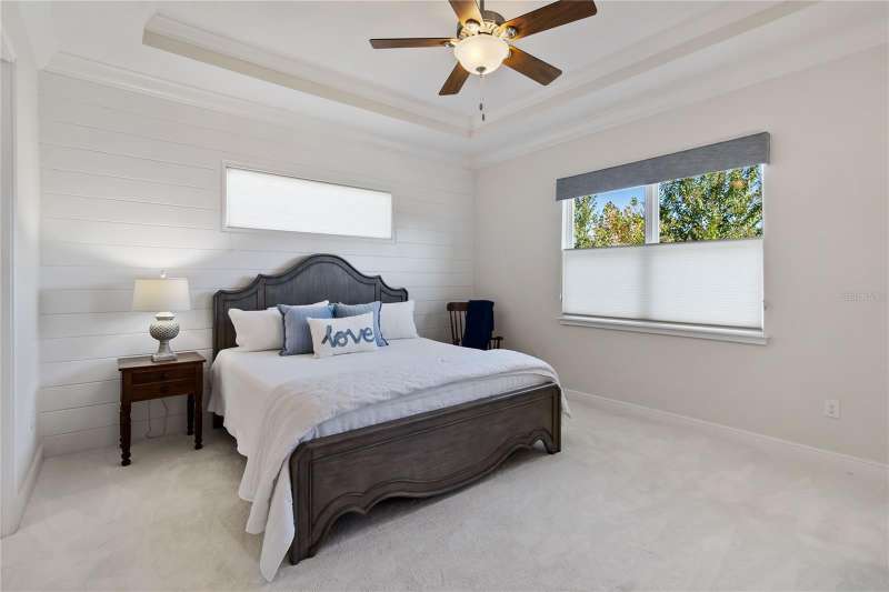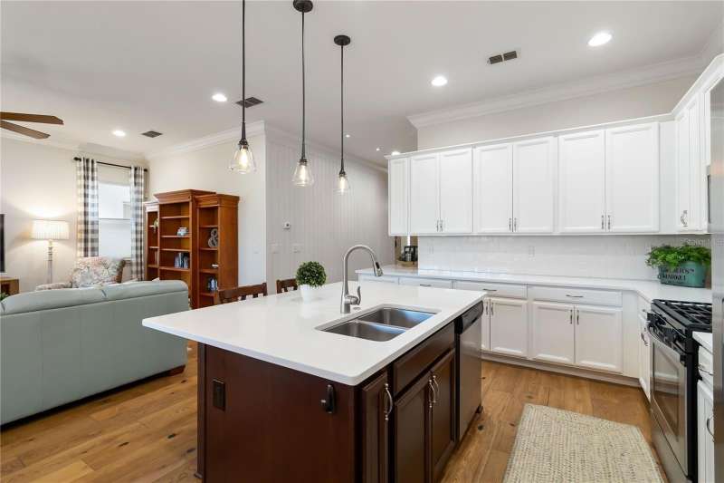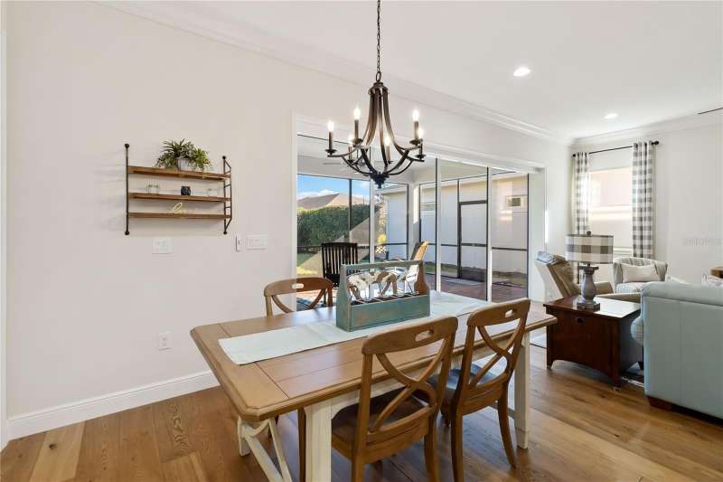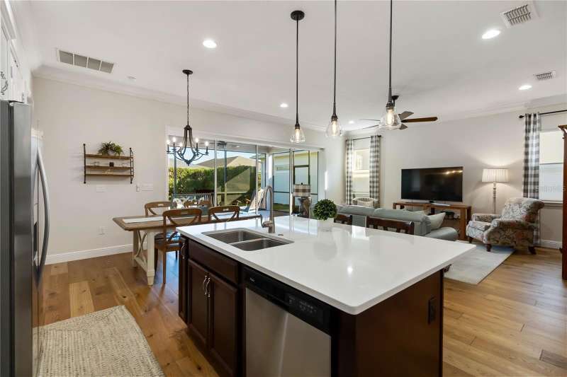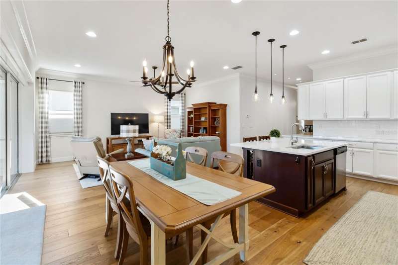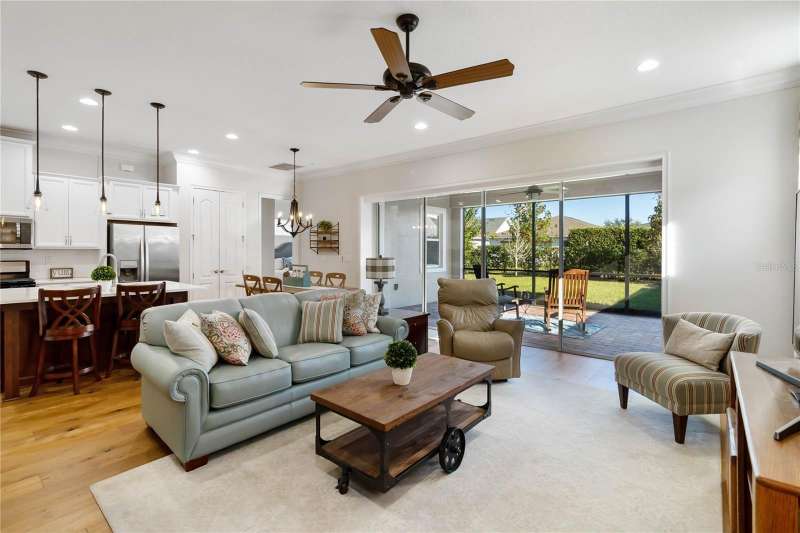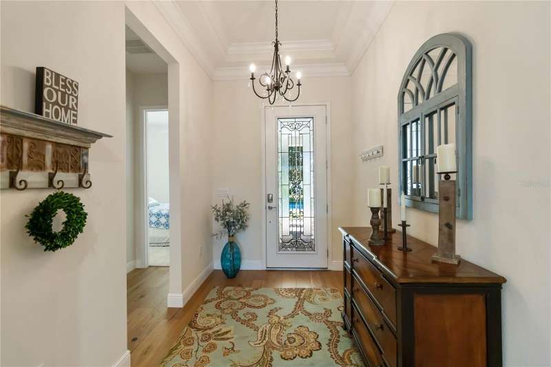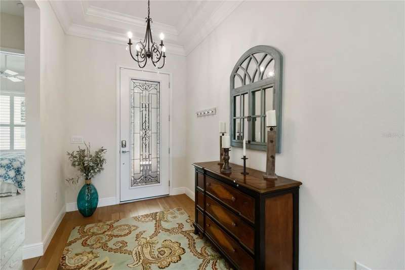 Immaculate and move-in ready, this stunning **3-bedroom, 2-bath Captiva floor plan** is located in the highly sought-after **Del Webb Twin Lakes 55+ active adult community**, just a short walk from the resort-style amenities. The inviting **foyer** features a custom glass door insert, elegant tray ceiling, and designer Immaculate like new 3 Bedroom 2 Bathrooms Captiva floor plan located in the well sought-after active Del Webb Twin Lakes 55+ community walking distance to the amenities. Foyer features custom glass door insert at front door, Custom tray ceiling and light. Whole house is professionally painted, beautiful hardwood flooring, Crown molding, Plantation Shutters & has great décor. Open and spacious Kitchen features upgraded light cabinets with crown molding, custom quartz countertops, pendant Lights, custom backsplash, some custom glassed in cabinet doors, large pantry. Living room ceiling fan and light, sliding glass doors with custom electric blinds lead to scenic screened Lanai, relax and enjoy the breeze with your professionally landscaped backyard. Master bedroom features plantation shutters, custom painted tray ceiling, Crown molding and French doors leading to Master bedroom bath and boasts a large walk-in tile shower with frameless glass doors, double shower heads, custom with built-in tile bench, quartz vanity and dual sinks. The 3rd bedroom features built-in cabinets and a desk that can convey the property. All closets have custom shelving to keep all your belongings nice and organized. Drop zone area with custom backsplash. Amenities include a Resort style pool and Lap Pool and 3rd pool on the carriage house side, 20,000 square foot Gorgeous Clubhouse, State of the art Fitness Center, Flex room, Tennis Courts, Putting Green, Walking Trails, Pickle Ball Court, Fishing, and Pontoon Boats and Jon boat to use on Live Oak Lake! The community has many active and socializing activities to keep you VERY busy!! All of this in a GREAT gated community located in Central Florida close to Lake Nona Medical City, Orlando, Orlando International Airport, Theme Parks, and Brevard Beaches! Do not delay making your appointment to view this home today.