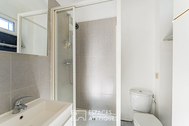 The living room, enhanced by high ceilings and large windows, enjoys pleasant natural light and a calming atmosphere. It includes a lounge area and an open-plan fitted kitchen, creating a harmonious and functional space. A bedroom and a shower room with toilet complete the apartment.