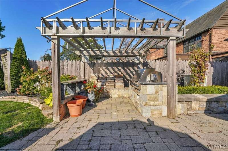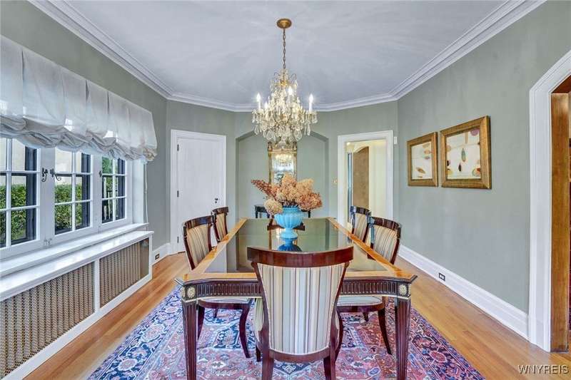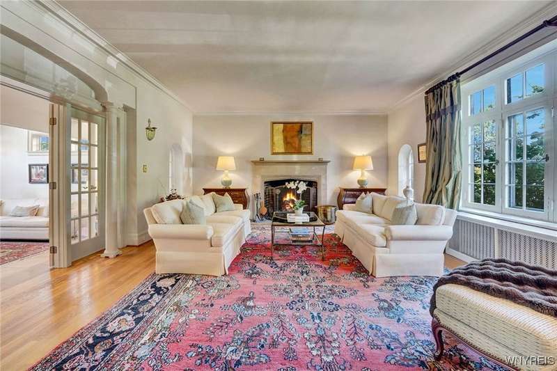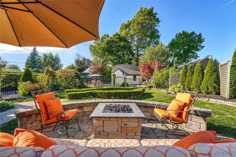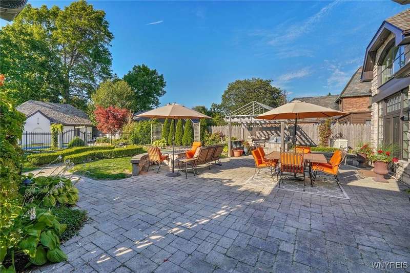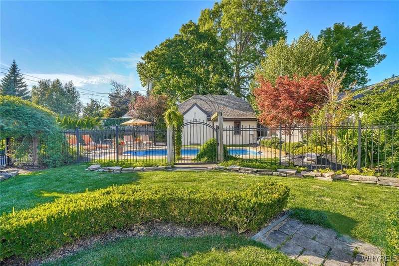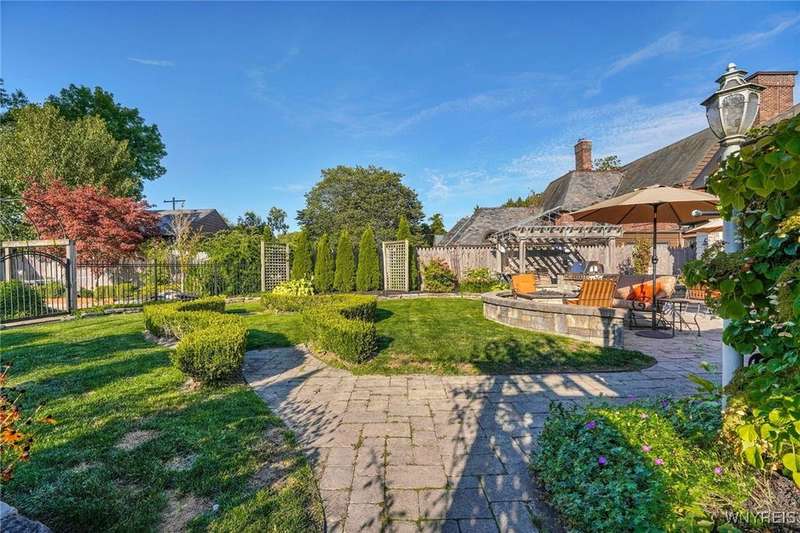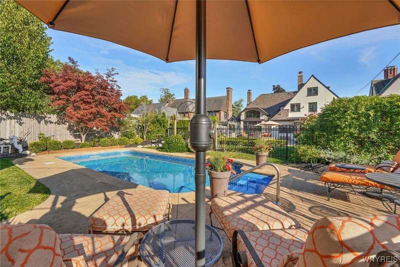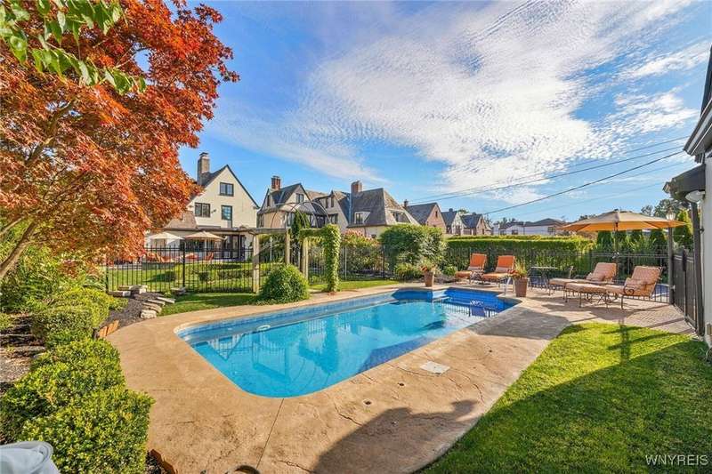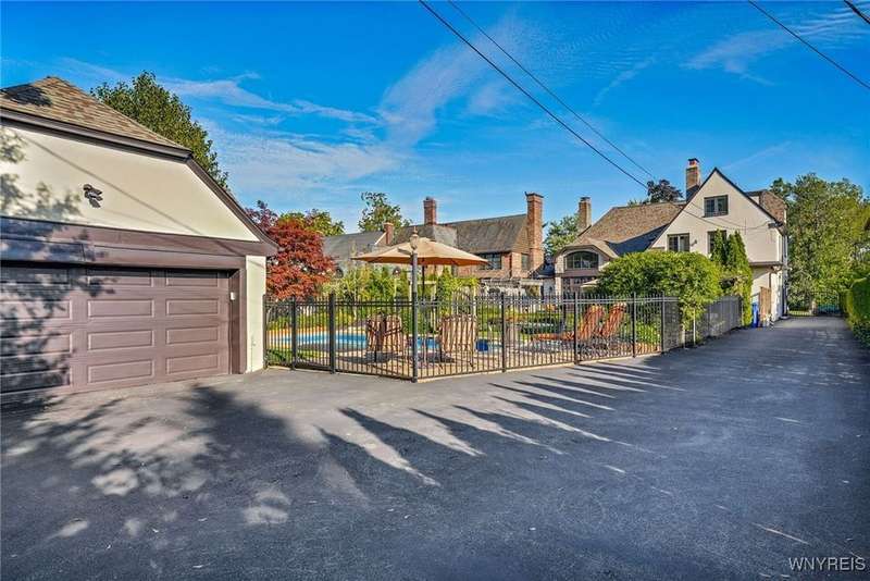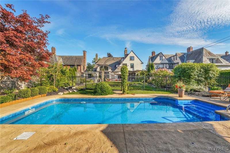 Timeless Elegance Meets Modern Luxury Across from Delaware Park at 81 Nottingham Terrace.Discover refined living in this stunning 4 bedroom, 3.5 bath Tudor estate, perfectly positioned across from Olmsted's historic Delaware Park. A seamless blend of classic architecture and contemporary upgrades, this home offers exceptional comfort and elegant style.The fully remodeled chef's kitchen is a showpiece, featuring premium appliances including a Sub-Zero refrigerator, Wolf range, Cove dishwasher, and a built-in coffee bar. Elegant Carrara marble countertops and a spacious island make it ideal for both cooking and entertaining. The kitchen opens to a bright breakfast room and offers a unique view into the climate-controlled wine cellar, which holds up to 1,000 bottles of wine.The formal dining room, adorned with its original chandelier, flows into a grand foyer. A spacious living room centers around a striking woodburning limestone fireplace, while the large modern family room features radiant heated floors and a loft above. French doors lead to a private courtyard patio, perfect for relaxing or hosting guests. The distinguished library/study offers warmth and character with a wood-burning fireplace and custom built-in bookshelves. Original hardwood floors and incredible woodwork throughout. Gorgeous staircases show the charm and character of this exquisite home. Upstairs, the luxurious primary suite includes three closets and a spa-inspired ensuite bath. The second bedroom opens to a Juliet balcony, and the third bedroom features a generous walk-in closet. The third-floor bedroom includes an additional full bathroom, ideal for guests or a private retreat.Outdoor living is equally impressive?enjoy a saltwater inground pool, a stone fire pit for cozy evenings, grilling area designed for effortless entertaining. Fully fenced electronic gated yard with sprinkler system. Updates include roof, boiler system ($30,000), Generac generator, and much more. This exceptional home combines historic charm, modern amenities, and resort-style outdoor living in one of Buffalo's most coveted neighborhoods.