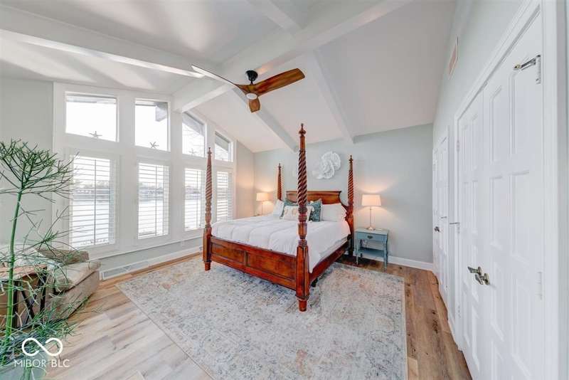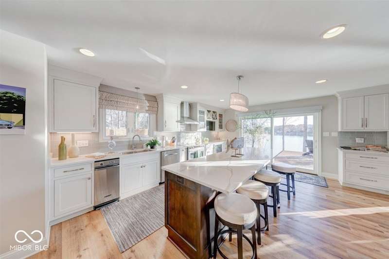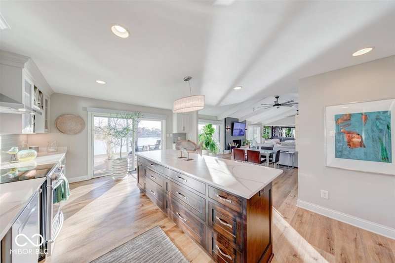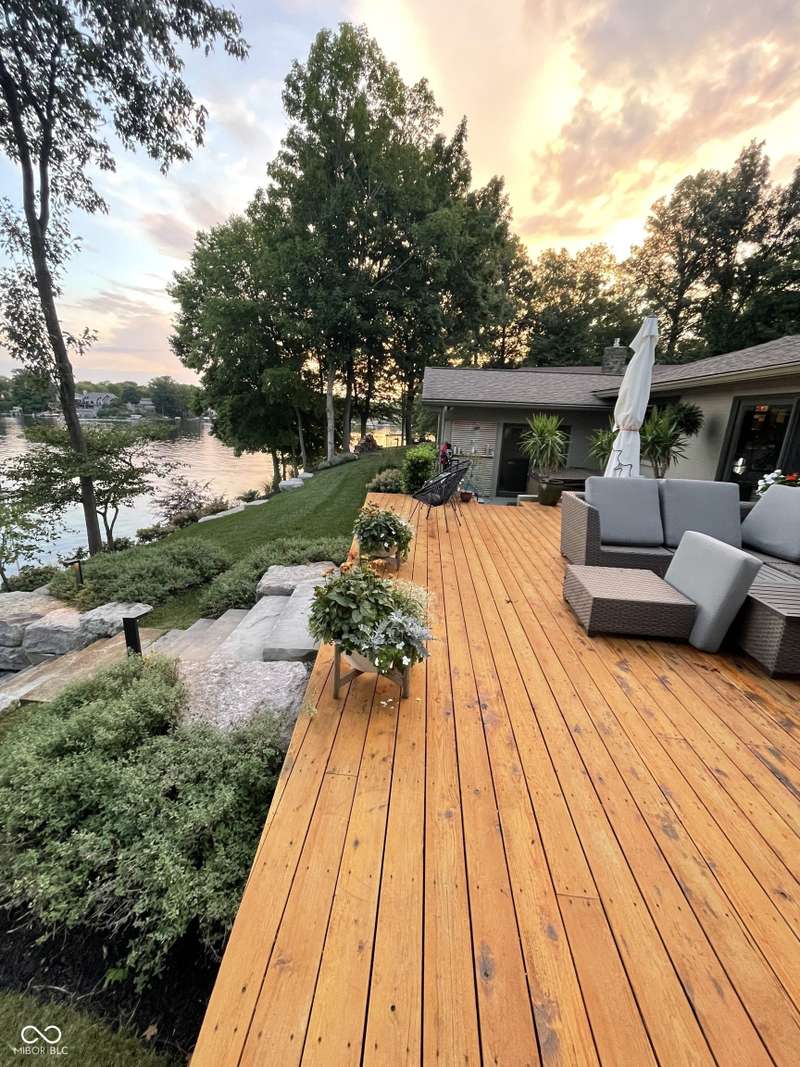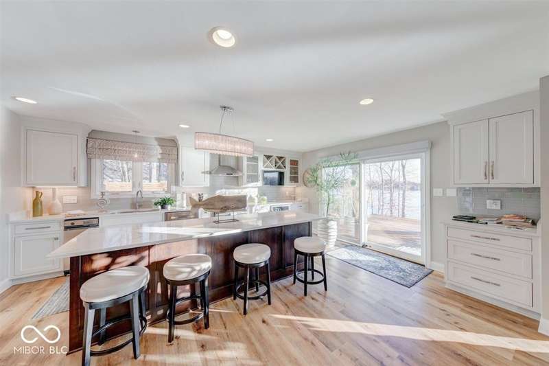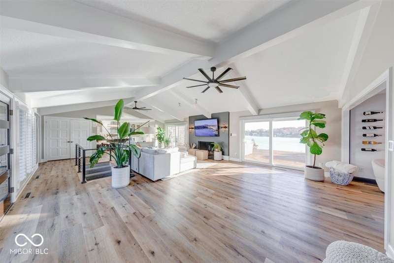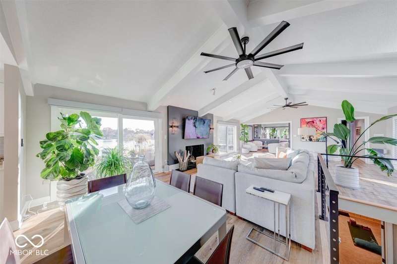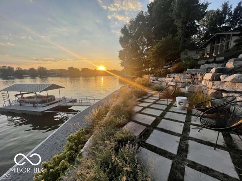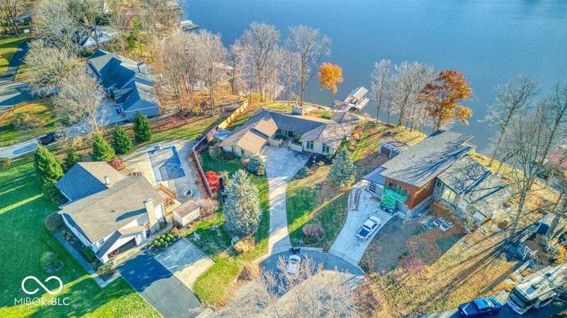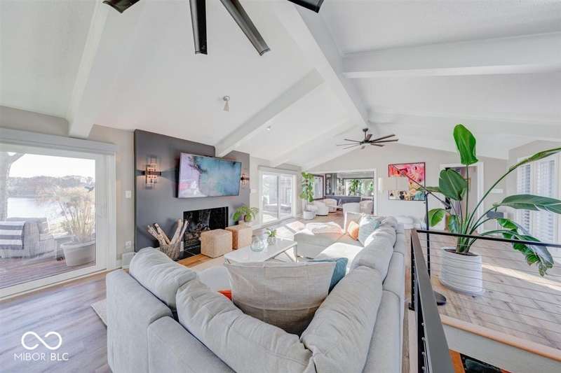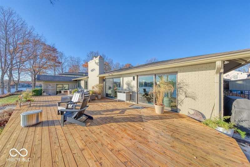Experience the best of lakefront living in Noblesville, Indiana with this stunning $1.4M California-modern ranch home on Morse Reservoir. Perched atop the coveted North Harbour shoreline, the home commands panoramic sunset views over the quiet waters of Morse Reservoir's sailing basin. Enjoy the peace of living in the no-wake zone with quick access to fast water from your 115-frontage foot shoreline, restored metal-roof boat dock and a newly-placed steel pile shore wall for carefree, scenic enjoyment. Beautifully remodeled inside and out, this 3-4 bedroom, 2.5 bath residence celebrates its unique 1970 California ranch character while incorporating high-end updates. Standout features include: Expansive 1,000 sq ft cedar deck for spectacular entertaining and relaxation, Outdoor shower and Jacuzzi spa just off the primary bedroom suite, Fully reimagined kitchen with custom Amish cabinetry (2017), and luxury vinyl plank flooring throughout (2022), Generous concrete driveway, fenced dog run, upscaled landscape lighting, and refreshed windows and doors for comfort and curb appeal. Enter through a welcoming courtyard with gates and enjoy seamless indoor-outdoor living for gatherings or quiet nights overlooking the water. The 2021 landscape transformation designed by Vive Landscapes and constructed by RK Excavation adds the finishing touch, complemented by a large deck for soaking in the serene setting. This meticulously maintained home is perfect for those seeking peaceful full-time residency or a luxurious weekend retreat in Hamilton County's premier lake community. See supplemental information for even more upgrades and features. Don't miss out on the BEST property on Morse Reservoir!
