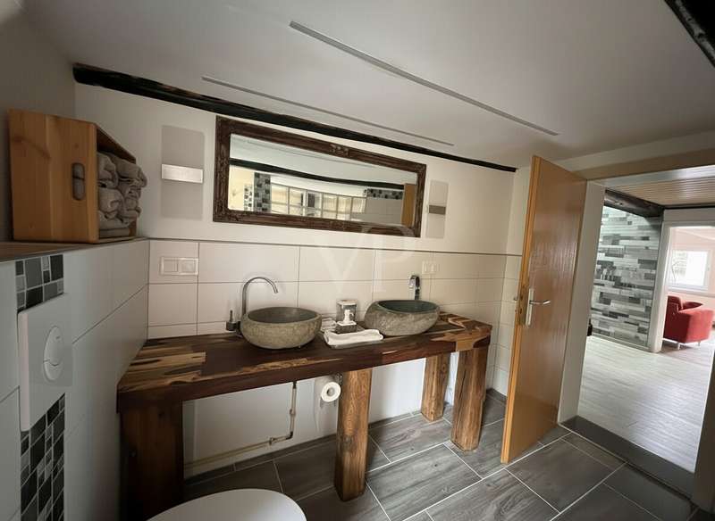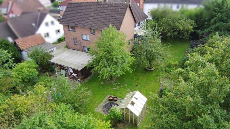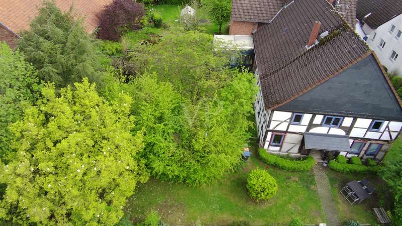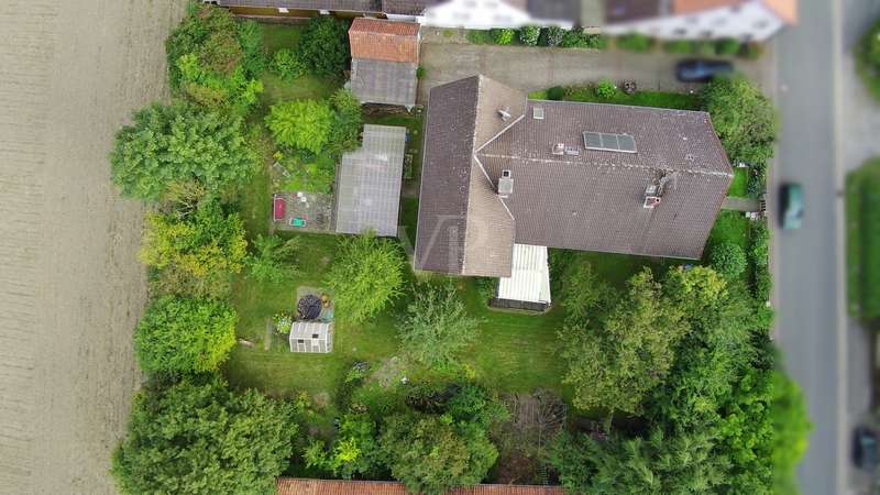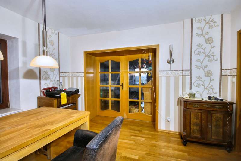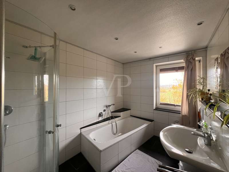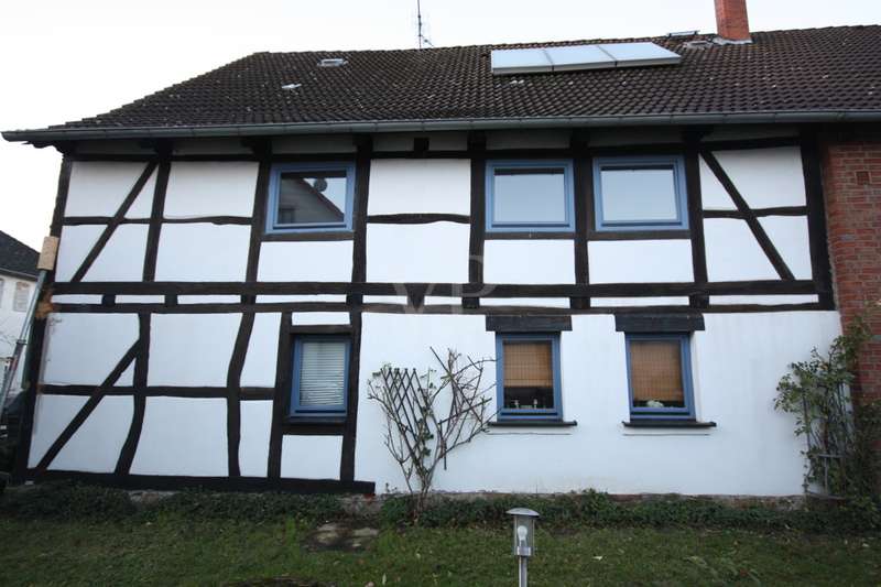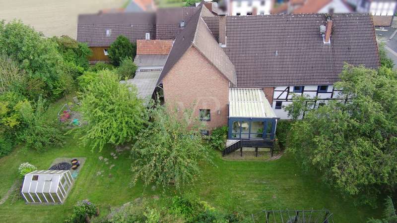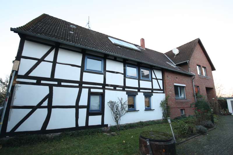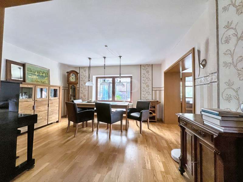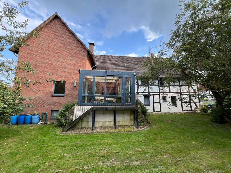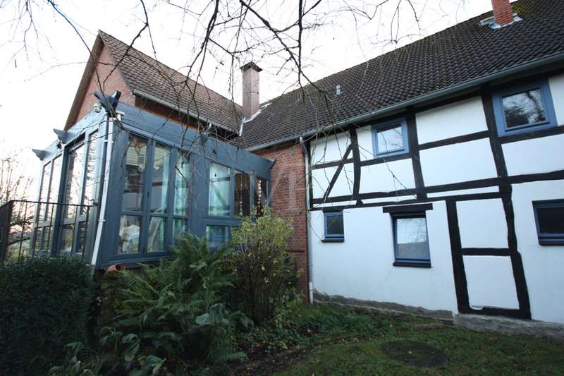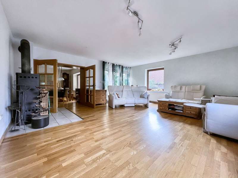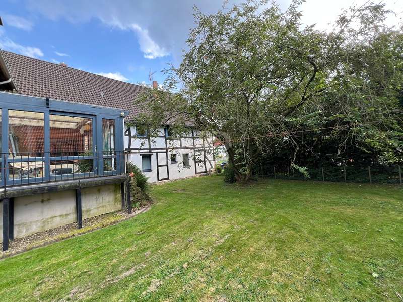 Welcome to an exceptional opportunity to acquire a modernized property in an attractive location on the edge of a field. This special house harmoniously combines two parts of the building and offers an exceptional living space of approx. 389 m² on a generous plot of approx. 1,976 m². Ideal for anyone who values a variety of spaces, individuality and tranquillity. Ideal for a multi-generational home or a large family with plenty of space. The property consists of a half-timbered house with approx. 176 m² of living space and an adjoining, brick-built solid house from 1986 with approx. 213 m². Both parts of the building have been continuously maintained over the years and extensively modernized in 2021, so that today you can expect contemporary furnishings and a spacious ambience. With a total of 11 well-designed rooms, including 5 spacious bedrooms, the house offers numerous design options for families, multi-generational living, the combination of living and working or the realization of individual life plans. Three modernized bathrooms ensure comfort and flexibility, especially in everyday family life. The heart of the house is the spacious, open-plan living area, which invites you to linger and offers a view of the large garden thanks to the large windows. There is a spacious hobby room in the rear garden area, which was designed as a garden shed and can be used in a variety of ways - for example as a studio, workshop or retreat for hobbies. The furnishings of the house correspond to classic living quality. The bathrooms were brought up to a contemporary standard in the course of modernization, and central heating and a stove provide cosy warmth on cooler days. This is complemented by a solar thermal system for environmentally friendly water heating and an efficient oil-fired central heating system. The typical pitched roof underlines the traditional character of the building. The property includes a double garage, which offers space for two vehicles as well as additional storage space. Outside, the property has its own garden irrigation well, which makes it easy to maintain the spacious garden. Among other things, the garden has a garden pond - a highlight for nature lovers. The location on the quiet edge of the field guarantees you relaxation and privacy without having to forego the convenience of good infrastructural connections. Shopping facilities, schools and public transport are all within easy reach. We expressly point out that the owner does not want any personal inquiries and therefore we ask you to accept the privacy. Please also understand that we would like to receive the property-related financing confirmation from your bank before a possible viewing.