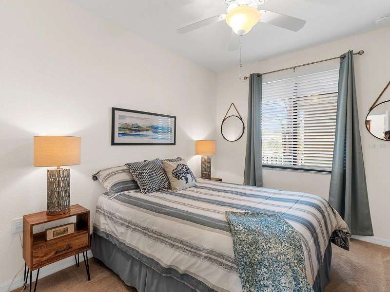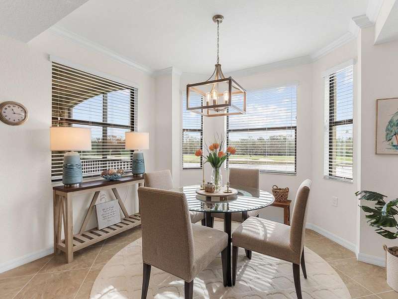 NOW UNDER $300,000! This one of the most AFFORDABLE CONDOS in Lakewood National and is offered FULLY FURNISHED and with full GOLF MEMBERSHIP for the larger size unit! Don't miss this incredible opportunity! Overlooking the 11th hole of the Commander golf course at Lakewood National, sits this charming and FURNISHED Birkdale floor plan condo. With 2 bedrooms and 2 full bathrooms, and boasting both beautiful lake and serene golf course views, this unit is perfect for those looking to "right-size", for a seasonal home, or an investment opportunity with 30-day rentals allowed. Included in your HOA dues is membership to Lakewood National, allowing you to take advantage of the resort-style amenities including two 18-hole championship golf courses, the Piper and Commander, both designed by Arnold Palmer. Also included is access to the grand clubhouses, resort-style pool, 8 tennis courts, 4 pickleball courts, fitness center, spa, restaurant, and more. You almost never need to leave the neighborhood! This unit includes a covered carport parking space, and easy access via the stairs or building elevator to the second level which is perfectly positioned to take in the views. The interior is graced by large format tile flooring, crown molding, an open floor plan, and impressive southern exposure views. The great room is centrally located with remote-controlled blind and sliding glass doors to the private, screened in, paver balcony overlooking the lake and golf course. The kitchen is outfitted with abundant solid wood cabinetry that reaches to the ceiling, 2024 rechargeable undercabinet lighting, central island with counter-height seating, granite counters, and stainless-steel appliance suite. The dining room offers large bay-style windows to take in the views, and enough space to even add a small desk for more functional space. Enjoy enhanced style with 2022 kitchen pendant lights and 2022 dining room chandelier. The primary suite has plush carpeting, large walk-in closet, and en-suite bathroom with walk-in shower. The guest bedroom is equally as comfortable with an adjacent full bathroom. Peace of mind is secured with impact windows and doors throughout, easy "lock and leave" living, 2024 rechargeable motion sensor light at the front door, surge protection and large storage room outside of your unit just for you. Included in the Lakewood National condo dues are cable, internet, water, sewer, building maintenance, pest control, elevator, and an exclusive pool located just steps away for convenience. Lakewood National is one of the area’s premier gated communities for elevated, resort-style living. Lakewood Ranch, the top multi-generational community in the country for seven years in a row with plentiful shopping, dining, A-rated schools, parks, and nearby beaches.