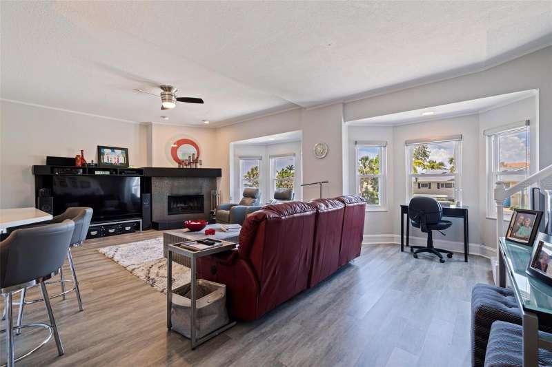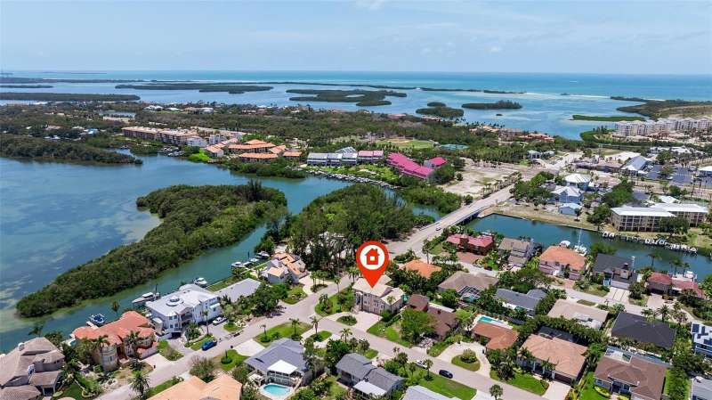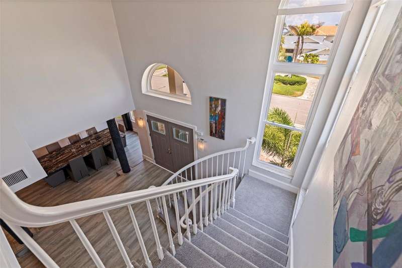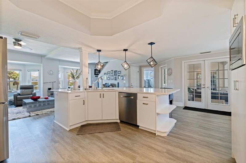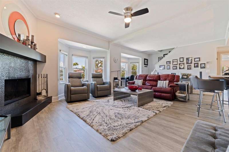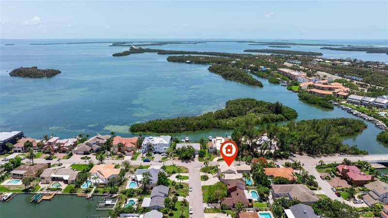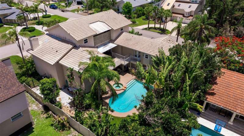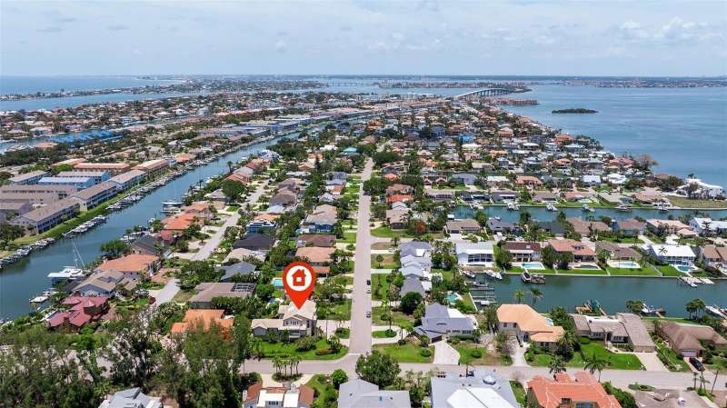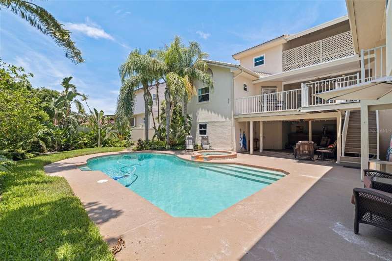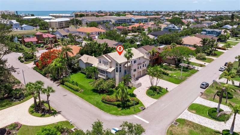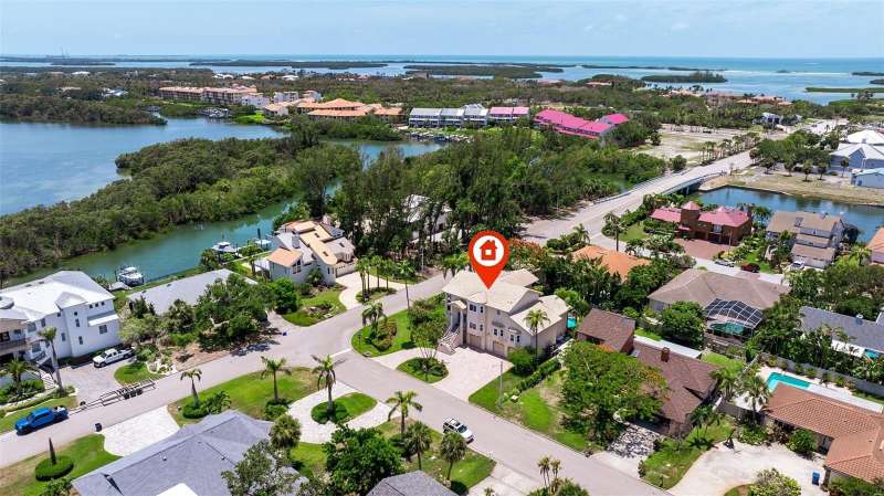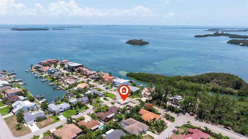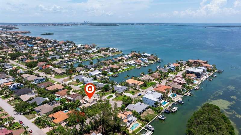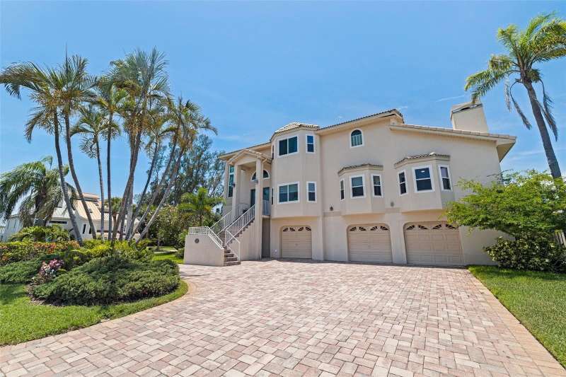 ISLAND LIVING ON AN OVERSIZED CORNER LOT!! This expansive, four-bedroom elevated residence offers generous living and entertaining spaces, set on a rare oversized corner lot in a sought-after island community. While not waterfront, the upper levels reveal partial views of Tampa Bay, enjoyed from the new high impact windows and multiple vantage points throughout the home. As you arrive, the oversized circular paved driveway welcomes you home. Ascend the elegant front staircase to the newly installed high-impact rated front door, a great entry point leads into a contemporary, sunlit, open floor plan featuring high ceilings. Thoughtful interior flow seamlessly connecting your formal dining room, spacious living area, and an elegantly freshly updated kitchen with white cabinetry, quartz countertops, pull-out drawers, and new stainless appliances. Large island allows for comfortable breakfast bar seating. The adjoining family room, with its cozy wood-burning fireplace and new window treatments, flows seamlessly to the relaxing outdoor balcony overlooking the lushly landscaped yard and oversize pool. The main level includes a guest bedroom (or office) with adjacent full bath, while the oversized primary suite boasts balcony access, a generous walk-in closet, and a spa-inspired bath with Jacuzzi tub and large walk-in shower. Upstairs, you’ll find two additional bedrooms with its own closets, a full bath, and a secondary living area—ideal for lounging, watching tv or use as a game room. Beautiful views or Tampa Bay from the top floor! The ground floor offers over 2300sf of an impressive multi-car garage with workshop, bonus room, and direct access to the pool with spa and shaded patio, creating a perfect space for hobbies or entertaining. Ideally located just 15 minutes from downtown St. Petersburg and close to award-winning beaches and dining, this beautifully maintained home offers the space, flexibility, and lifestyle of true island living.