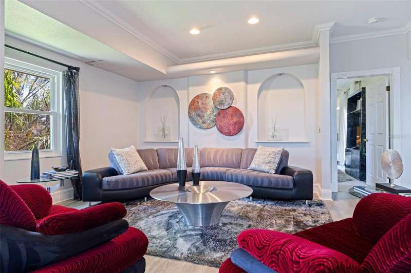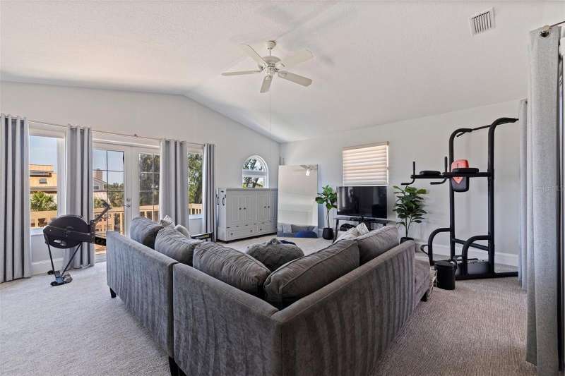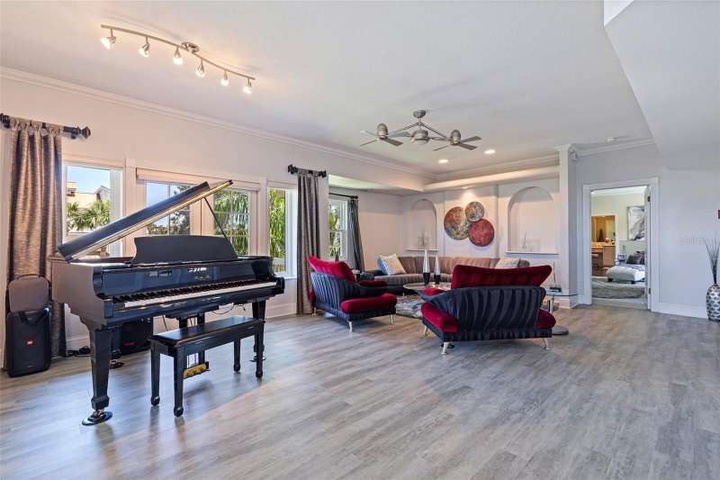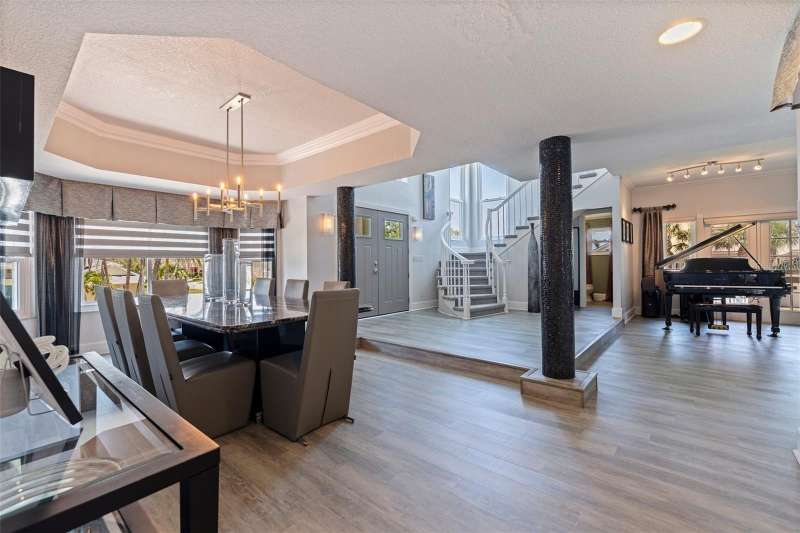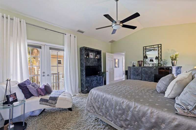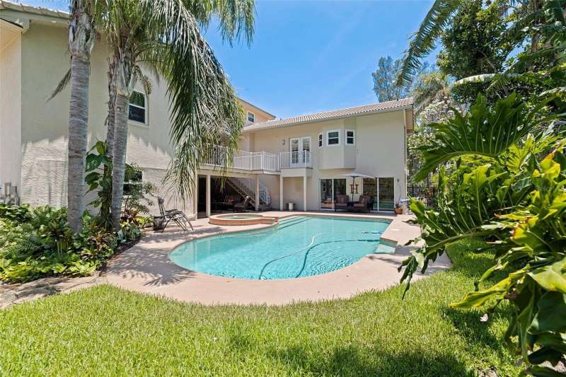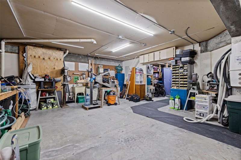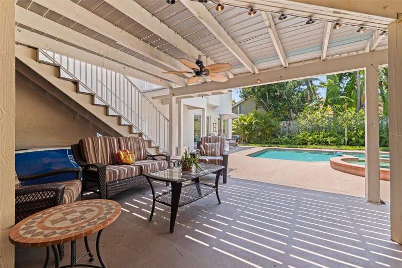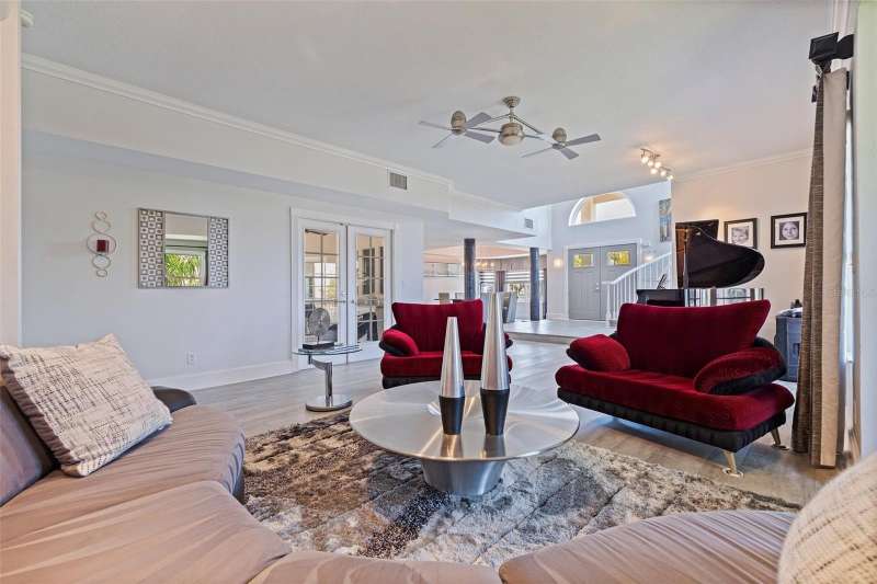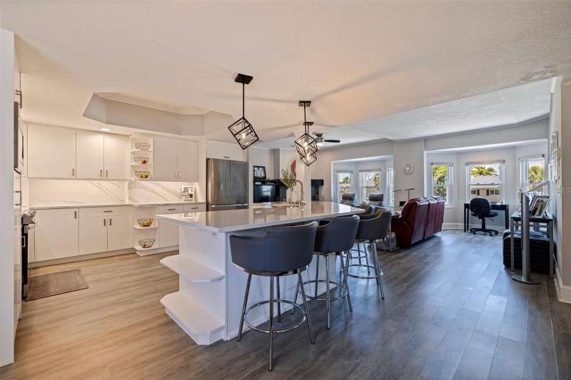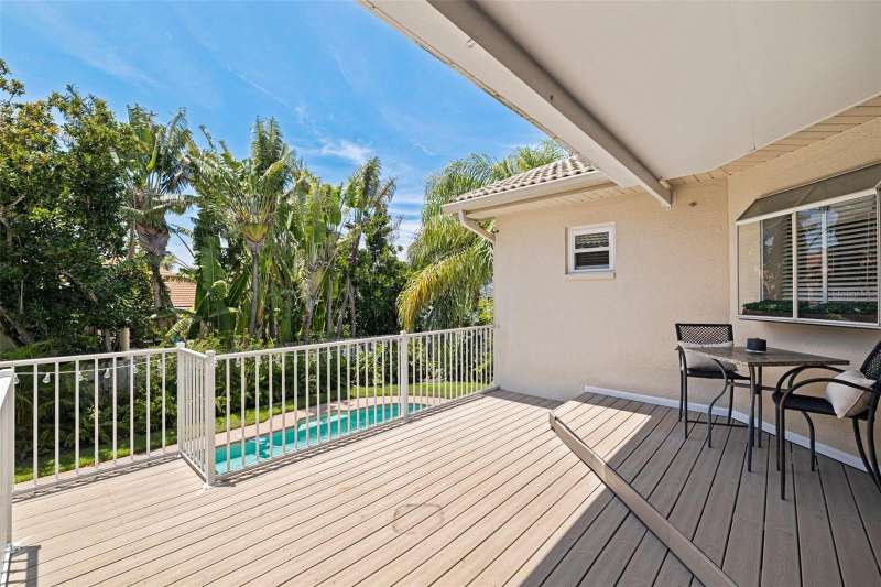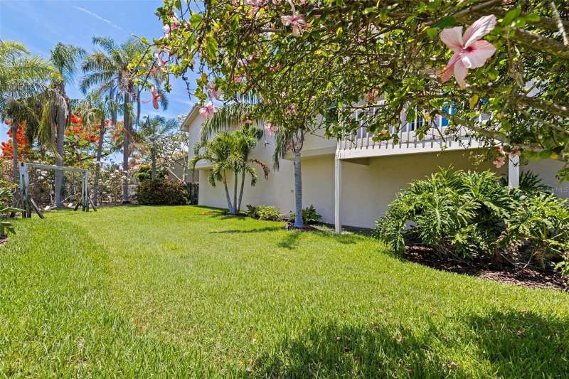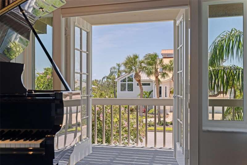 ISLAND LIVING ON AN OVERSIZED CORNER LOT!! This expansive, four-bedroom elevated residence offers generous living and entertaining spaces, set on a rare oversized corner lot in a sought-after island community. While not waterfront, the upper levels reveal partial views of Tampa Bay, enjoyed from the new high impact windows and multiple vantage points throughout the home. As you arrive, the oversized circular paved driveway welcomes you home. Ascend the elegant front staircase to the newly installed high-impact rated front door, a great entry point leads into a contemporary, sunlit, open floor plan featuring high ceilings. Thoughtful interior flow seamlessly connecting your formal dining room, spacious living area, and an elegantly freshly updated kitchen with white cabinetry, quartz countertops, pull-out drawers, and new stainless appliances. Large island allows for comfortable breakfast bar seating. The adjoining family room, with its cozy wood-burning fireplace and new window treatments, flows seamlessly to the relaxing outdoor balcony overlooking the lushly landscaped yard and oversize pool. The main level includes a guest bedroom (or office) with adjacent full bath, while the oversized primary suite boasts balcony access, a generous walk-in closet, and a spa-inspired bath with Jacuzzi tub and large walk-in shower. Upstairs, you’ll find two additional bedrooms with its own closets, a full bath, and a secondary living area—ideal for lounging, watching tv or use as a game room. Beautiful views or Tampa Bay from the top floor! The ground floor offers over 2300sf of an impressive multi-car garage with workshop, bonus room, and direct access to the pool with spa and shaded patio, creating a perfect space for hobbies or entertaining. Ideally located just 15 minutes from downtown St. Petersburg and close to award-winning beaches and dining, this beautifully maintained home offers the space, flexibility, and lifestyle of true island living.