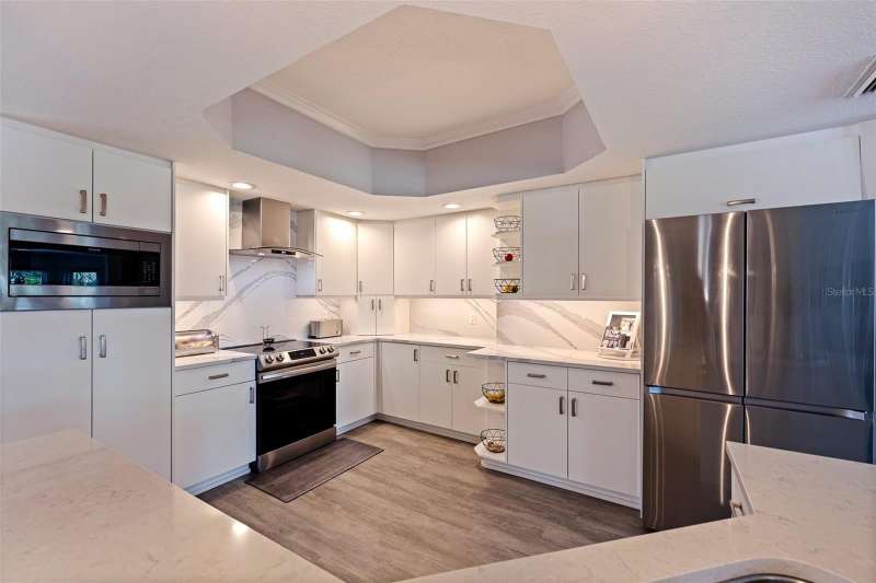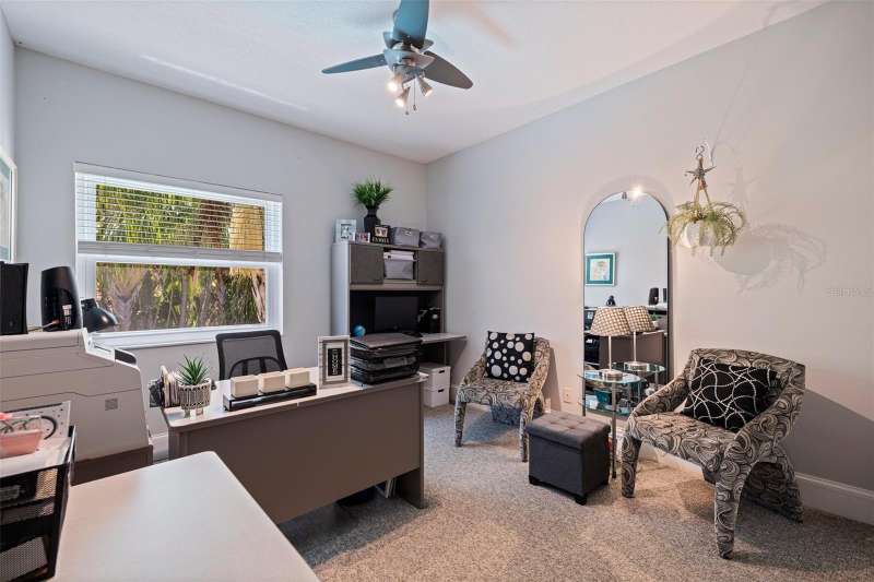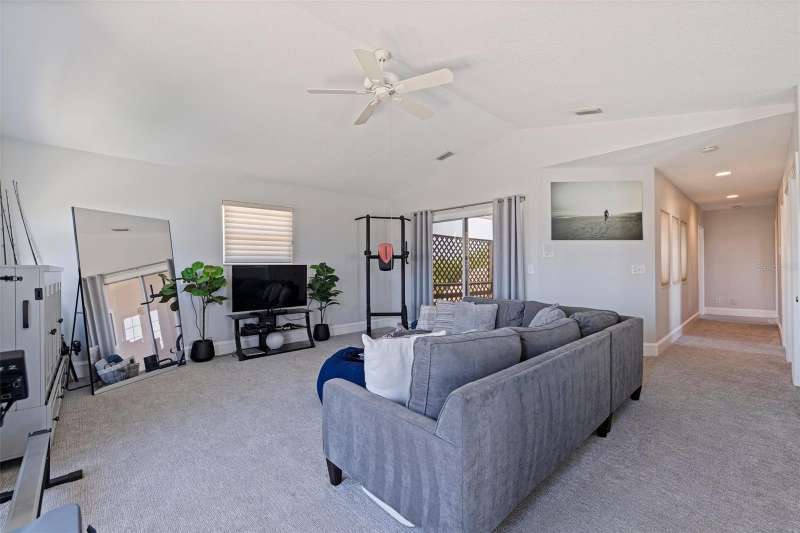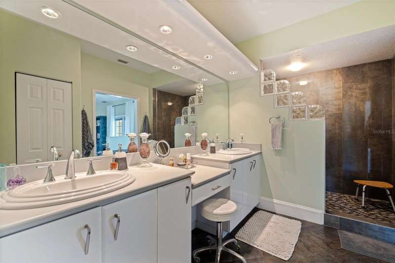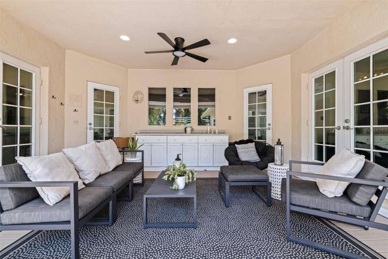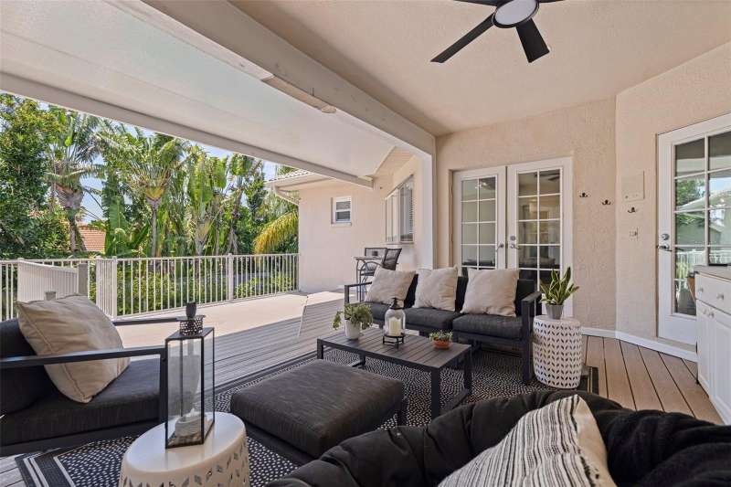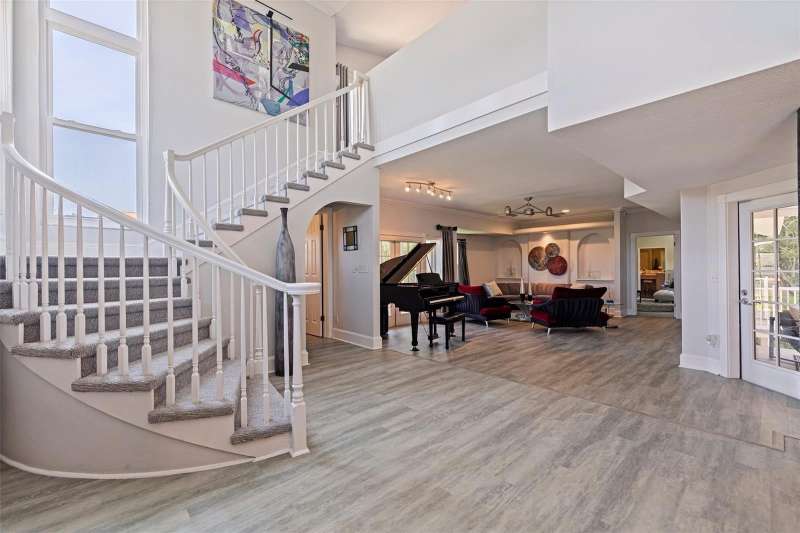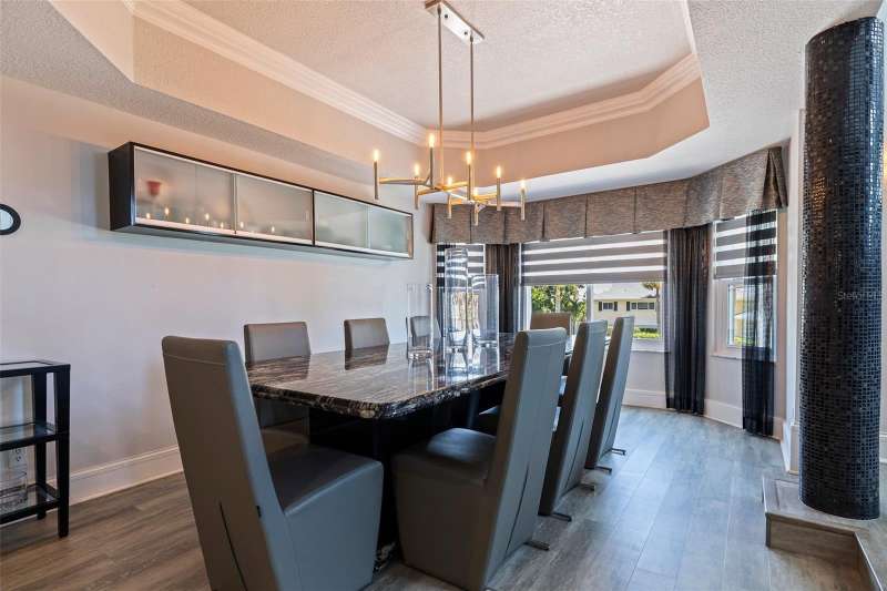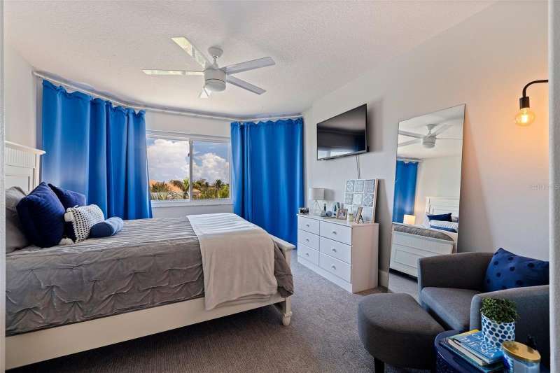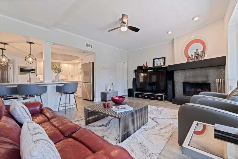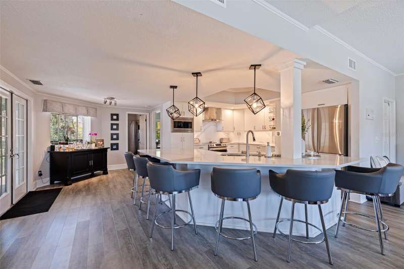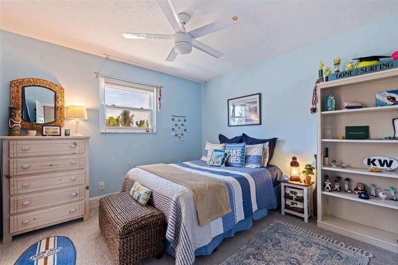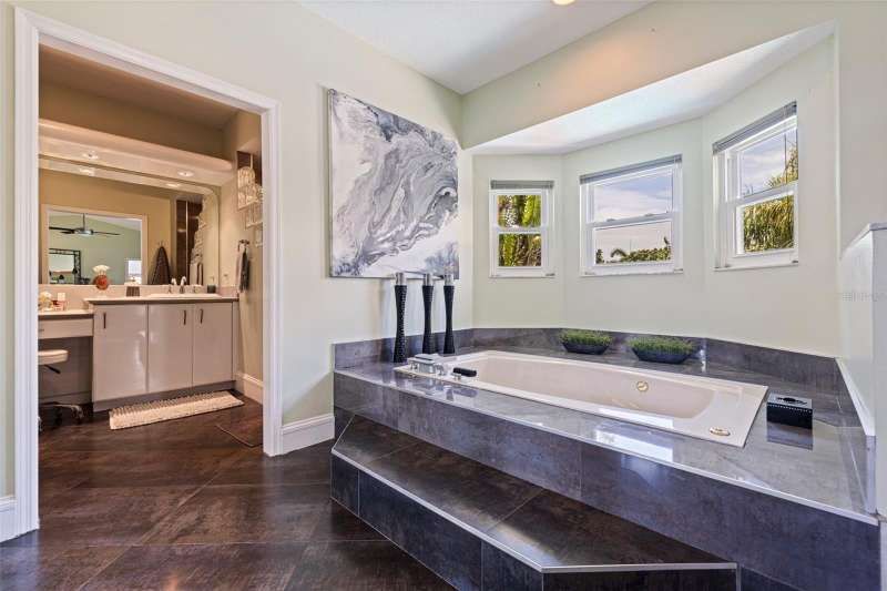 ISLAND LIVING ON AN OVERSIZED CORNER LOT!! This expansive, four-bedroom elevated residence offers generous living and entertaining spaces, set on a rare oversized corner lot in a sought-after island community. While not waterfront, the upper levels reveal partial views of Tampa Bay, enjoyed from the new high impact windows and multiple vantage points throughout the home. As you arrive, the oversized circular paved driveway welcomes you home. Ascend the elegant front staircase to the newly installed high-impact rated front door, a great entry point leads into a contemporary, sunlit, open floor plan featuring high ceilings. Thoughtful interior flow seamlessly connecting your formal dining room, spacious living area, and an elegantly freshly updated kitchen with white cabinetry, quartz countertops, pull-out drawers, and new stainless appliances. Large island allows for comfortable breakfast bar seating. The adjoining family room, with its cozy wood-burning fireplace and new window treatments, flows seamlessly to the relaxing outdoor balcony overlooking the lushly landscaped yard and oversize pool. The main level includes a guest bedroom (or office) with adjacent full bath, while the oversized primary suite boasts balcony access, a generous walk-in closet, and a spa-inspired bath with Jacuzzi tub and large walk-in shower. Upstairs, you’ll find two additional bedrooms with its own closets, a full bath, and a secondary living area—ideal for lounging, watching tv or use as a game room. Beautiful views or Tampa Bay from the top floor! The ground floor offers over 2300sf of an impressive multi-car garage with workshop, bonus room, and direct access to the pool with spa and shaded patio, creating a perfect space for hobbies or entertaining. Ideally located just 15 minutes from downtown St. Petersburg and close to award-winning beaches and dining, this beautifully maintained home offers the space, flexibility, and lifestyle of true island living.