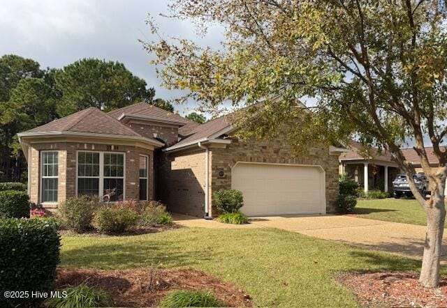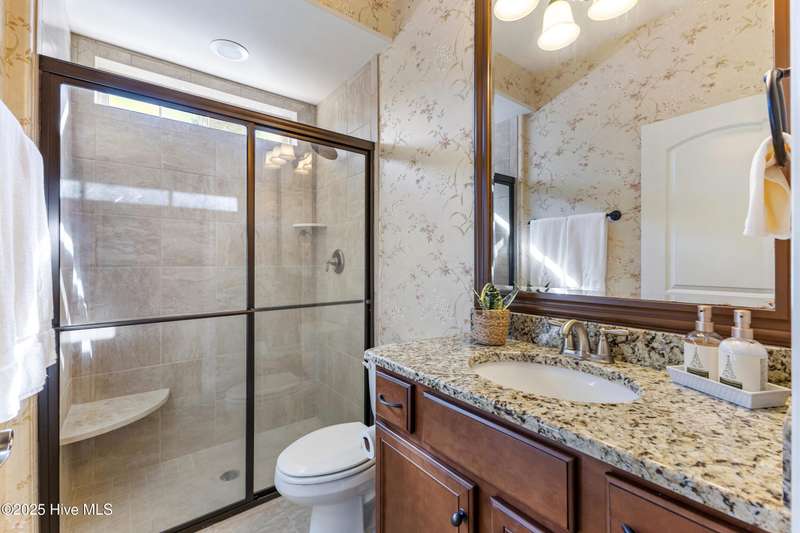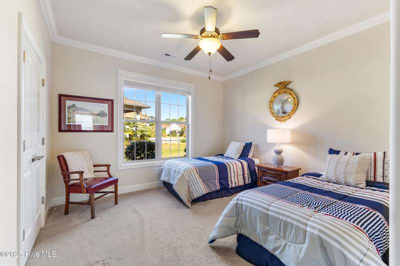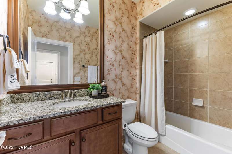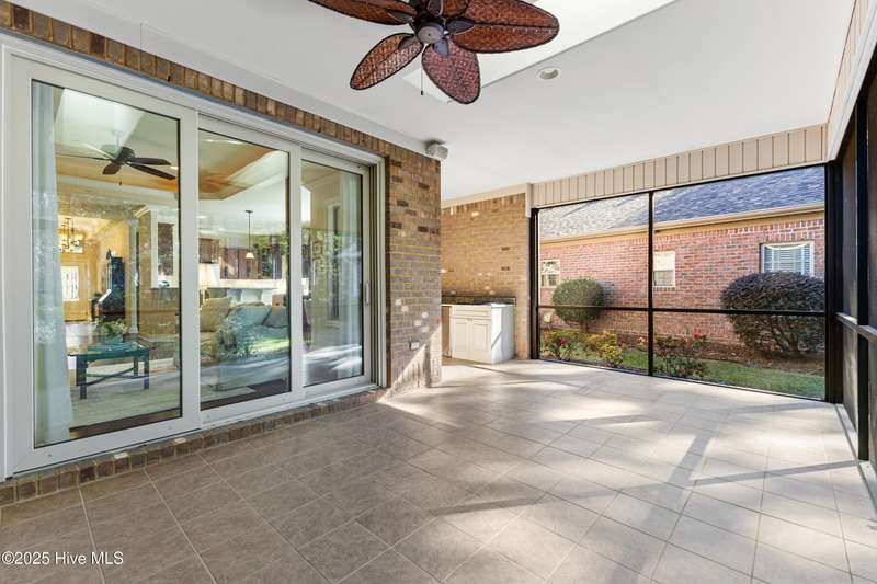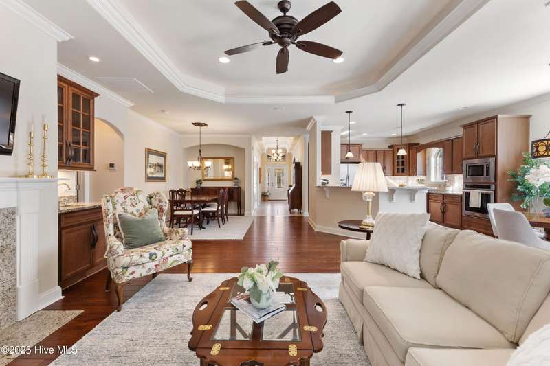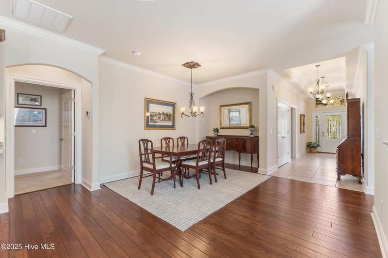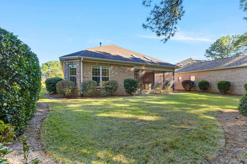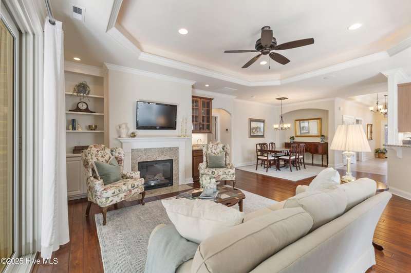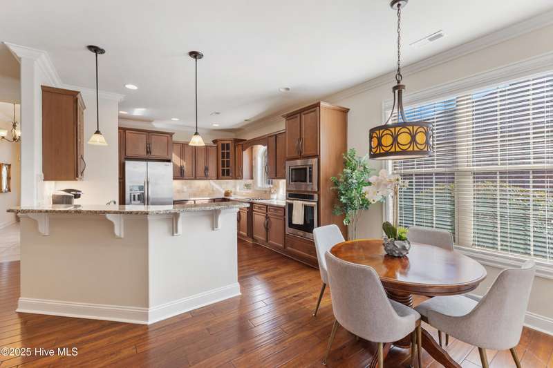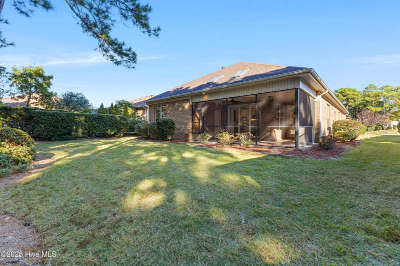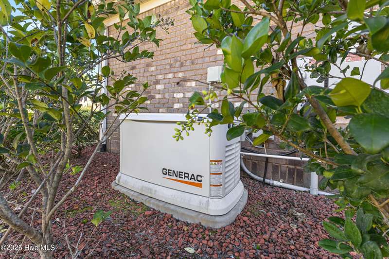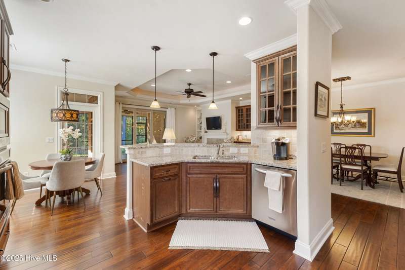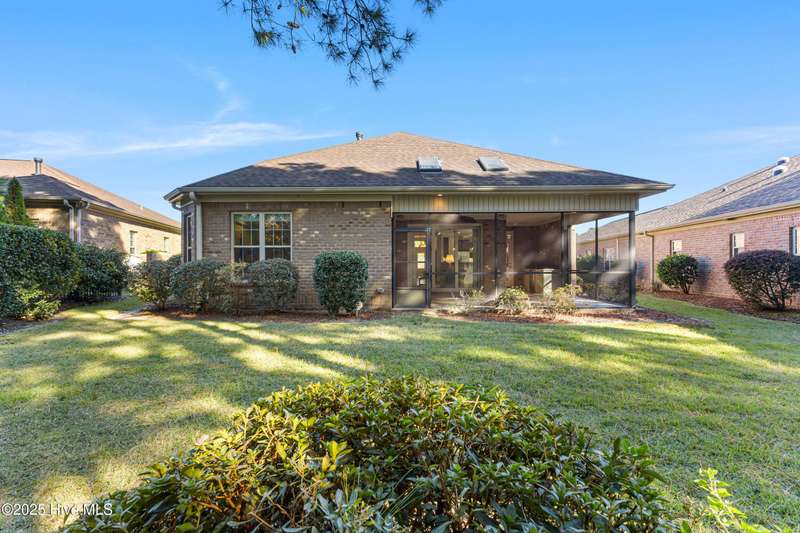 Beautifully maintained brick home in the coveted neighborhood of the Village at Motts Landing. Nestled on a peaceful tree-lined homesite that offers exceptional privacy and wooded views, this single-level, 3 bedroom, 3 full bath residence exudes timeless craftsmanship, low maintenance design, and thoughtful attention to detail--all enhanced by a 2024 Generac generator and HOA included yard maintenance for added convenience and piece of mind. Inside, you'll find an open floor plan with showstopping Brazilian cherry engineered wood flooring, an elegant designated dining space, and a refined home office with a coffered ceiling and custom built-ins, making the perfect place to showcase your favorite pieces. The spacious living room features a tray ceiling with soft recessed perimeter lighting, a cozy fireplace tucked in between built-ins and a wet bar--creating the perfect space for every day living and entertaining. The kitchen is both stylish and functional, featuring tall, soft-close wood cabinetry, stainless appliances, neutral granite countertops, and windows that fill the space with natural light. The primary bedroom suite includes two nice-sized walk-in closets with upgraded shelving and an expansive en suite bathroom complete with tile flooring, dual vanities with granite countertops, generous cabinet storage and a large tile walk-in shower. Step outside to the beautiful lanai, featuring an outdoor kitchen, perfect for year round enjoyment and effortless outdoor living! This desirable community offers multiple clubhouses and pools, along with tennis, pickleball, fitness center, sidewalks and a vibrant calendar of social events--all in an unbeatable location just 15-20 minutes from Carolina Beach and historic downtown Wilmington. Discover the ease of coastal, low maintenance living in this stunning home!