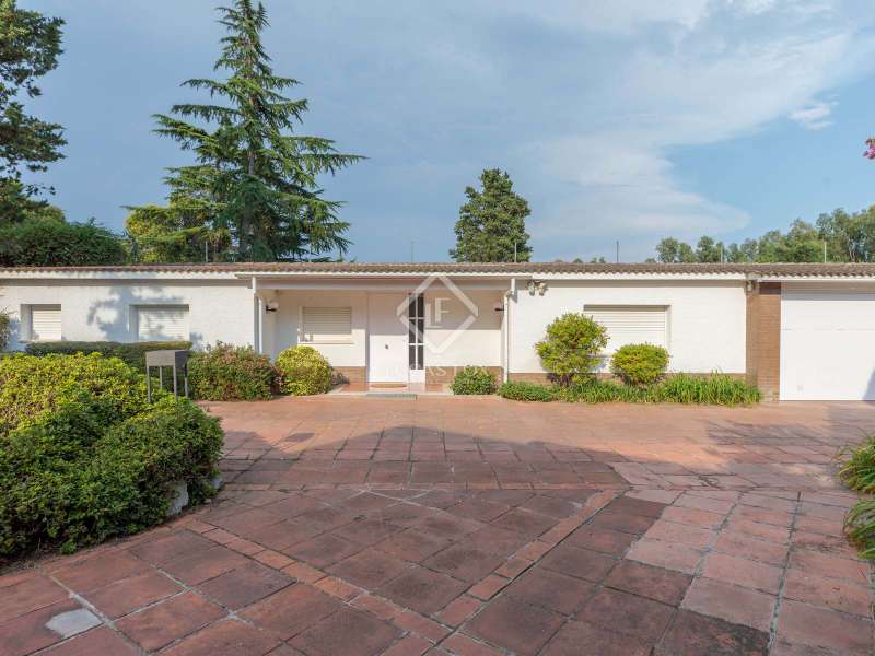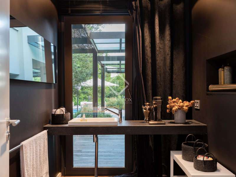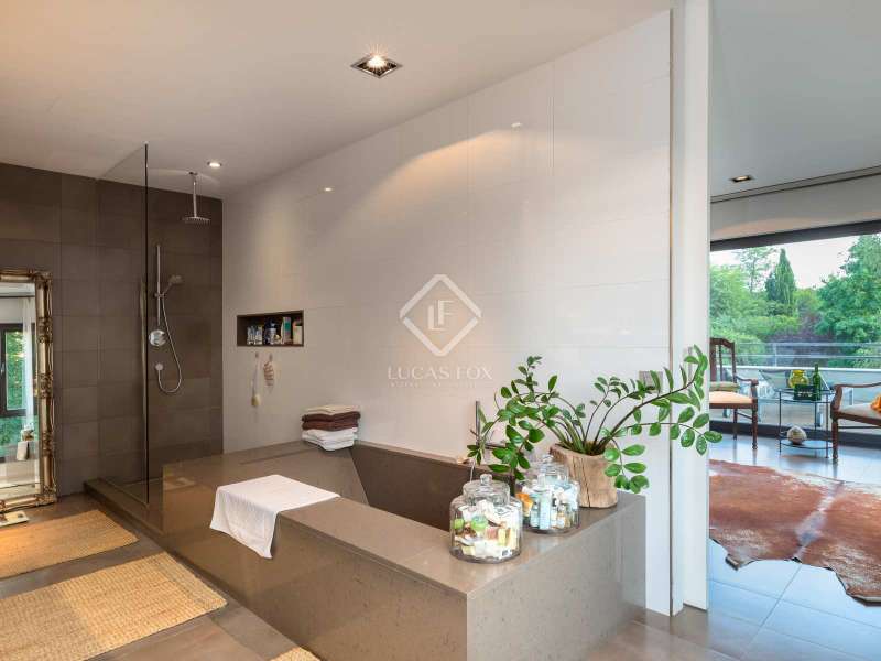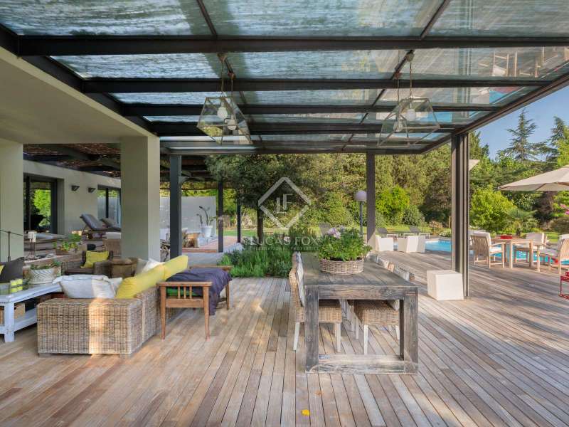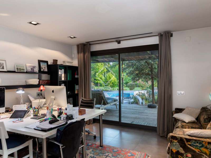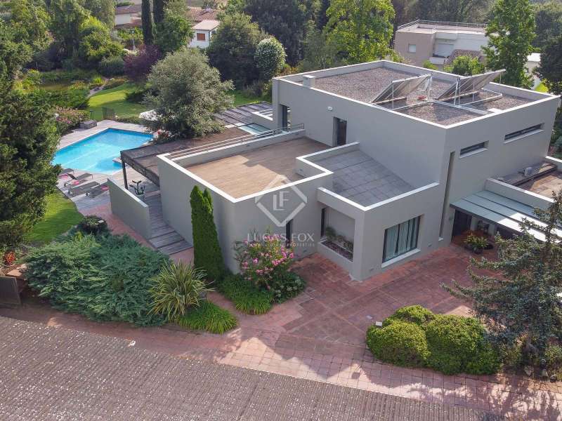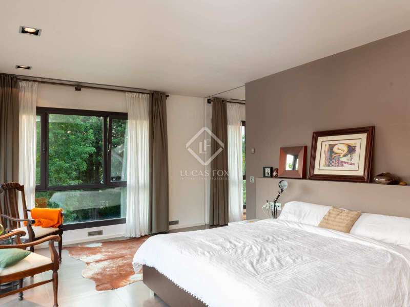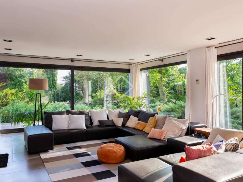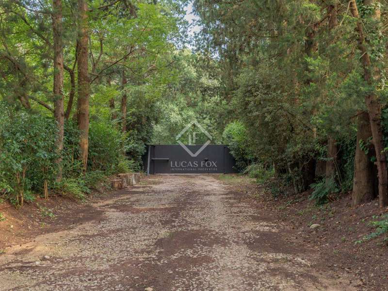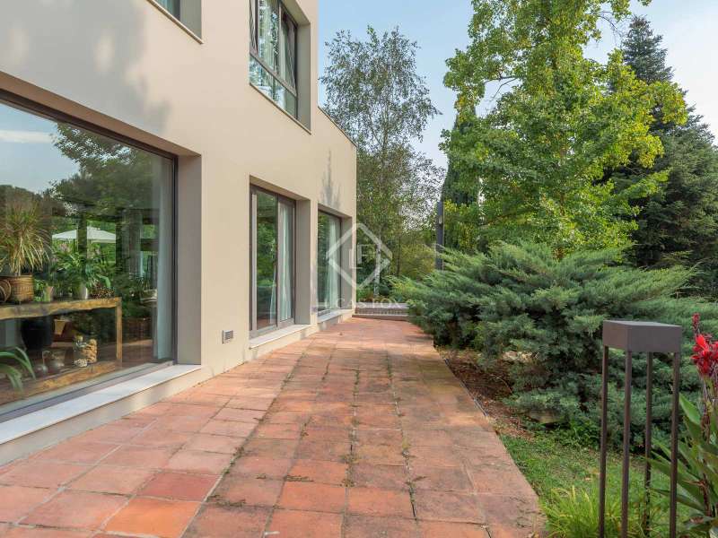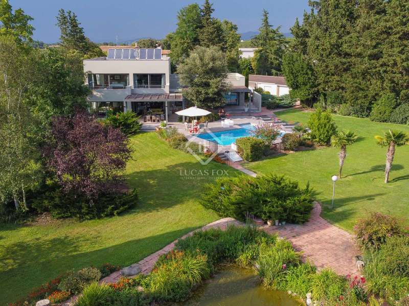 This unique property is located in a prime area of Girona, close to the international schools. The house is set on a vast plot of 5,612 m² of beautifully kept mature gardens which provide the property with complete privacy. We enter via an elegant driveway that leads us to a large paved patio with a parking area for guests, the staff quarters and a large garage to the right and the main house with another garage for 2 cars to our left. The main house was built in 2008 and is distributed over two floors. The front door opens on to a grand entrance with a double height ceiling, lots of light and a minimalist iron staircase leading to the first floor. To the right there is a spacious modern kitchen with a separate laundry room and direct access to the garage and machinery room. Straight ahead opens up to a spacious 120 m² open plan living room area with a fireplace and dining area that connects with the kitchen. The entire room has floor-to-ceiling sliding glass doors on three sides that look out over the gardens of the property. Various adjoining porches provide shade and create a series of fantastic outdoor living areas between the house and the swimming pool. To the left of the front entrance, a separate wing of the house accommodates a guest toilet, a double bedroom with an ensuite bathroom, two further double bedrooms plus a family bathroom and a study area which could be converted into a fourth bedroom. All the bedrooms have direct access to the garden. The first floor accommodates a luxurious 100 m² suite with two terraces of 32 m² and 60 m². The suite compromises a spacious sitting room, large dressing room, bathroom and bedroom with access to the south-facing terrace and views over the gardens. Outside, on one edge of the plot there is 125 m² building which is composed of a small apartment, ideal for staff quarters, a large office, storage space and a garage for 2 cars. The entire house and swimming pool are surrounded by mature landscaped gardens and tall trees on the edges of the plot provide complete privacy. The main house is built and maintained to the highest standards and is equipped with underfloor heating, Daikin air conditioning, solar panels, double glazed security glass, exterior laser alarm system with seven outdoor camaras and a private well for irrigation. The size of the plot means that, according to the town planning regulations, there is the possibility to divide two sections of the garden and build two further properties. A fantastic opportunity to buy one of the most outstanding properties of this prime residential area of Girona within walking distance of the best international schools.