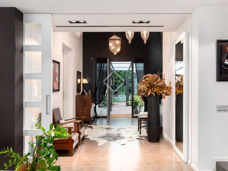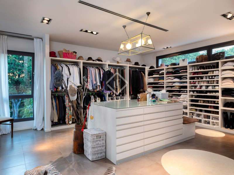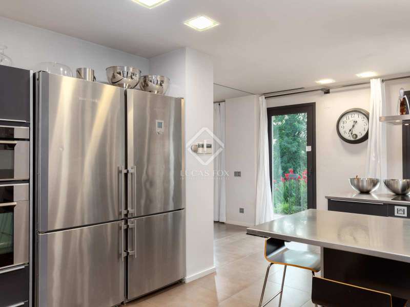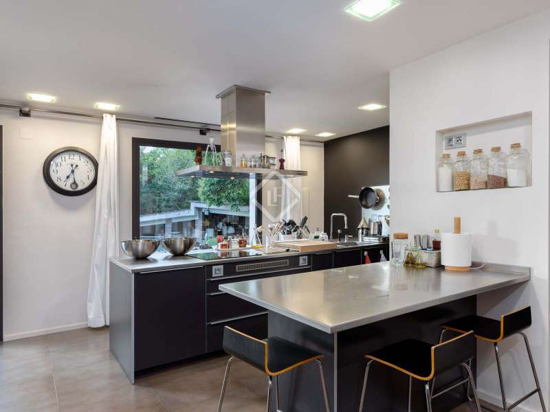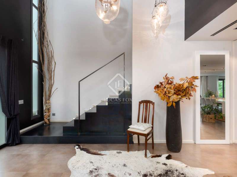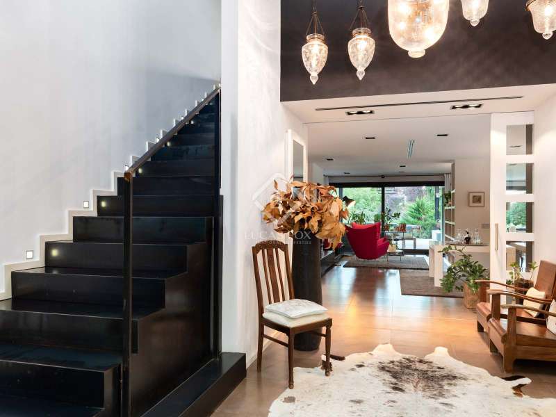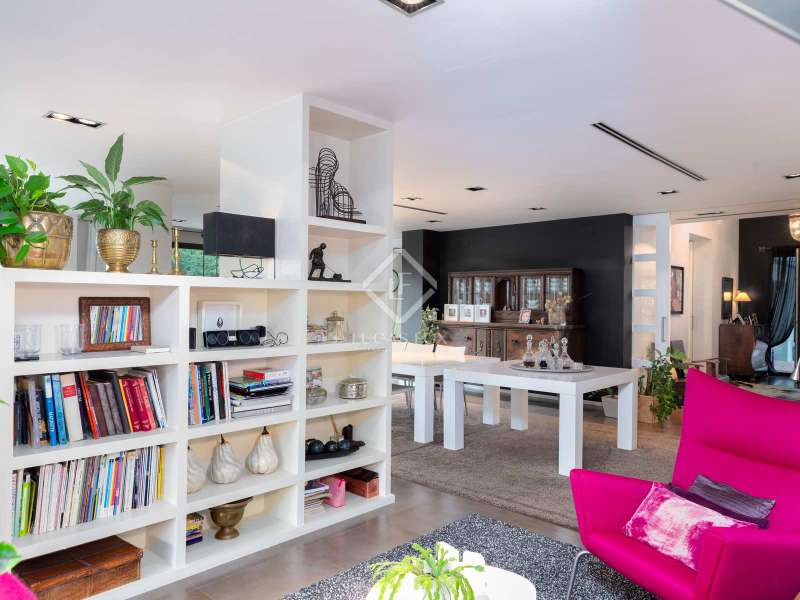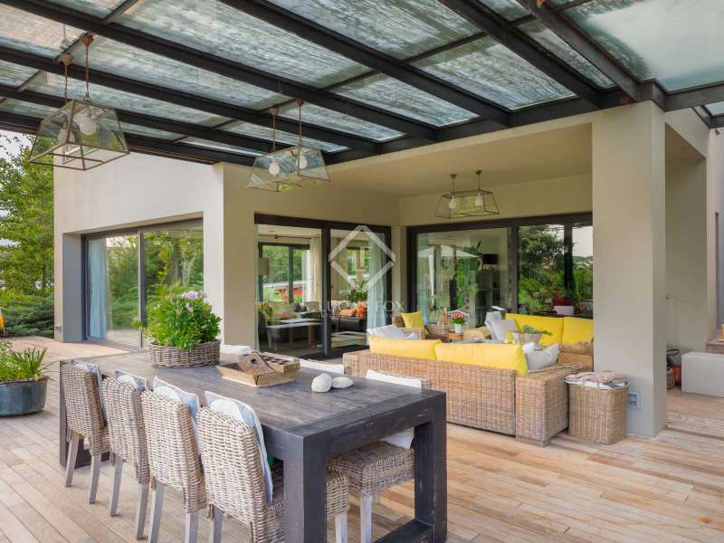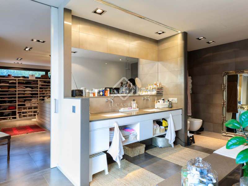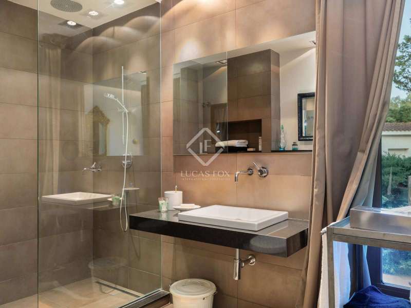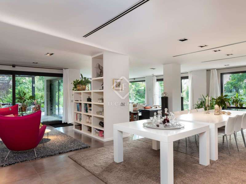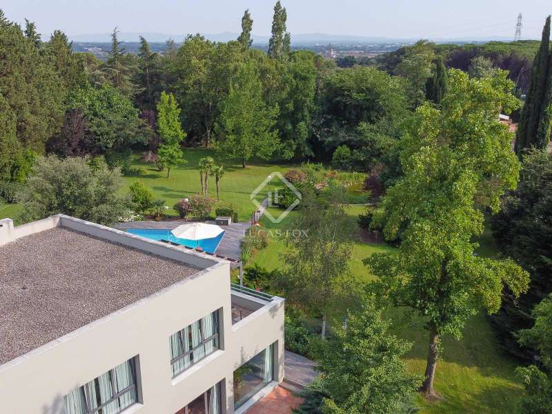 This unique property is located in a prime area of Girona, close to the international schools. The house is set on a vast plot of 5,612 m² of beautifully kept mature gardens which provide the property with complete privacy. We enter via an elegant driveway that leads us to a large paved patio with a parking area for guests, the staff quarters and a large garage to the right and the main house with another garage for 2 cars to our left. The main house was built in 2008 and is distributed over two floors. The front door opens on to a grand entrance with a double height ceiling, lots of light and a minimalist iron staircase leading to the first floor. To the right there is a spacious modern kitchen with a separate laundry room and direct access to the garage and machinery room. Straight ahead opens up to a spacious 120 m² open plan living room area with a fireplace and dining area that connects with the kitchen. The entire room has floor-to-ceiling sliding glass doors on three sides that look out over the gardens of the property. Various adjoining porches provide shade and create a series of fantastic outdoor living areas between the house and the swimming pool. To the left of the front entrance, a separate wing of the house accommodates a guest toilet, a double bedroom with an ensuite bathroom, two further double bedrooms plus a family bathroom and a study area which could be converted into a fourth bedroom. All the bedrooms have direct access to the garden. The first floor accommodates a luxurious 100 m² suite with two terraces of 32 m² and 60 m². The suite compromises a spacious sitting room, large dressing room, bathroom and bedroom with access to the south-facing terrace and views over the gardens. Outside, on one edge of the plot there is 125 m² building which is composed of a small apartment, ideal for staff quarters, a large office, storage space and a garage for 2 cars. The entire house and swimming pool are surrounded by mature landscaped gardens and tall trees on the edges of the plot provide complete privacy. The main house is built and maintained to the highest standards and is equipped with underfloor heating, Daikin air conditioning, solar panels, double glazed security glass, exterior laser alarm system with seven outdoor camaras and a private well for irrigation. The size of the plot means that, according to the town planning regulations, there is the possibility to divide two sections of the garden and build two further properties. A fantastic opportunity to buy one of the most outstanding properties of this prime residential area of Girona within walking distance of the best international schools.