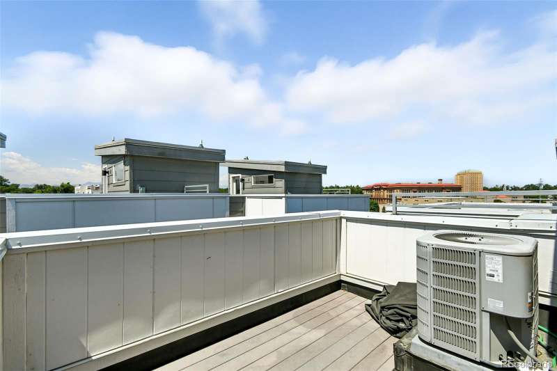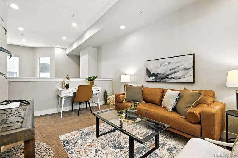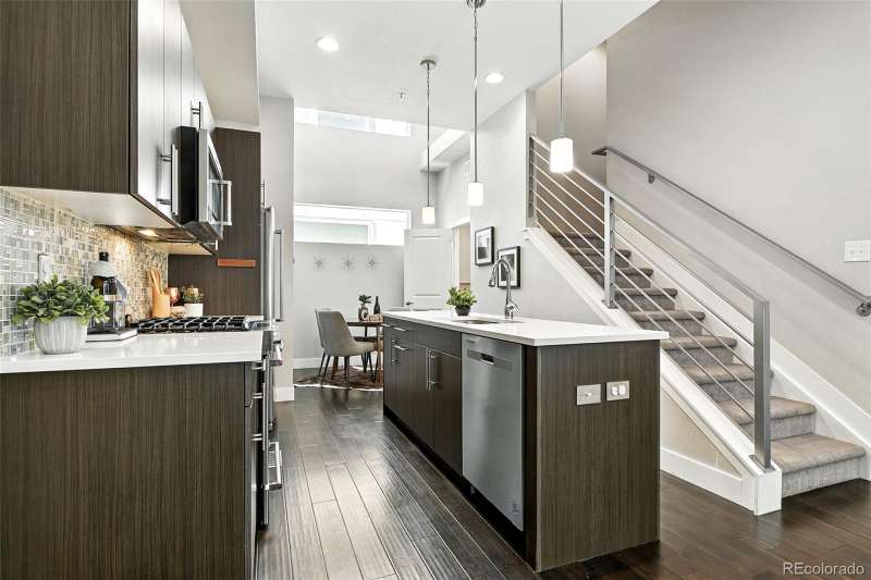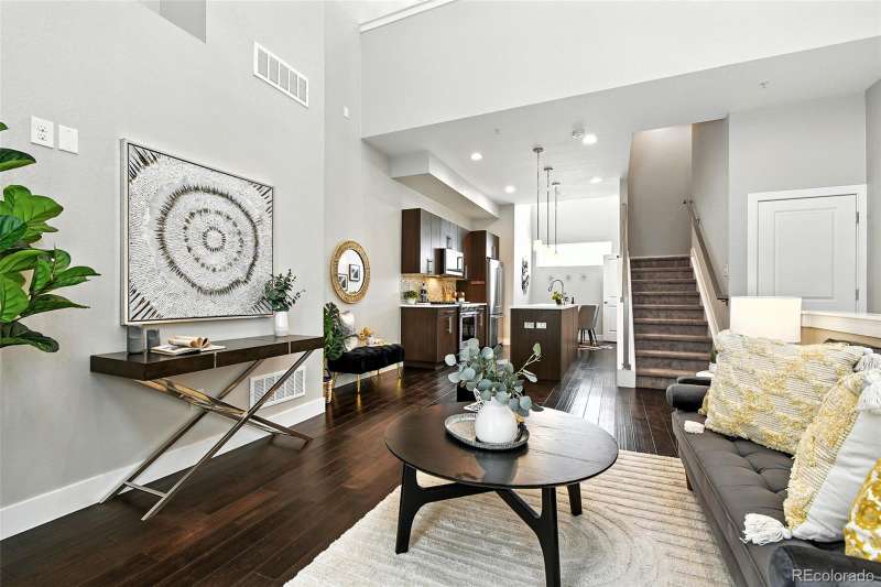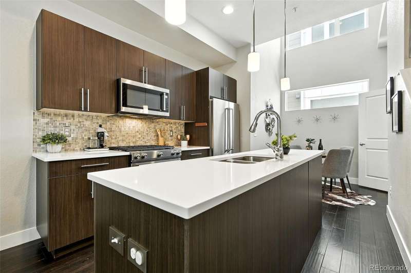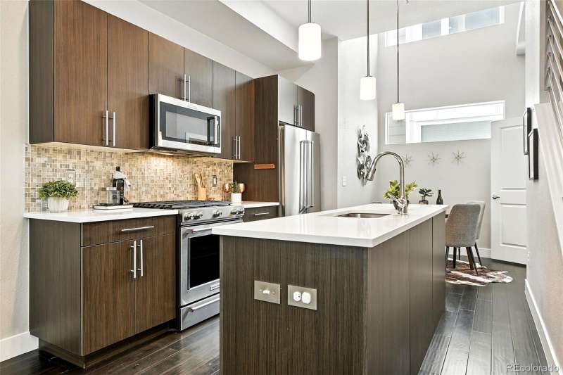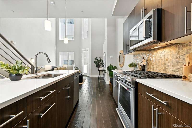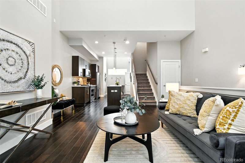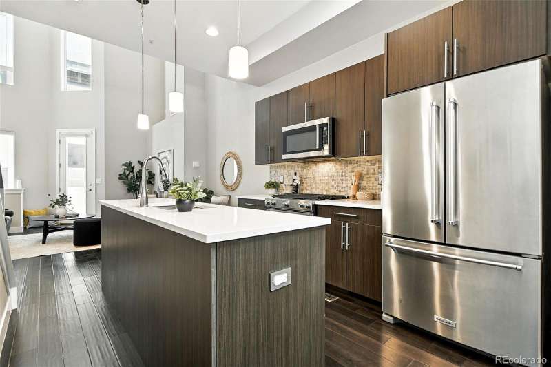 High ceilings soaring twenty feet and expansive windows create a sense of openness throughout this modern townhome located just steps from both Jefferson Park and LoHi. Built in 2015, the home offers a functional and well-designed layout with 2 bedrooms, 4 bathrooms, and a spacious loft that provides additional flexibility for an office, workout space, guest area or third bedroom. The main level features an open kitchen with quartz countertops, a large center island, and stainless steel appliances, all designed for everyday ease and entertaining. The adjacent living and dining areas are filled with natural light, and the layout supports both comfortable living and efficient flow. Upstairs, the primary suite includes a generous closet and en-suite bathroom, while the second bedroom and full bathroom are located down the hall for added privacy. The next level leads to a large rooftop deck with expansive city views, offering a low-maintenance outdoor space to enjoy. The rooftop is designed to support a hot tub. There is also no HOA-only a party wall agreement with an average monthly cost of just $97 over the past 12 months, providing excellent value for low-maintenance living. Additional highlights include a two-car garage, deep-cleaned carpets, and a freshly painted exterior entrance. This townhome offers a move-in-ready option in one of Denver's most vibrant and walkable neighborhoods, with quick access to dining, shopping, and downtown.