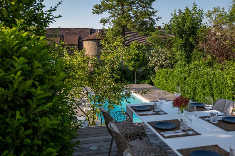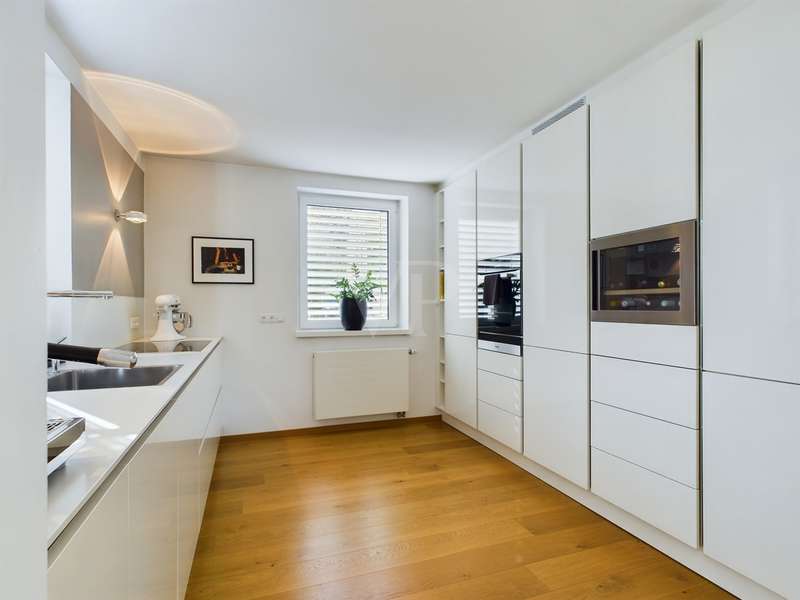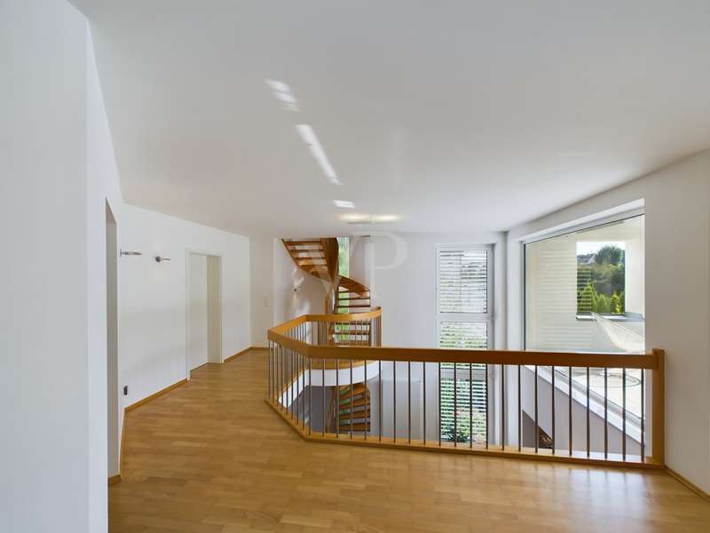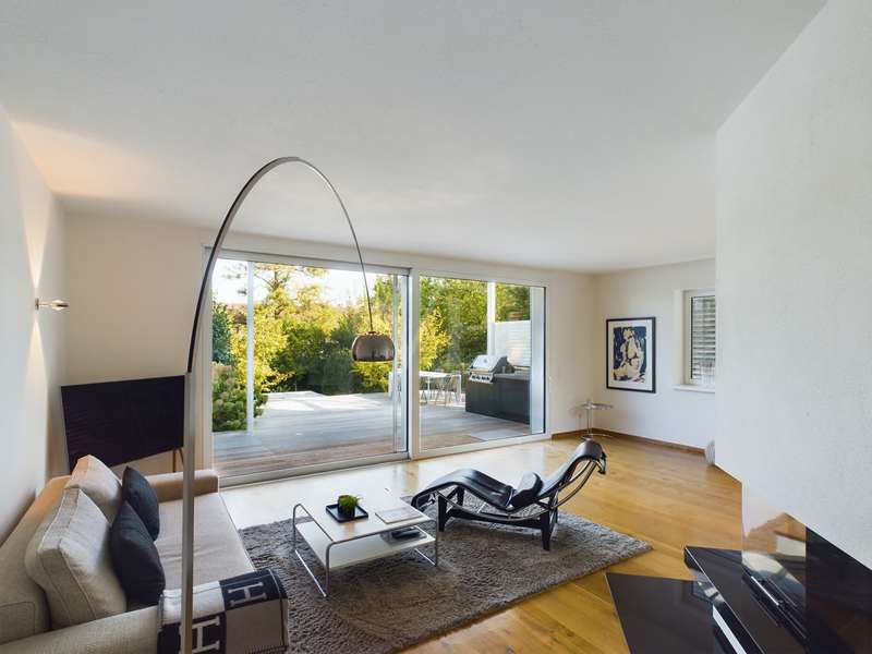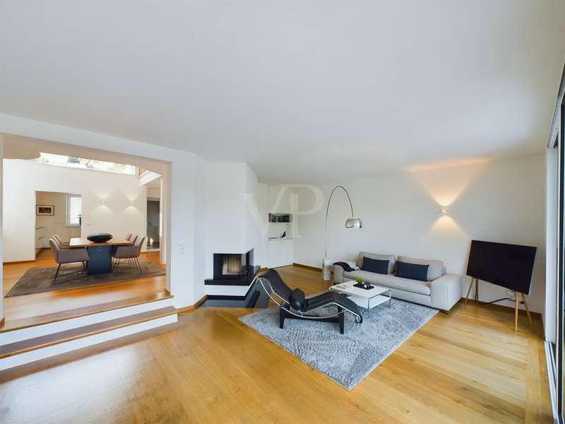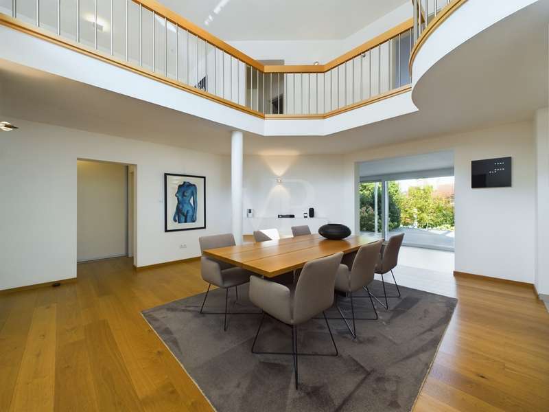 Are you looking for exclusivity and comfort? Here you can experience and enjoy luxurious living in protected PRIVATE SPACE. The modern property for the highest living standards with a harmoniously designed garden and heated pool impresses with its clear and appealing architecture and chic interior. It impresses with its open-plan design and offers you living with the highest level of comfort. High ceilings and large glass fronts with floor-to-ceiling windows on all floors ensure spaciousness and transparency. The floor-to-ceiling sliding glass elements extend the living area outside to include the approx. 55 m² terrace and the adjoining pool area with sunbathing area on both sides. A harmonious color scheme and a perfectly planned lighting concept with over 20 Occhio lights create a relaxed and interesting atmosphere in the light-flooded living spaces. Built-in cupboards made of solid wood were custom-made by the carpenter and offer storage space on all floors. In winter, you can enjoy stylish coziness by the open fireplace with a view of the illuminated garden. Only high-quality materials were used, which are perfectly coordinated. Here you can feel at home in soothing tranquillity. Are you interested in this comfortable property? Then send us an e-mail or call us on 0179-2274038.