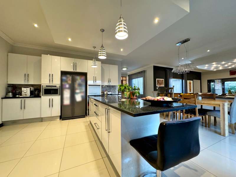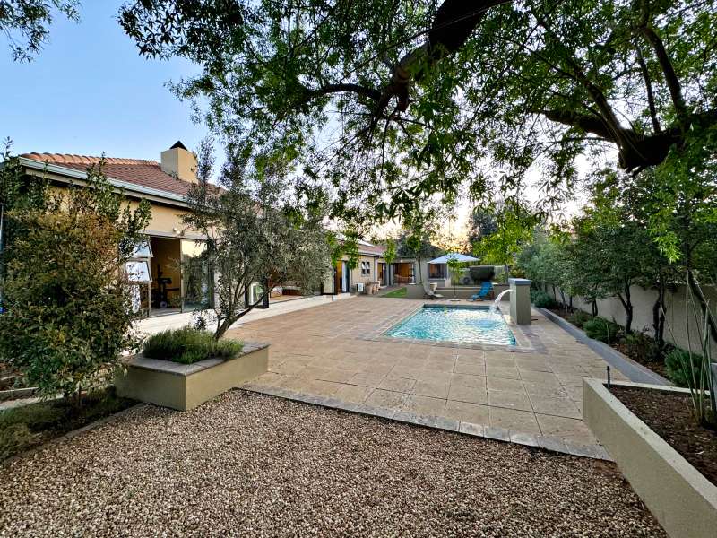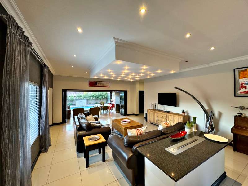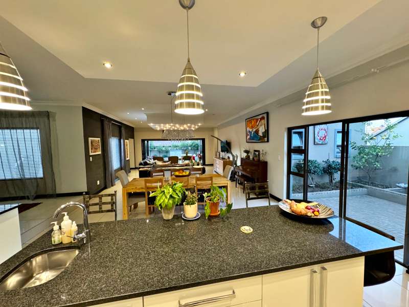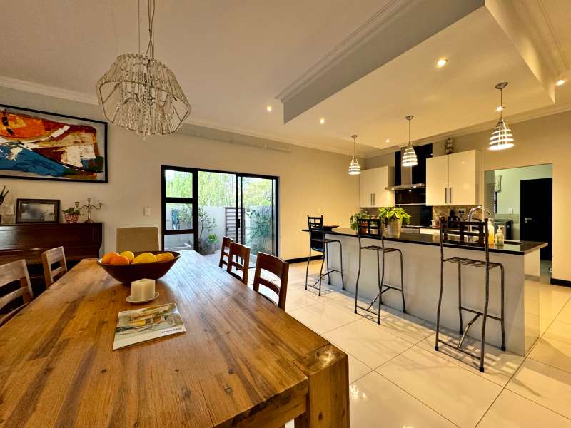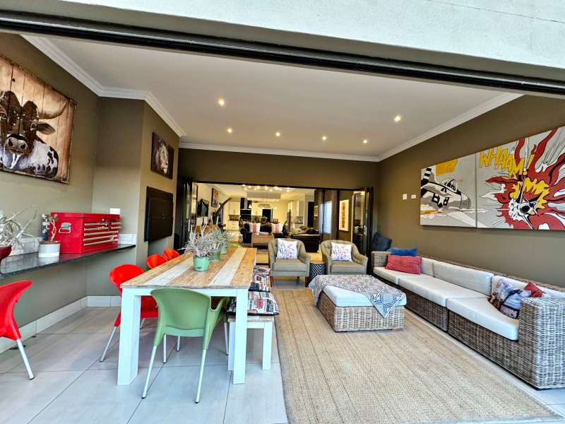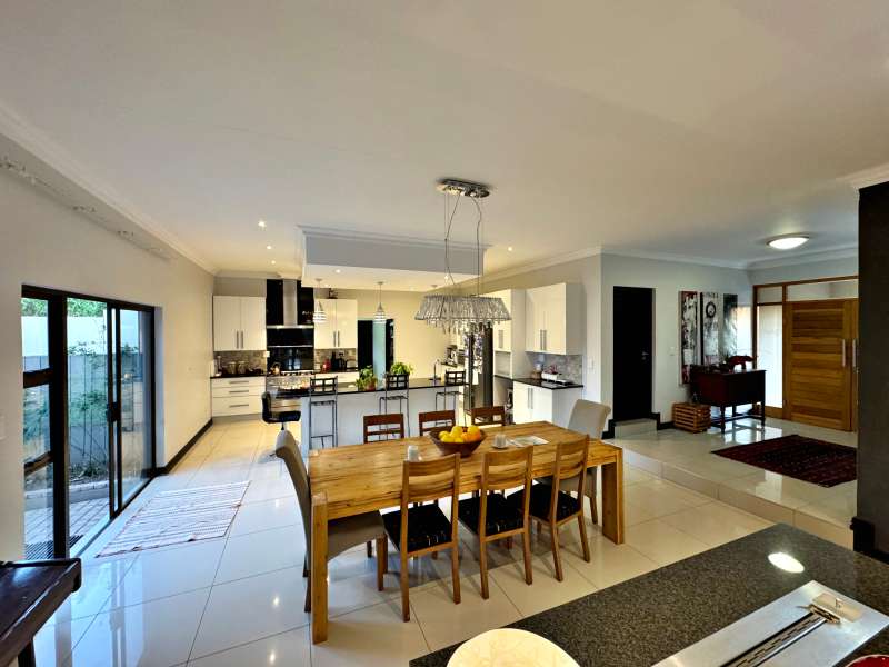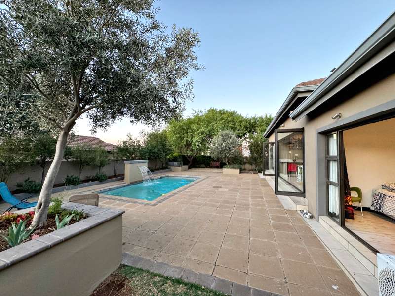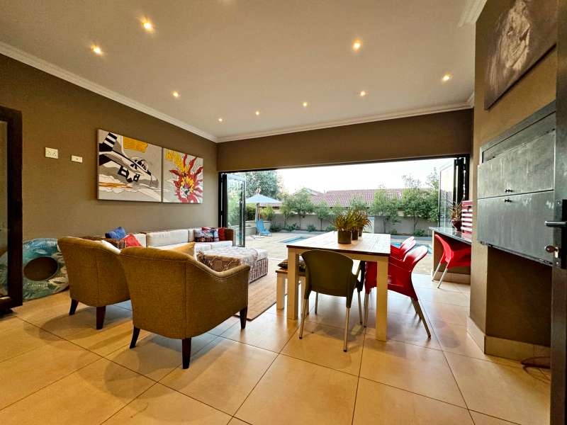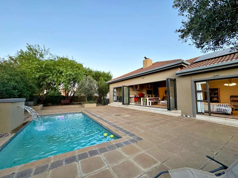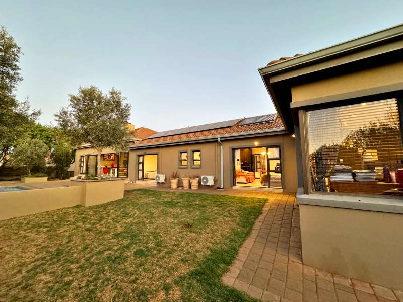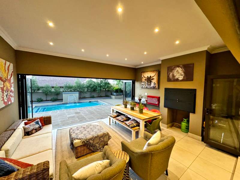 Modern and spacious family home designed for comfort and style, this property is perfect for year-round enjoyment. Situated towards the end of a cul-de-sac near the green area, the home offers a unique opportunity to experience the nature trails and wildlife. This north-facing home features a spacious open-plan living, dining and kitchen area with a gas fireplace, making it ideal for any season. The kitchen is equipped with modern and smart design elements and includes a gas stove, electric oven, a centre island and ample space for appliances with sliding doors opening up to a private courtyard with water feature.. A separate scullery and pantry add extra convenience. The large entertainment area, with built-in braai and stack-up doors opens up to the garden and pool deck with a waterfall and creates the utmost feeling of peace and tranquillity for entertaining guests. All four north-facing bedrooms are spacious, en-suite and open to the garden and pool area. The main bedroom with its studio design boasts a luxurious bathroom. A double garage provides ample space for vehicles and additional features include separate staff quarters, underfloor heating, a solar geyser, irrigation, a 20 000 litre grey water tank system complete with pump, fibre internet and plenty of storage space. The property also includes fruit trees and a vegetable garden. The solar panels, inverter and battery system are not included in the sales price. Contact us to arrange a viewing of this stunning home!
