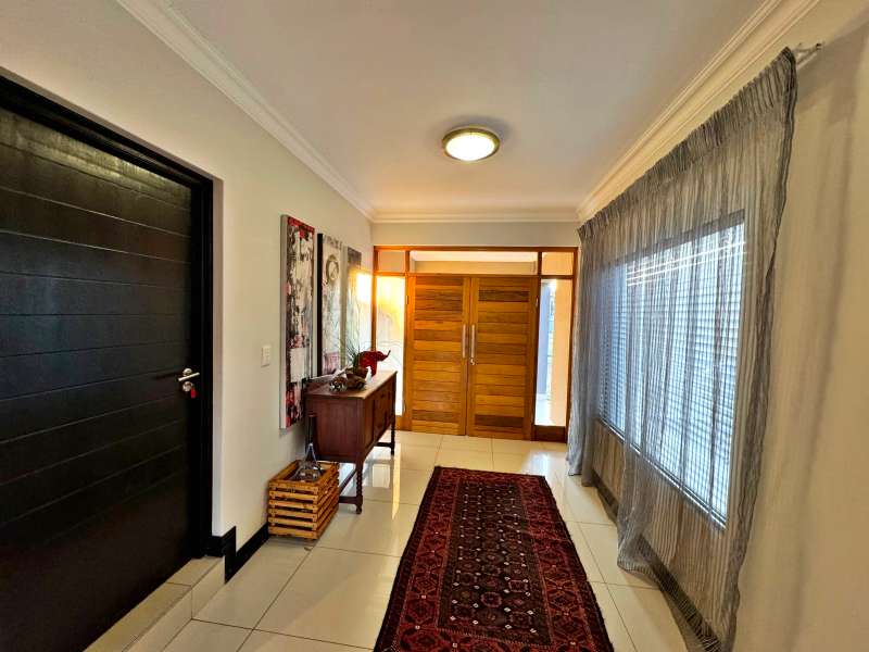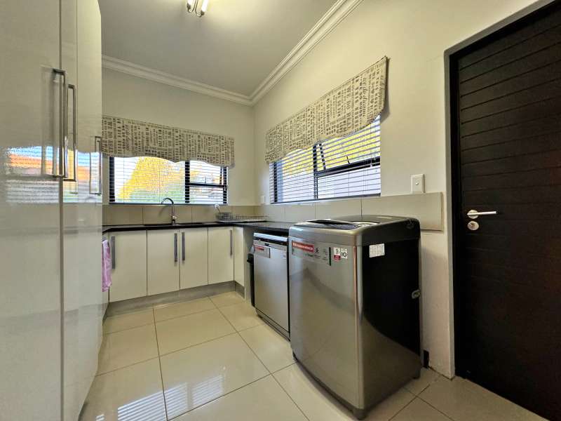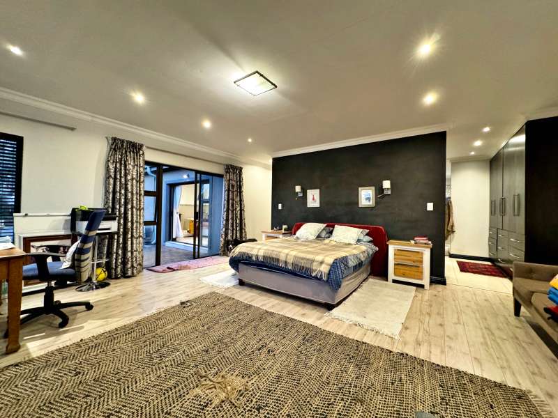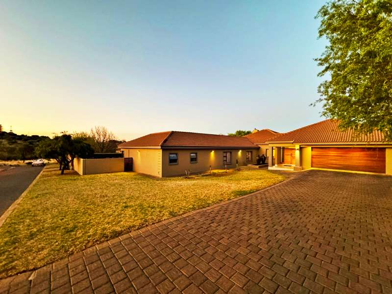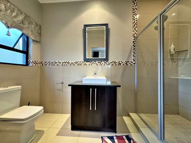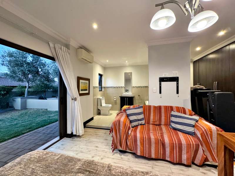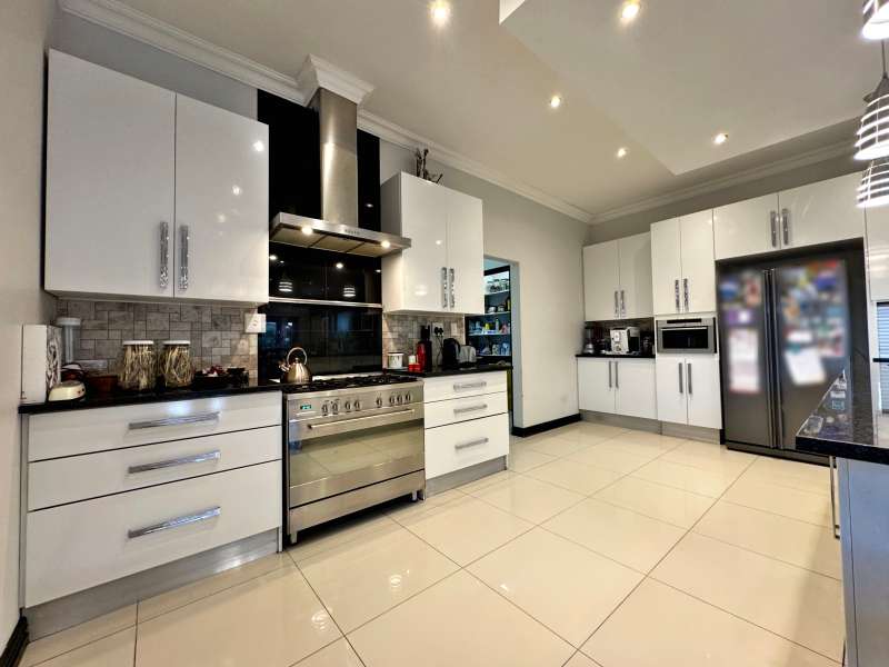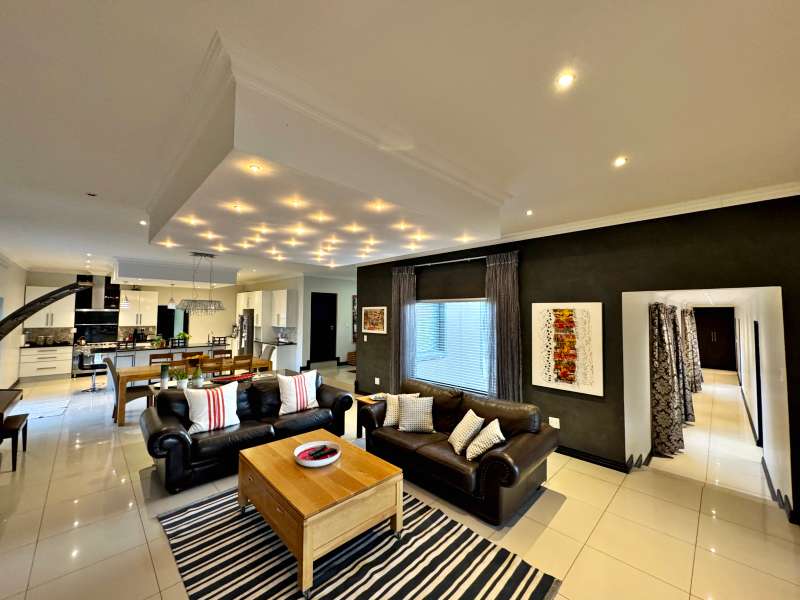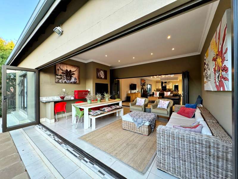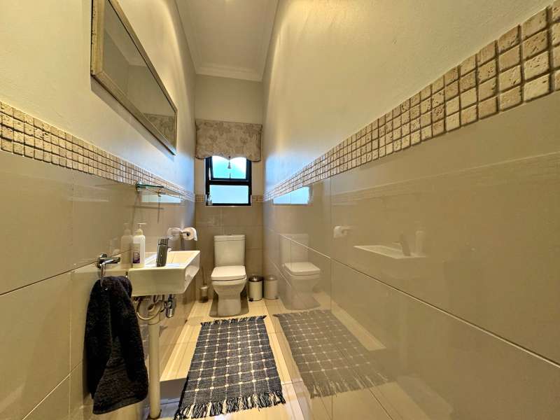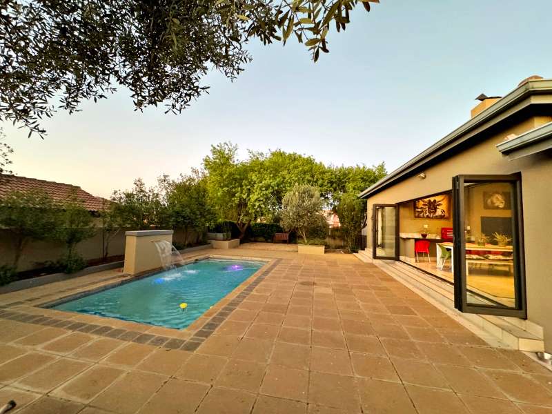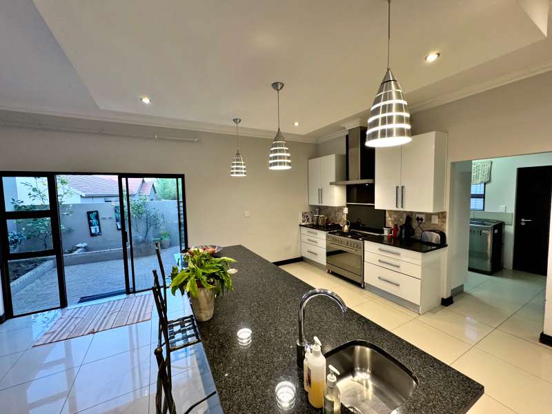 Modern and spacious family home designed for comfort and style, this property is perfect for year-round enjoyment. Situated towards the end of a cul-de-sac near the green area, the home offers a unique opportunity to experience the nature trails and wildlife. This north-facing home features a spacious open-plan living, dining and kitchen area with a gas fireplace, making it ideal for any season. The kitchen is equipped with modern and smart design elements and includes a gas stove, electric oven, a centre island and ample space for appliances with sliding doors opening up to a private courtyard with water feature.. A separate scullery and pantry add extra convenience. The large entertainment area, with built-in braai and stack-up doors opens up to the garden and pool deck with a waterfall and creates the utmost feeling of peace and tranquillity for entertaining guests. All four north-facing bedrooms are spacious, en-suite and open to the garden and pool area. The main bedroom with its studio design boasts a luxurious bathroom. A double garage provides ample space for vehicles and additional features include separate staff quarters, underfloor heating, a solar geyser, irrigation, a 20 000 litre grey water tank system complete with pump, fibre internet and plenty of storage space. The property also includes fruit trees and a vegetable garden. The solar panels, inverter and battery system are not included in the sales price. Contact us to arrange a viewing of this stunning home!