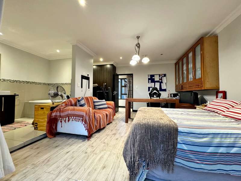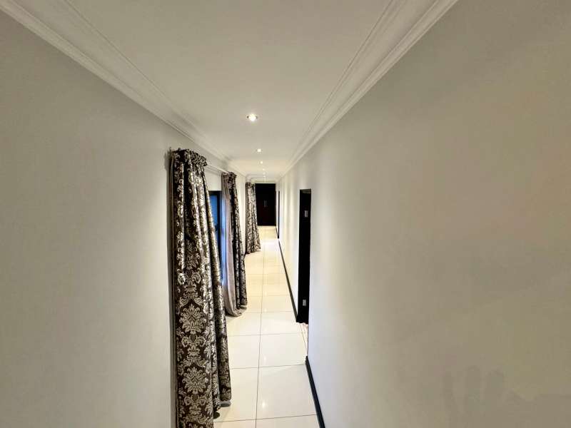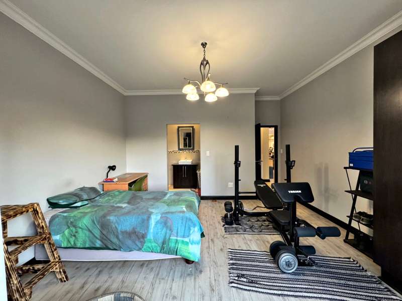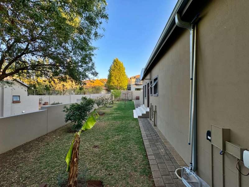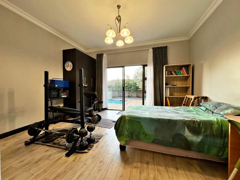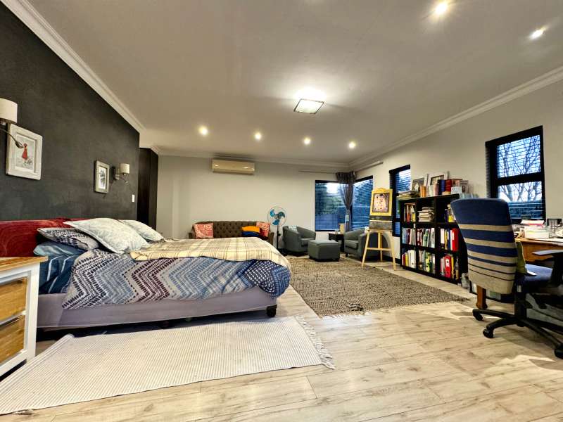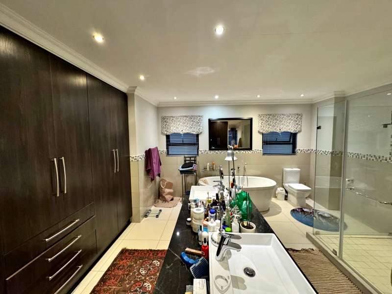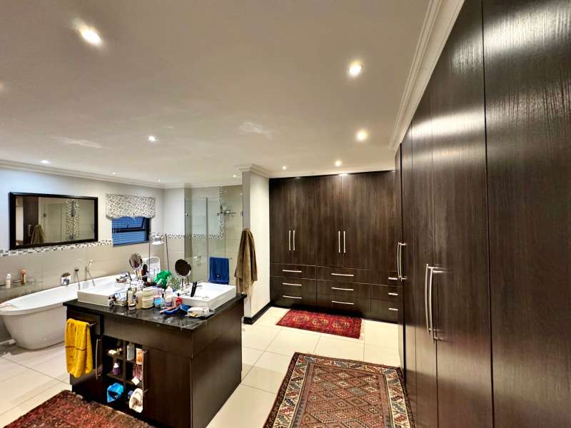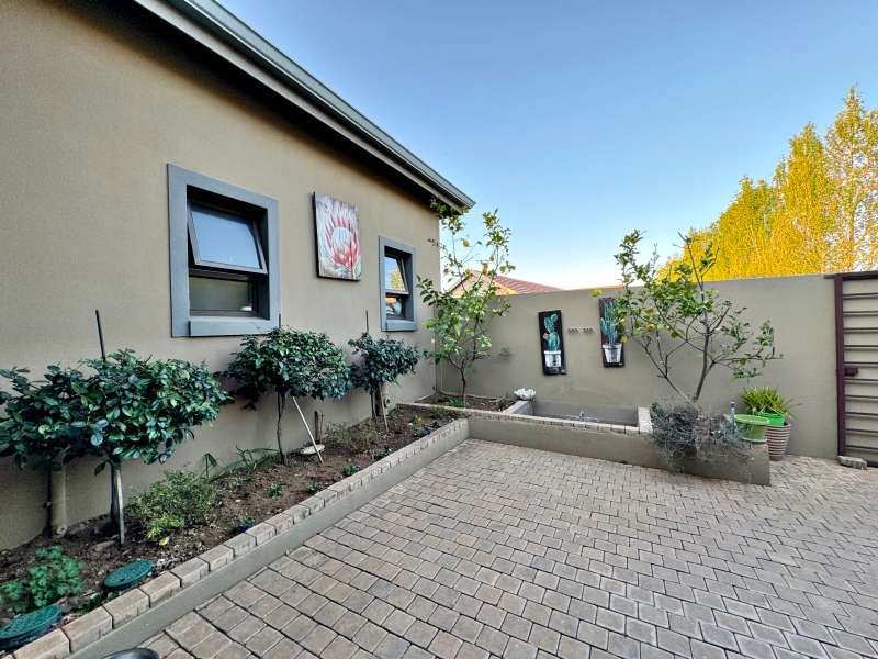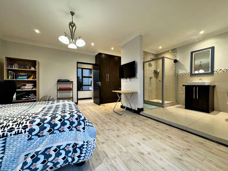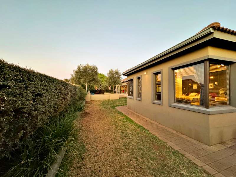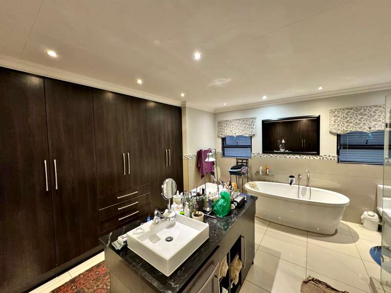 Modern and spacious family home designed for comfort and style, this property is perfect for year-round enjoyment. Situated towards the end of a cul-de-sac near the green area, the home offers a unique opportunity to experience the nature trails and wildlife. This north-facing home features a spacious open-plan living, dining and kitchen area with a gas fireplace, making it ideal for any season. The kitchen is equipped with modern and smart design elements and includes a gas stove, electric oven, a centre island and ample space for appliances with sliding doors opening up to a private courtyard with water feature.. A separate scullery and pantry add extra convenience. The large entertainment area, with built-in braai and stack-up doors opens up to the garden and pool deck with a waterfall and creates the utmost feeling of peace and tranquillity for entertaining guests. All four north-facing bedrooms are spacious, en-suite and open to the garden and pool area. The main bedroom with its studio design boasts a luxurious bathroom. A double garage provides ample space for vehicles and additional features include separate staff quarters, underfloor heating, a solar geyser, irrigation, a 20 000 litre grey water tank system complete with pump, fibre internet and plenty of storage space. The property also includes fruit trees and a vegetable garden. The solar panels, inverter and battery system are not included in the sales price. Contact us to arrange a viewing of this stunning home!