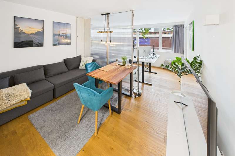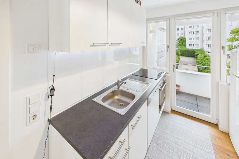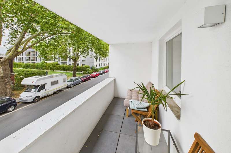 This modern two-room apartment was completely refurbished in 2015, freshly renovated and now offers everything you need for comfortable living - in close proximity to Mülheim harbor. The heart of the apartment on the 1st floor is the spacious living room, from which all other rooms are accessible. The bright kitchen has space for a small dining area and has access to a cozy loggia with a view of the rear courtyard. The daylight bathroom impresses with a floor-level shower and glass partition, ensuring a comfortable living experience. There are practical built-in wardrobes and shelves in the bedroom, while the window faces the large loggia, which can be accessed from the living room and creates additional open space. High-quality oak floorboards in all living areas (except the bathroom) give the apartment a warm, stylish atmosphere. There is also a separate cellar room and a bicycle parking space in the inner courtyard. Many pieces of furniture, including the fitted kitchen and a washing machine, can be taken over from the previous tenant by arrangement.