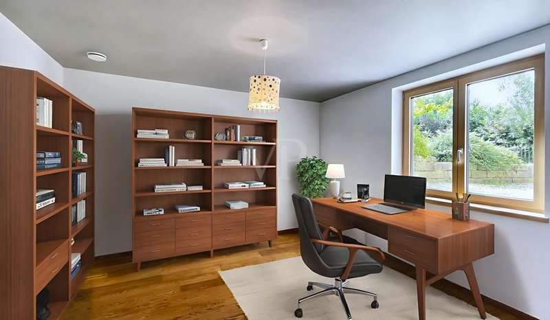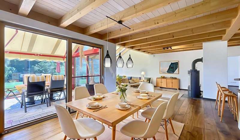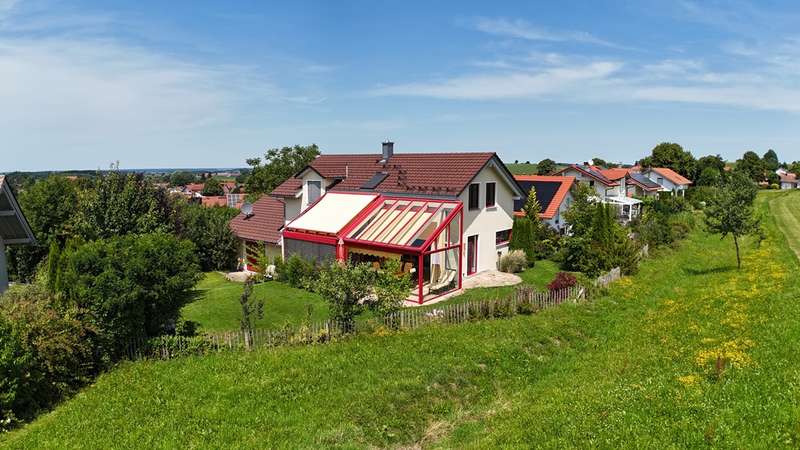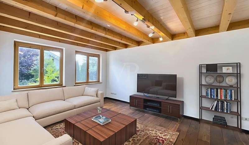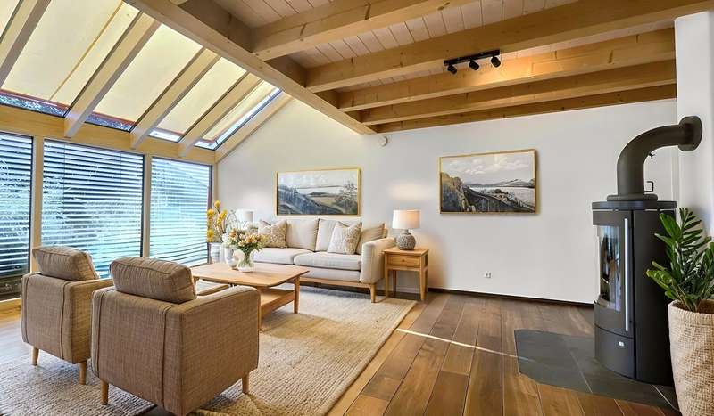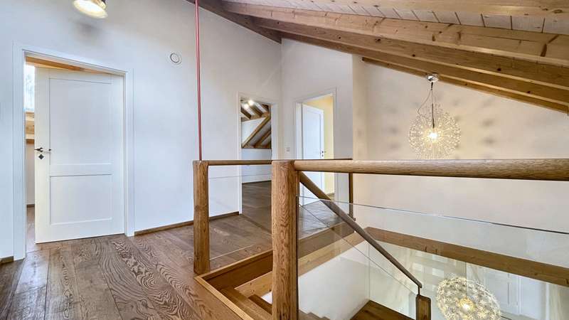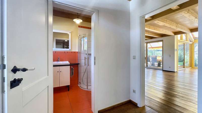 This exceptionally well-kept detached house on the green outskirts of Kimratshofen meets the highest standards of quality of life, style and sustainable construction. It is situated in an absolutely peaceful location at the end of a cul-de-sac - a place where children can play carefree and adults can take a deep breath. To the left and right, wide meadows flow along the property in gently rolling greenery, lending the property a pleasant openness. As soon as you enter the house, you are greeted by a pleasant feeling of space: light, air and wood in perfect harmony. The ecological architect-designed house was created with great attention to detail and has been maintained with great care in recent years. The condition is almost as good as new - every component, every floor covering, every joint speaks of quality and a responsible approach to the building. The center of the house is a generously designed living, dining and cooking area with a fully integrated conservatory. Daylight floods the room through the floor-to-ceiling windows and the open wooden ceiling, creating a special atmosphere that is both lively and warm. The high-quality wood-burning stove not only lends the living areas a cozy warmth on cooler days, but also a feeling of security. The sheltered south-west-facing terrace is a real highlight: it creates a seamless transition between indoors and outdoors and invites you to experience nature in every season. Whether it's a sunny breakfast on the east side or long evenings under the stars - this house always offers the perfect place. On the top floor, you will find bright bedrooms and workspaces with exposed beams, a well-designed bathroom with double washbasins and corner bath and a high-quality living ambience with great attention to detail. The well thought-out design also continues in the basement: with fully-fledged work or practice rooms, its own entrance and separate sanitary area - perfect for professionals or for use as guest accommodation. The features read like a promise: solid oak wood floors, shielded electrical wiring, full thermal insulation with wood fiber plaster, triple-glazed wood-aluminum windows, automated blinds and awnings, controlled ventilation with heat recovery, whirlpool tub, robotic lawn mower - to name just a few. The home's technology is virtually self-sufficient and meets the highest ecological standards (final energy requirement: 14.4 kWh/m²a - A+). This offer is rounded off by a spacious double garage with a converted attic and a lovingly landscaped, fully ingrown garden, which further emphasizes the feeling of natural privacy.