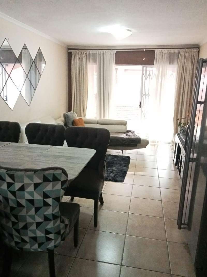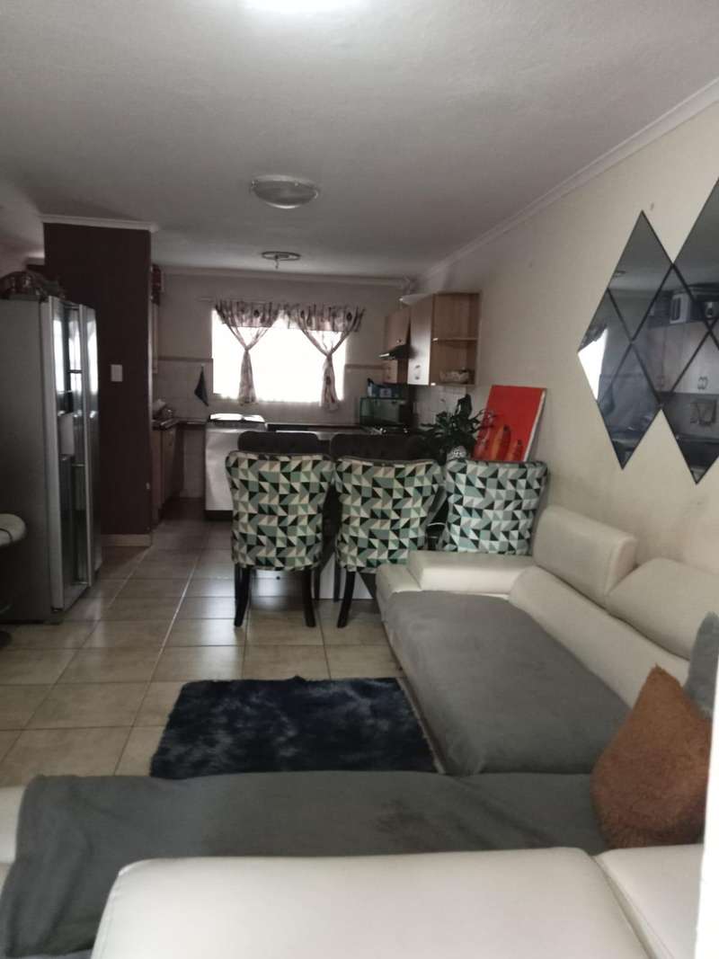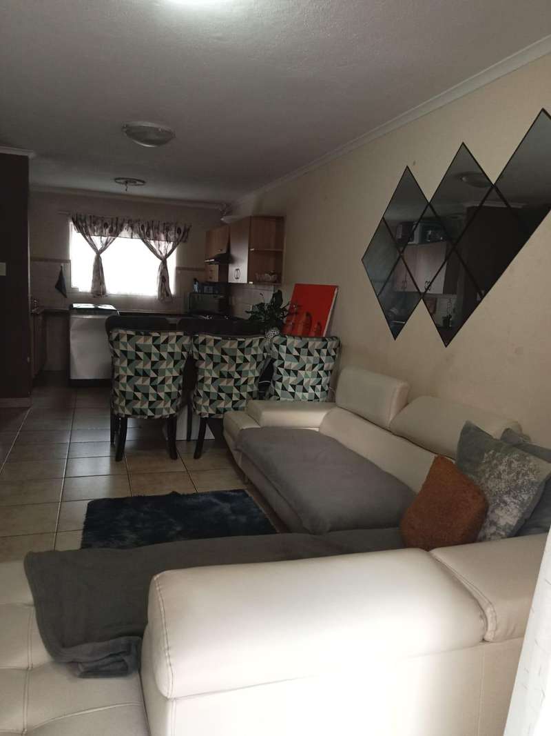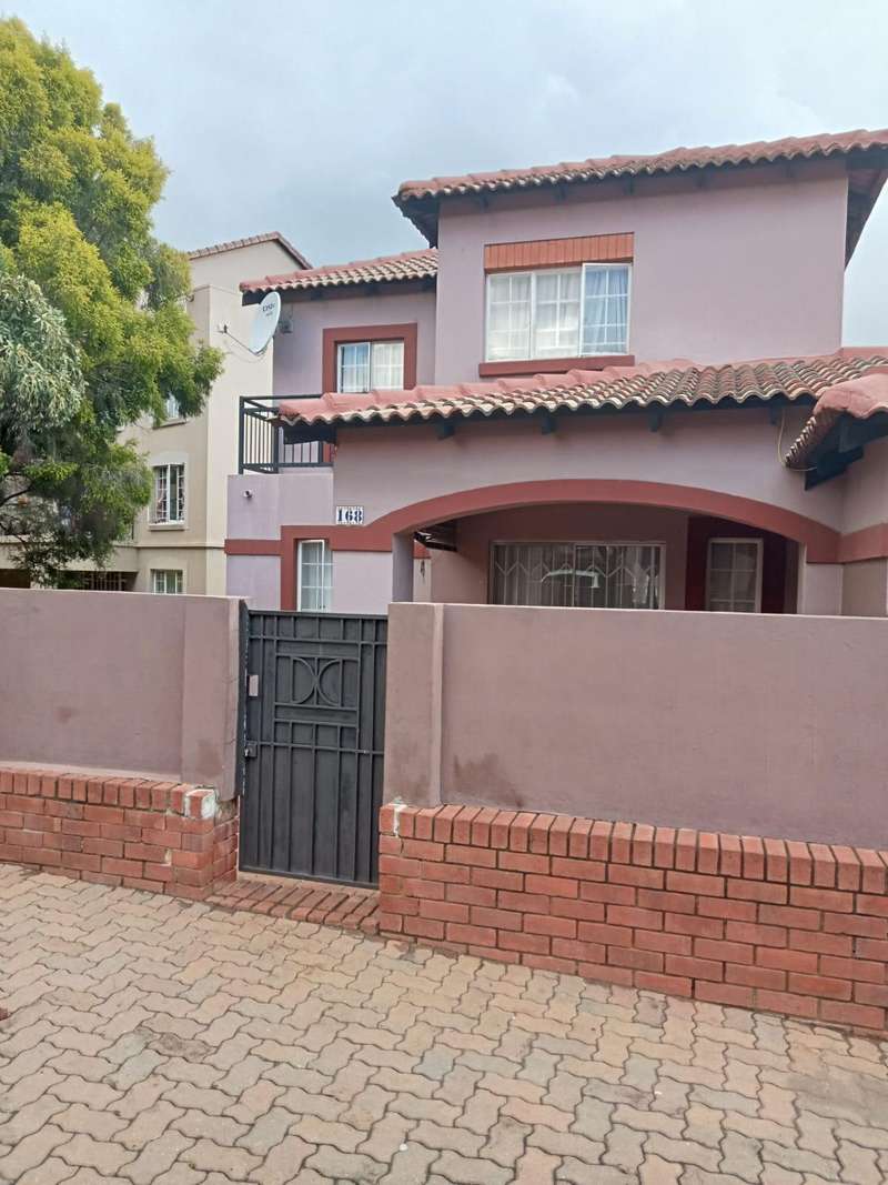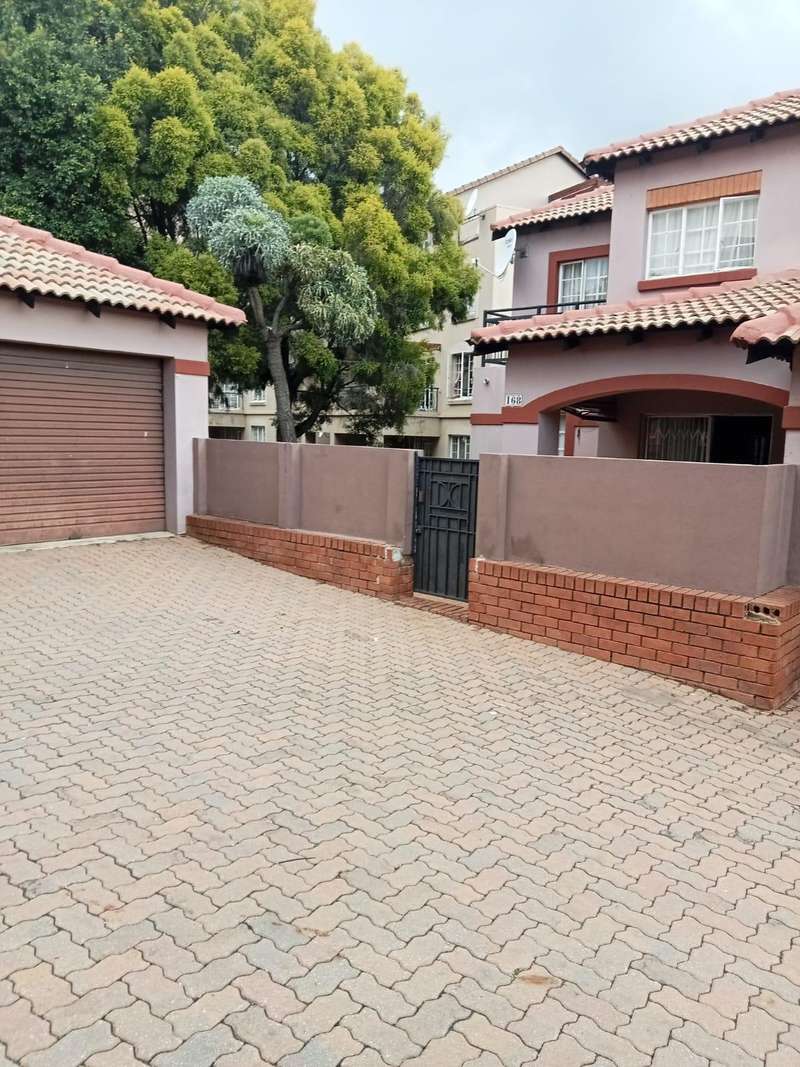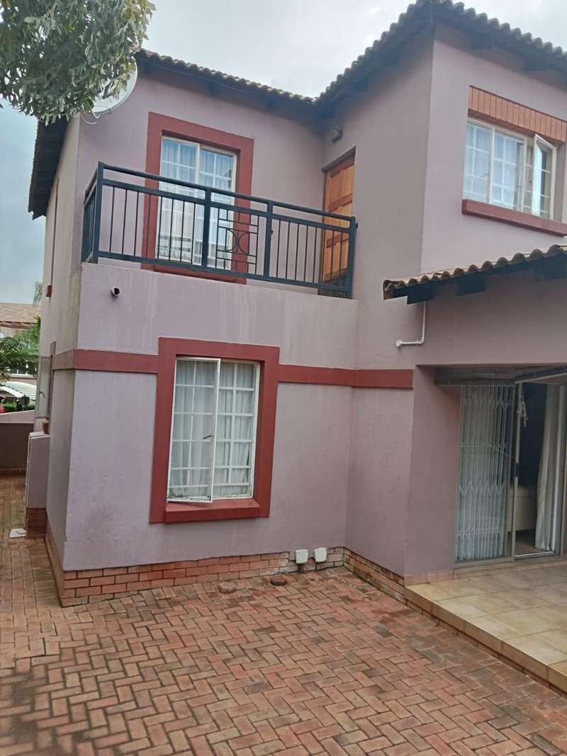 Immaculate 3 bedroom townhouse located in a beautiful area, with a river flowing inside the complex giving a beautiful environment. It consists of 2 bedrooms, 2 bathrooms, upstairs, a 3rd bedroom on the ground floor and a toilet, open plan kitchen and lounge, double garages enough space for garden.