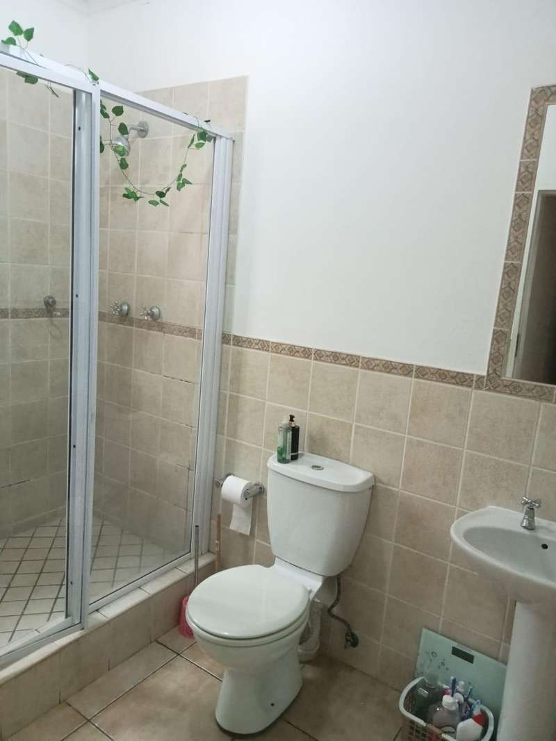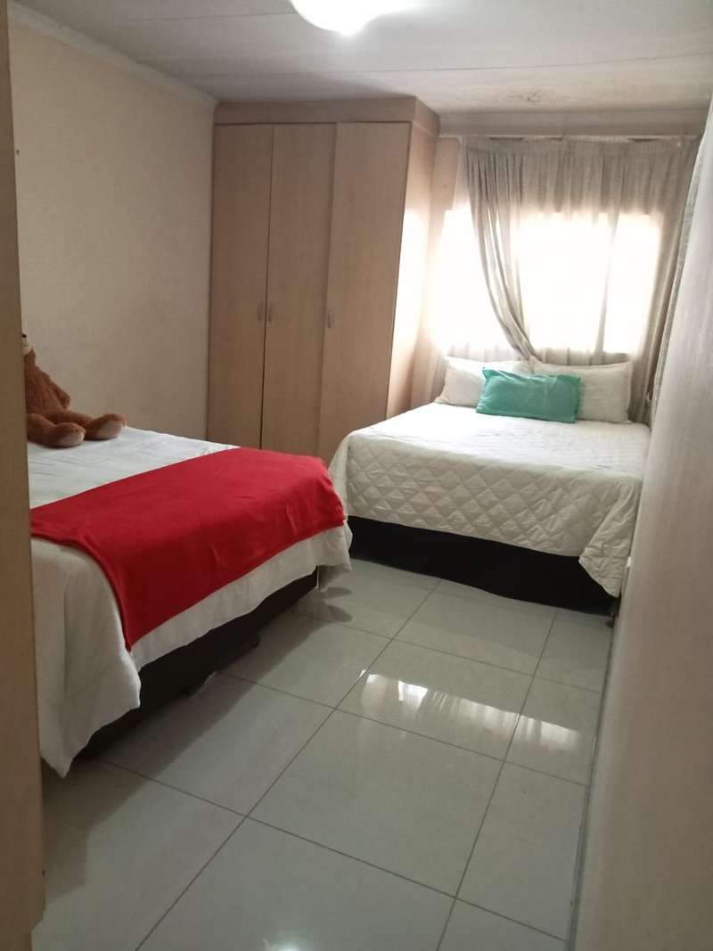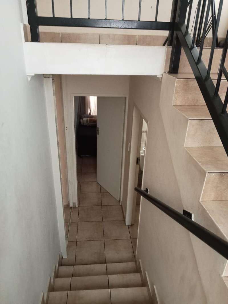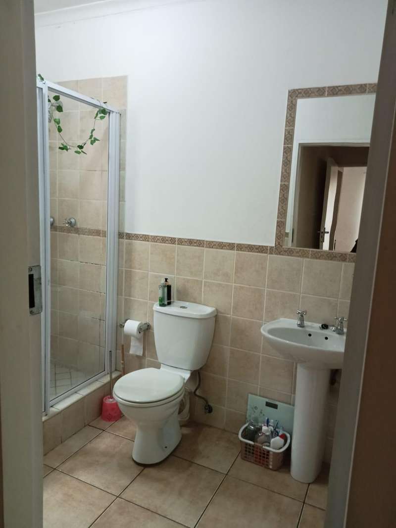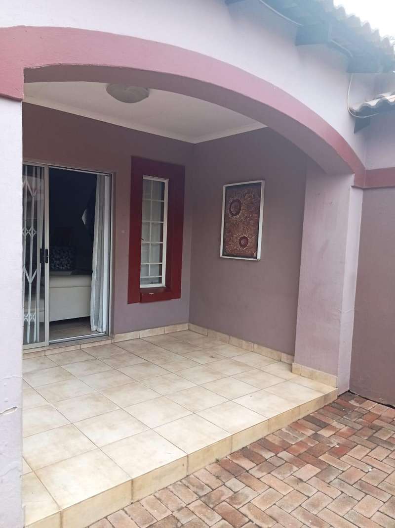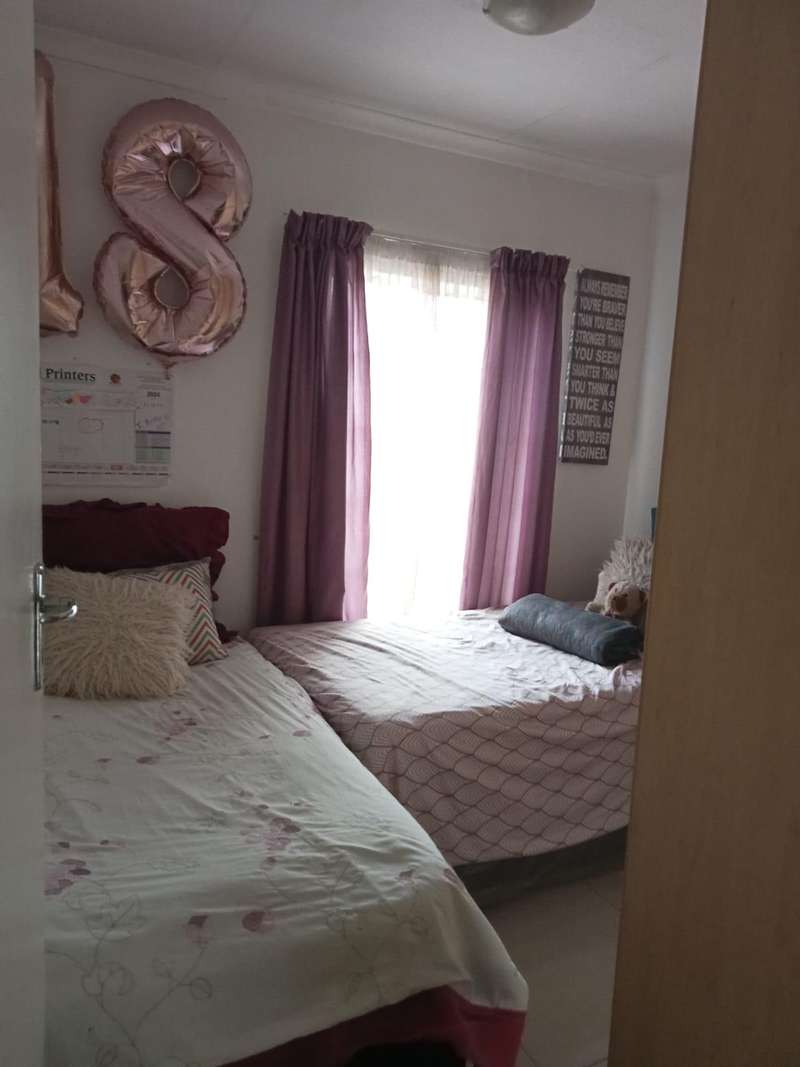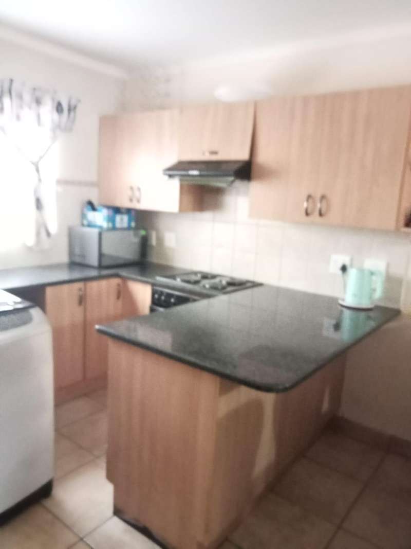 Immaculate 3 bedroom townhouse located in a beautiful area, with a river flowing inside the complex giving a beautiful environment. It consists of 2 bedrooms, 2 bathrooms, upstairs, a 3rd bedroom on the ground floor and a toilet, open plan kitchen and lounge, double garages enough space for garden.