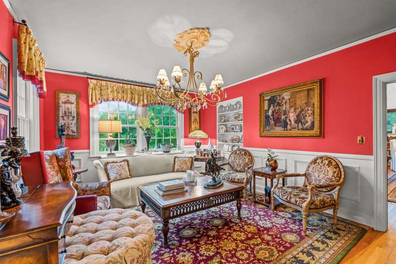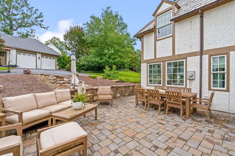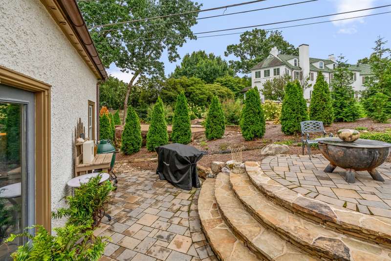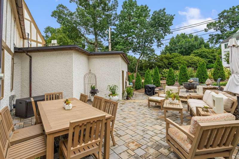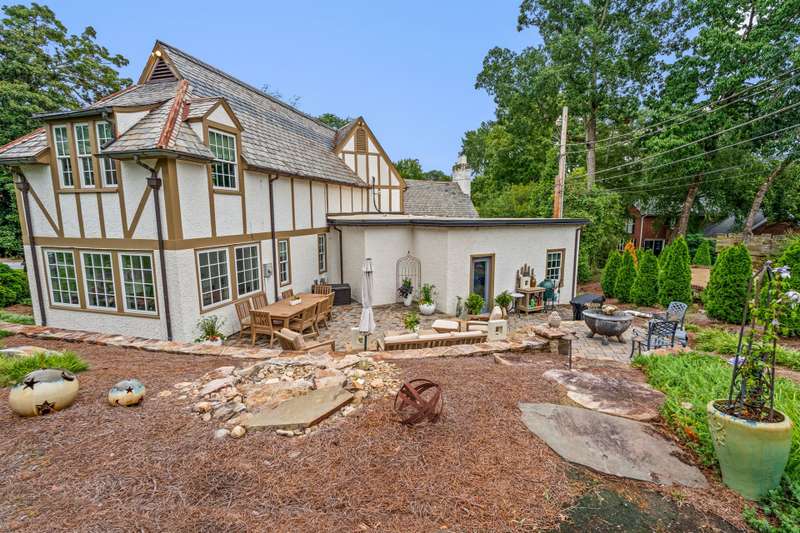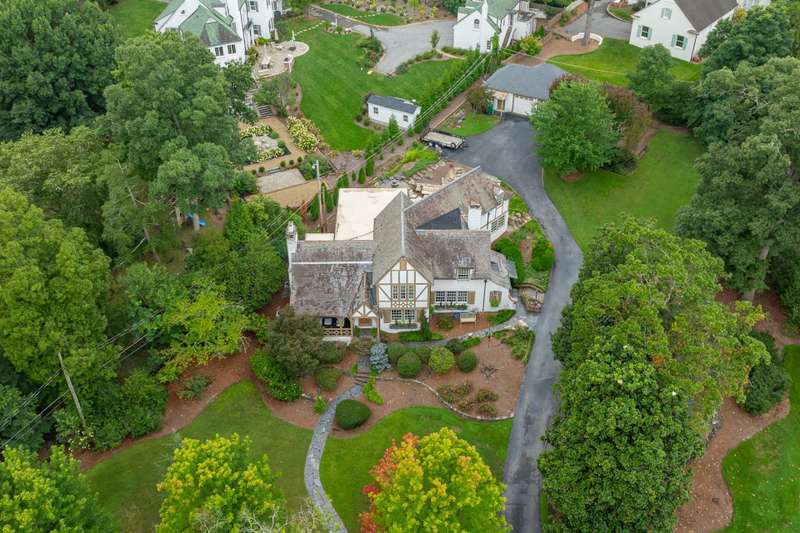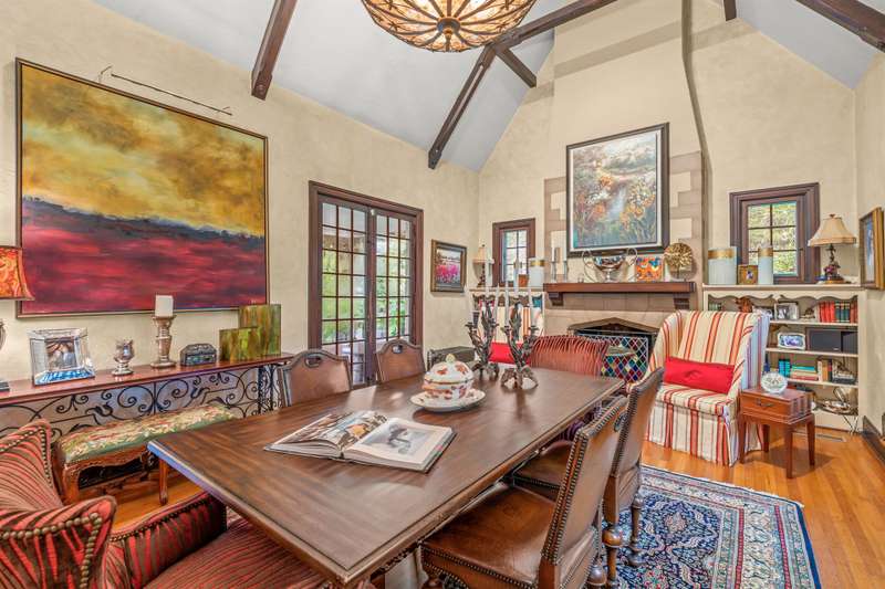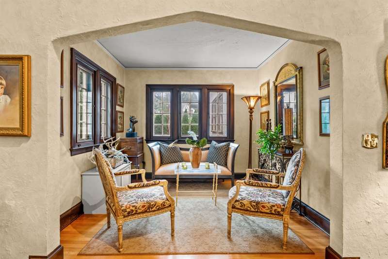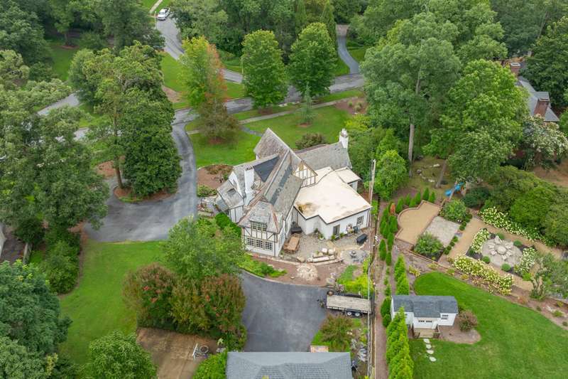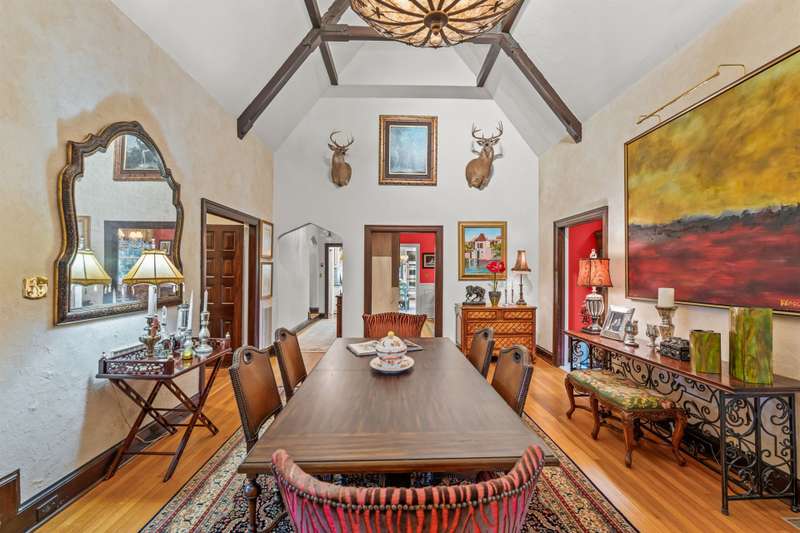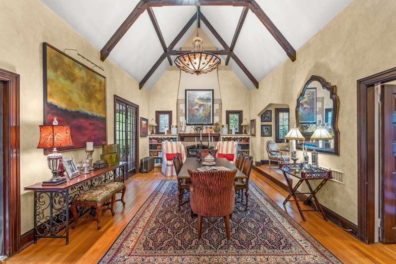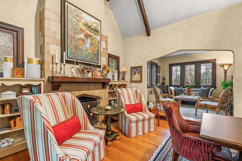 An English Tudor with stunning architectural features. Including arched doorways, exposed wood beams and a prominent stone fireplace in the large open living room. A storybook foyer with marble floor entering into a very versatile floor plan with lots of living space including a piano nook overlooking the living room that could be used as an office. As well as a sitting room nestled in the main level ensuite bedroom. The oversized family room has built-ins, wormy maple hardwoods and a wet bar closet all leading to a large stone patio with a water feature. Property includes three lots appointed with stone walls, slate walk-ways, gorgeous landscaping and a concrete pad with a basketball goal. The detached garage has a much needed storage room! The updated covered porch is like a vacation getaway right at home perfect for watching the sunrise. The kitchen is large enough for any size gathering and includes a Thermador six burner gas stove and double ovens.
