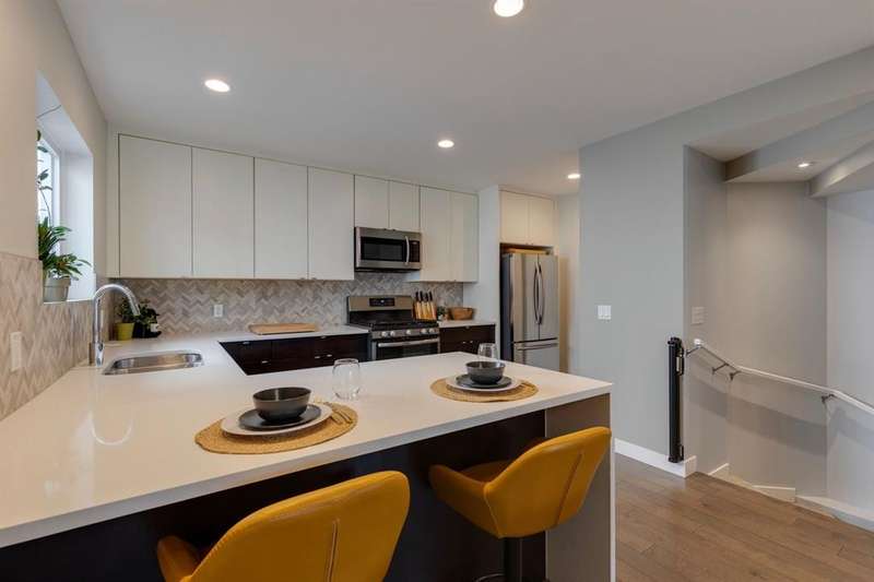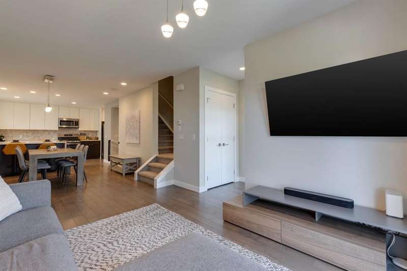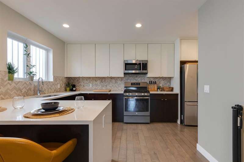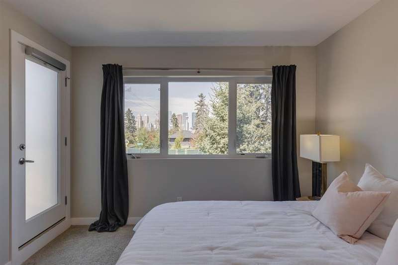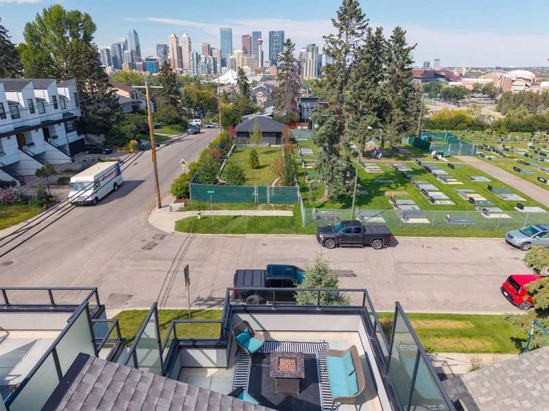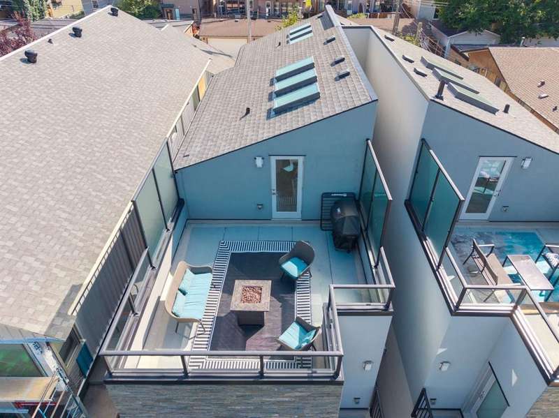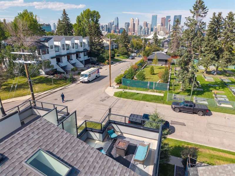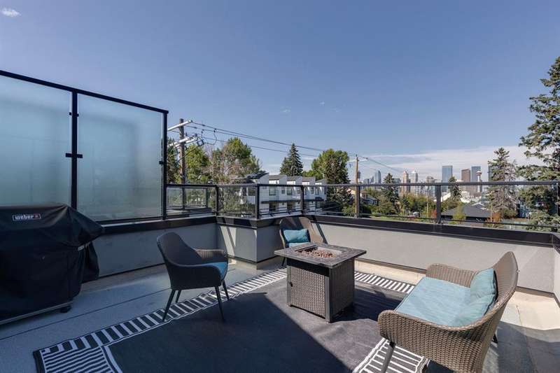 ** Open House Saturday September 27 & Sunday September 28 from 1 - 4pm** Nestled on a serene street in the prestigious community of Erlton, this exquisite townhouse offers an unparalleled blend of elegance and urban convenience. Just a short walk to Mission and the charming Roxboro dog park, this home is perfectly situated for those seeking a vibrant yet tranquil lifestyle. The main floor welcomes you with its rich hardwood floors, soaring 9-foot ceilings, and fresh paint, creating a bright and inviting atmosphere. The living room, bathed in natural light, opens onto a private front deck, while the dining area provides ample space for entertaining. The kitchen is a chef’s dream, featuring 2 tone European-style cabinetry, quartz countertops, a peninsula island adorned with a marble herringbone backsplash, and stainless steel appliances, including a gas range and pantry. Upstairs, the master bedroom is a true retreat, offering breathtaking views of downtown, double closets, and a luxurious en-suite bathroom complete with a soaking tub. A second generously sized bedroom and a well-appointed family bathroom complete this level. The upper loft is a sunlit haven, boasting vaulted ceilings, skylights, and an expansive open space perfect for a family room, sitting area, or home office. Step out onto the rooftop patio to take in the spectacular views of Downtown and Stampede Park, an ideal spot for enjoying fireworks during the Rodeo or Canada Day celebrations. The basement is designed for both function and style, featuring a spacious gym area with industrial-inspired exposed ceilings, a laundry room, and additional storage in the furnace room. This home also includes a single parking spot in the shared detached garage, with ample free street parking available. Offering a seamless inner-city lifestyle without the congestion, this townhouse is the crown jewel of the complex, combining luxury, comfort, and convenience in one remarkable package.
