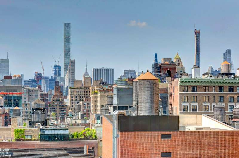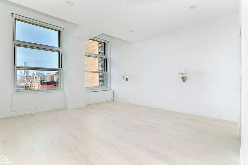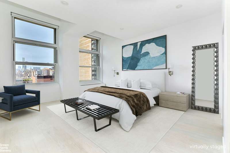 Soaring 14-foot ceilings and expansive soundproof windows with electric shades create a sense of light and space throughout the home. Rich white oak floors, recessed lighting, and custom finishes elevate the interior ambiance. The open-concept chef's kitchen is outfitted with top-of-the-line Bosch stainless steel appliances, including a 5-burner gas stove, dishwasher, microwave, and a sleek Kraus deep sink. Caesarstone countertops, floor-to-ceiling white cabinetry, and a stunning handcrafted blue agate quartz backsplash with LED lighting provide the perfect blend of functionality and modern artistry.