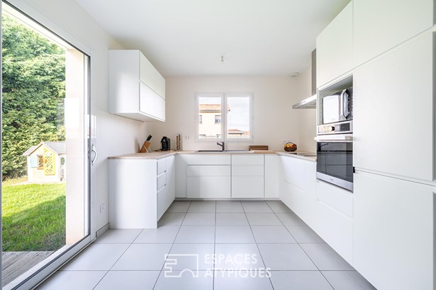 The entrance opens onto a spacious, light-filled living area thanks to its large bay windows overlooking the garden. The living space, both welcoming and uncluttered, flows into an open-plan, fitted and fully equipped kitchen, designed to combine aesthetics and functionality. An adjoining utility room completes the living area.