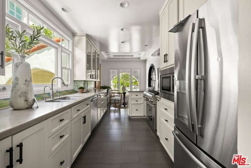 Lovely private Spanish oasis in the heart of Beverly Grove, just blocks from the Grove, fine dining, LACMA and the Beverly Center. Nestled in a quiet residential pocket, this 1930's romantic Spanish offers original details with modern amenities. Enter your new home through a gated courtyard into the entry with high circular turret and soak in the sunken living room that features soaring ceilings with exposed beams, a huge picture window and a magnificent fireplace. Separate dining room with original coved ceilings, bar counter/pass through to the kitchen and magnificent arched wood and glass doors that lead to the kitchen. The remodeled kitchen offers quartz counters, custom white cabinets and lovely eat-in area with built-in bench seating. The primary bedroom features new French doors that lead to a newly built deck that overlooks the grassy back yard and rear patio with pergola, perfect for entertaining and el-fresco dining. This residence includes 2 Additional oversized bedrooms, charming writing area, mostly brand-new windows and doors, 1 year old HVAC and wood flooring. The Tranquil backyard includes fruit trees, lush landscaping, a generous patio and a newly remodeled converted garage with bathroom, perfect for a studio, home office or guest suite.. With great charm and privacy, this is a home that rarely comes on the market and should not be missed.