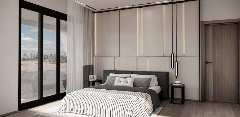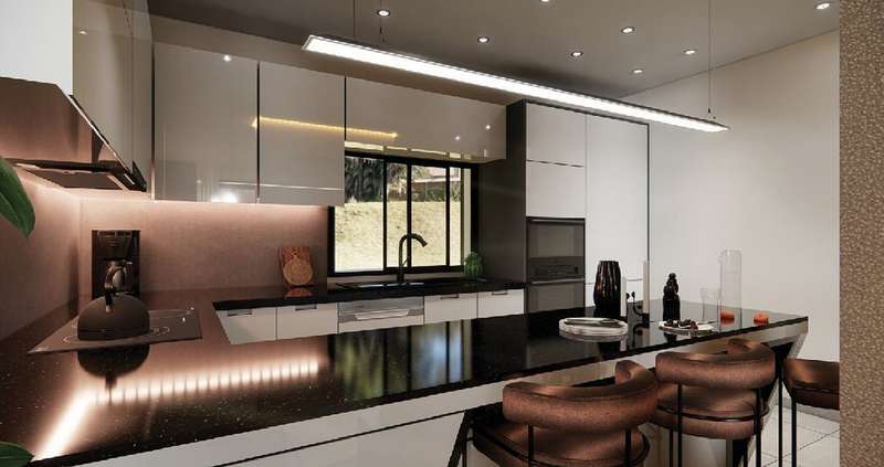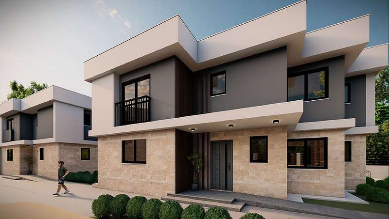 Inside, the villas offer a spacious living room, entrance hall, kitchen, shared bathroom, five bedrooms, a dressing room, en-suite bathroom, storage room, laundry room, technical room, private cinema room, balconies in the bedrooms, a sauna, and a fireplace. All materials used within the villas are of the highest quality, crafted with superior workmanship. Features include underfloor heating, infrastructure for air-conditioned cooling systems, wooden and ceramic flooring, aluminum-framed insulated glass windows, premium marble and stone details, high-quality decorative wall paints, lacquered kitchen cabinets and doors, and robust steel entrance doors.