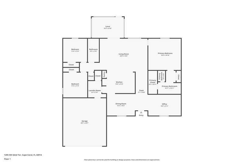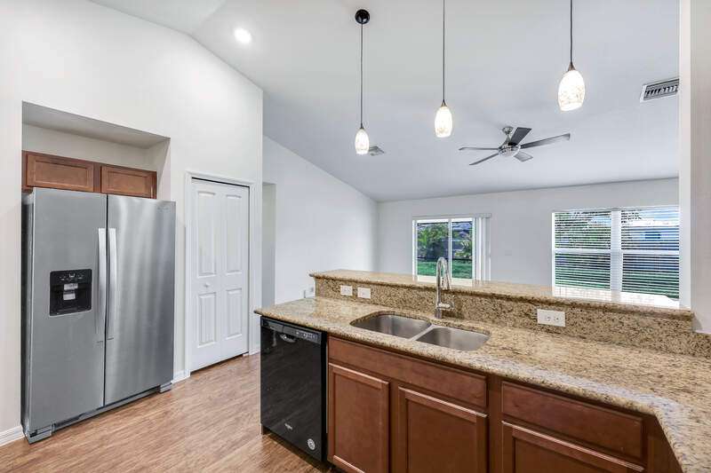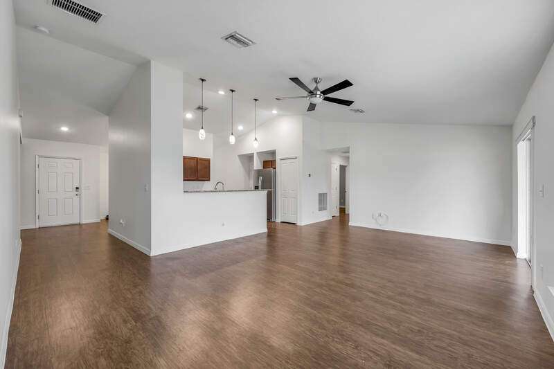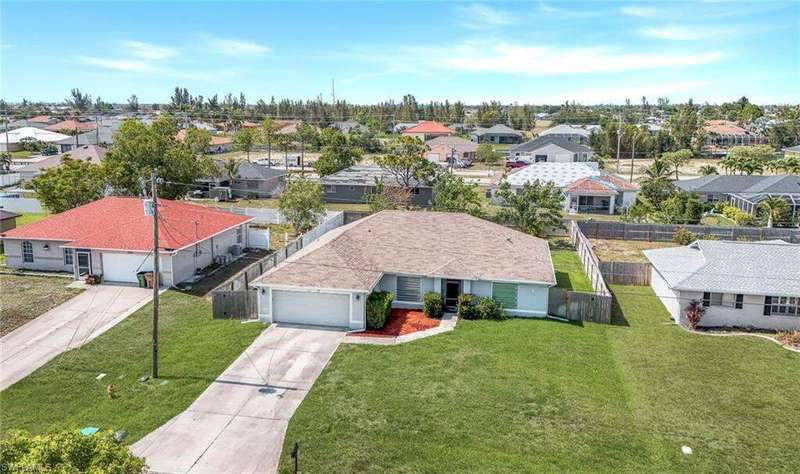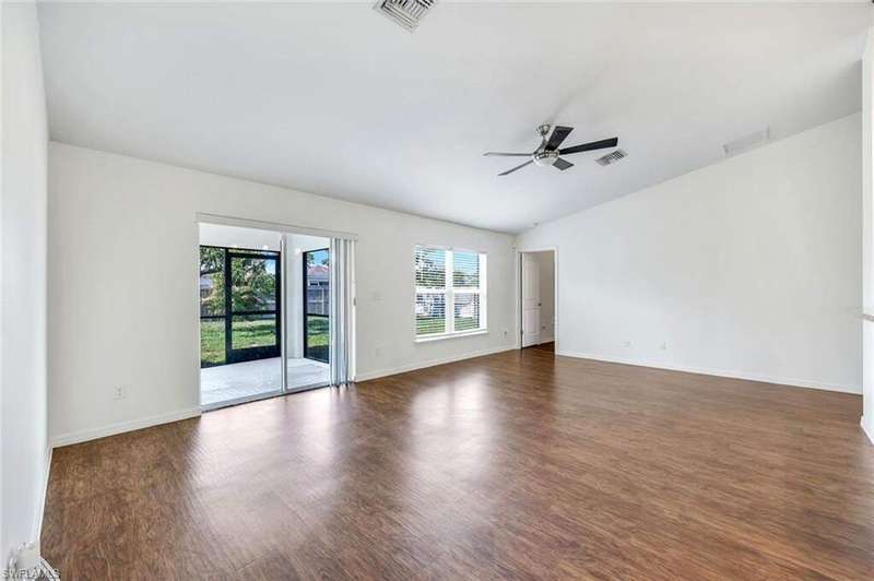 Welcome to this 2018 build - IMMACULATE home - which has water & sewer ALL ASSESSMENTS PAID and is NOT IN A FLOOD ZONE! The floorplan offers 1865 sq. ft., 3 bedrooms 2 baths, living room, separate dining room, BONUS ROOM FOR A DEN OR OFFICE, separate laundry room, large lanai and a 2 car garage. Inside you will find the kitchen and living room are spacious and have a vaulted ceiling. Beautiful laminate flooring and fresh paint throughout the whole house as well . Sit on your private screened lanai enjoying the peaceful backyard with a full privacy fence. NO HOA and investors are welcome with no rental restrictions. The perfect location puts you a short distance from downtown Cape Coral!