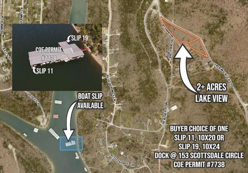 LAKE VIEW LOT, 2+ ACRES, BOAT SLIP AVAILABLE, COMMUNITY WATER, NEAR BRANSON WEST. Now is the time to buy to make sure you have a place to build your future lake home. Start enjoying Table Rock Lake now with the purchase of a nearby boat slip being offered by the owner of the lot for an additional $50,000. You will have your choice of one of two boat slips in the dock on the shoreline below 153 Scottsdale Circle, Branson West. Slip #11 a 10 x 20 or slip #19 a 10 x24 and this dock features a nice swim deck. Connection to subdivision community water well is available and 1200 minimum square feet on ground floor. Zoned R-1 for single-family residential use. Conveniently located near Branson West. Check this one out. Seller prefers Great American Title, Branson West for title and closing.