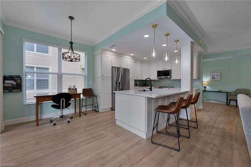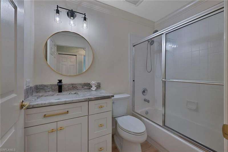 Indulge in modern coastal elegance with this first-floor, light-filled 2BR/2BA end unit, offering the perfect blend of lock-and-leave convenience and the ease of single-level living and direct access without stairs, all while showcasing breathtaking sunset views from the spacious screened-in lanai. The sophisticated open layout features a new chef-inspired kitchen with a large quartz island offering undercabinet storage on both sides, LG stainless steel appliances (dishwasher and refrigerator include extended warranties), slow-close custom cabinetry, and designer lighting and fixtures throughout. Updated baths, luxury vinyl plank flooring, and a laundry/mud room off the garage further enhance the home. Offered furnished for an effortless, move-in-ready lifestyle, this residence is equally suited as a seasonal retreat, full-time residence, or rental opportunity. The exterior is scheduled to be painted off-white by the end of the year. Set within a quiet, gated community just minutes from shopping, fine dining, RSW Airport, and Gulf beaches.