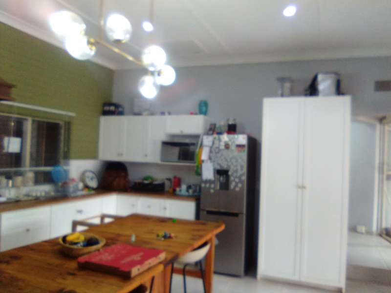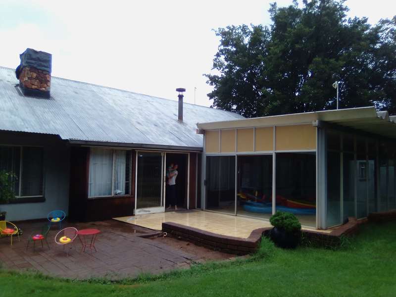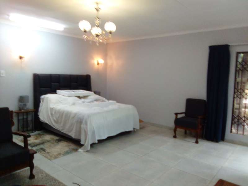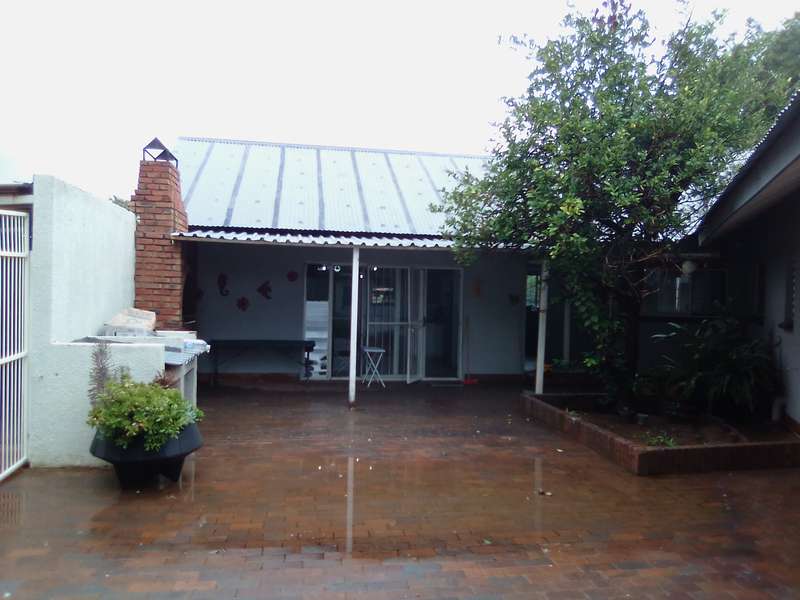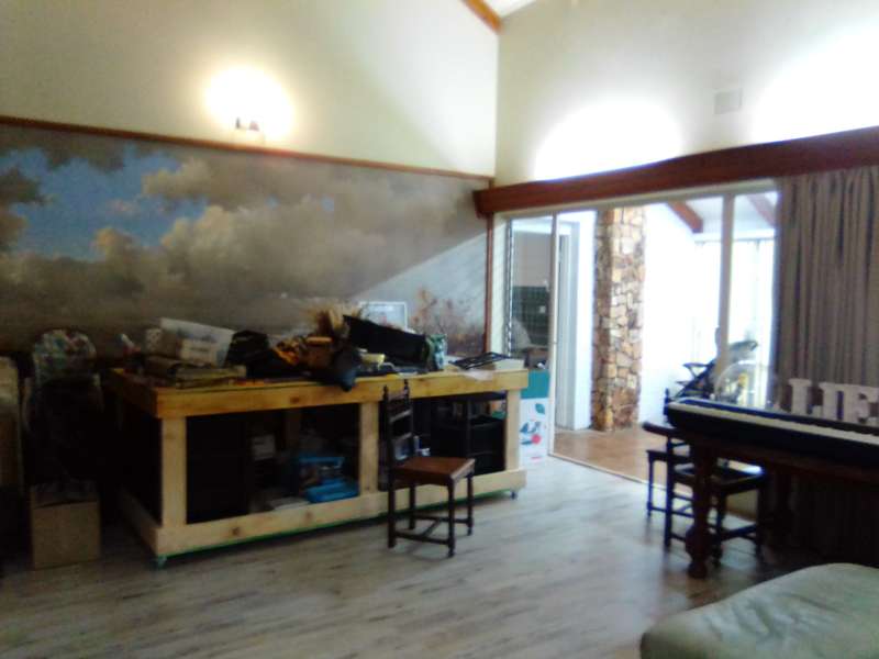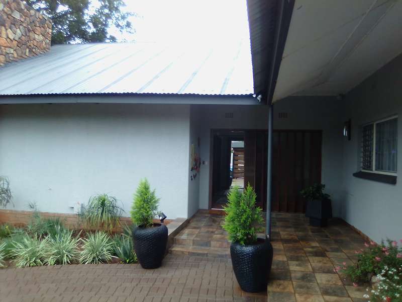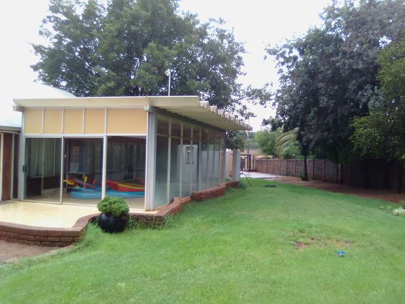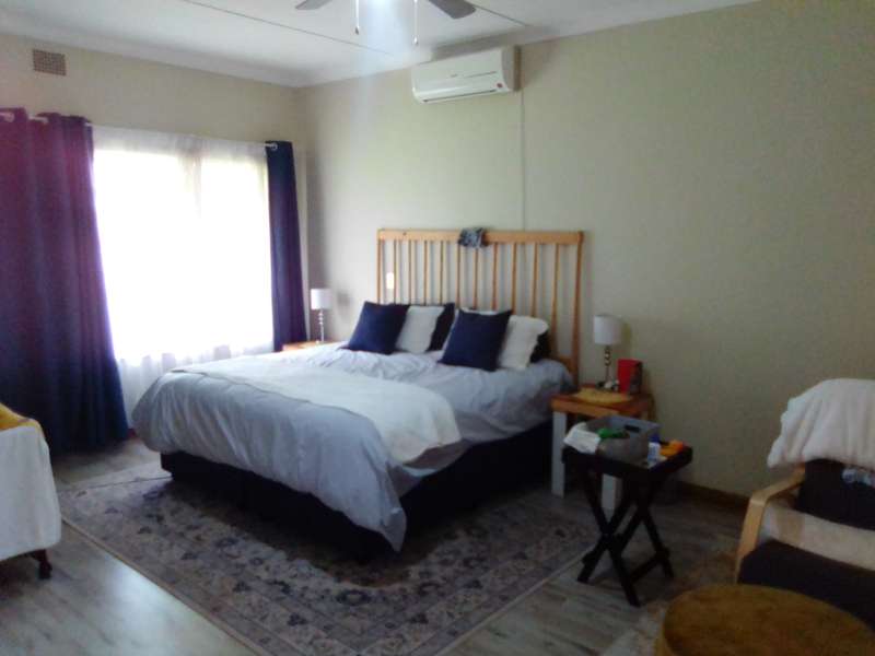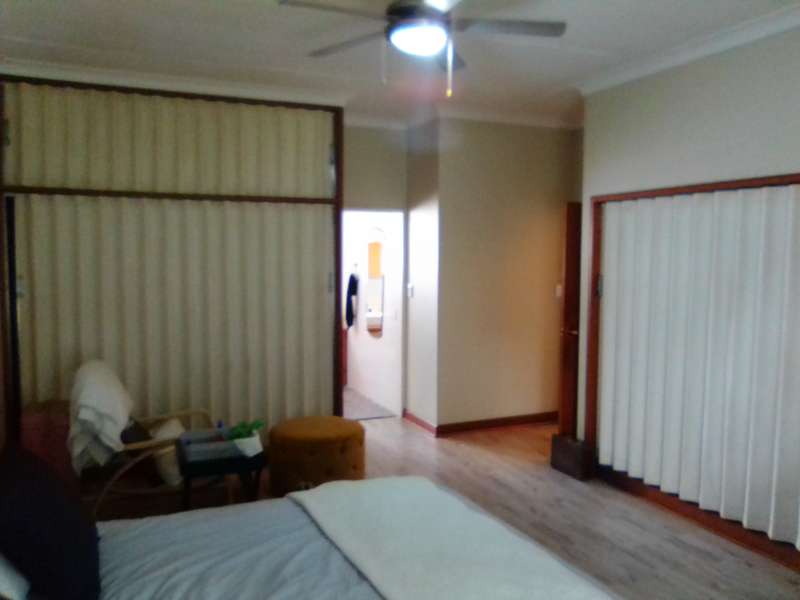 Entering the property into a entrance wall on the left side you enter a living area in to a on bedroom flat with a kitchen bath room lounge and bedroom on the right side you find a passage on the left side a spacious lounge with a door to the outside and a sunroom/entertainment area . on the right the dining room going into the kitchen with cupboards stove and a separate wash up at the kitchen side leading into the garages. There is 4 bedrooms with cupboards two bedrooms with aircons and to with ceiling fans an en - suite bathroom with bath basin and toilet at the main bedroom and a guest with a shower bath and basin with a separate toilet Outside the kitchen to the back yard is a built braai Two bachelor flats each with there own bathroom Double garage an a tandem garage electric fencing 2 boreholes of witch one is equipped and one without a pump There is two separate entrances at the garages and the other one at left side going to the flats a electronic gate and garage doors.