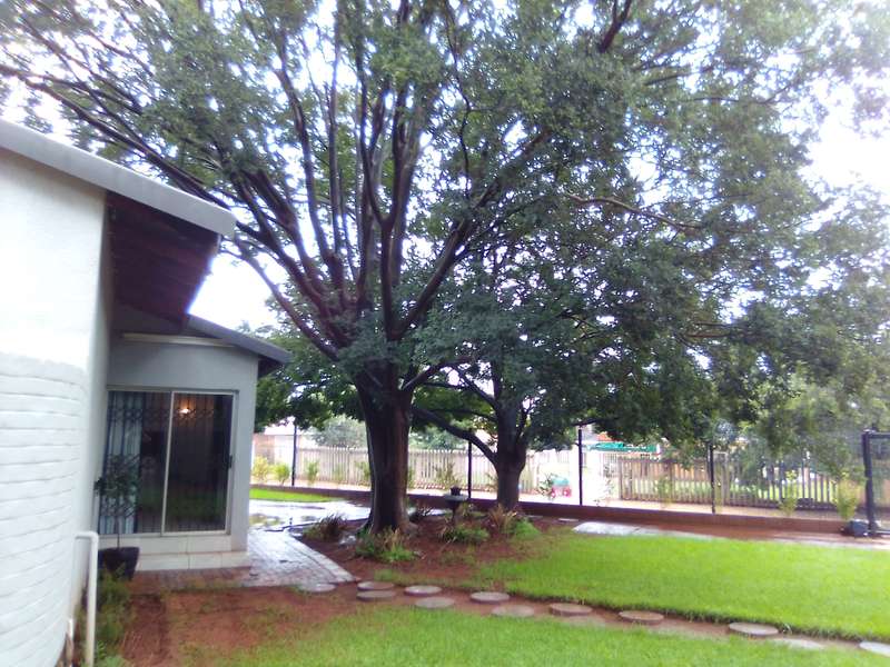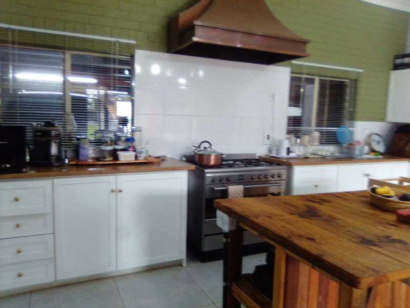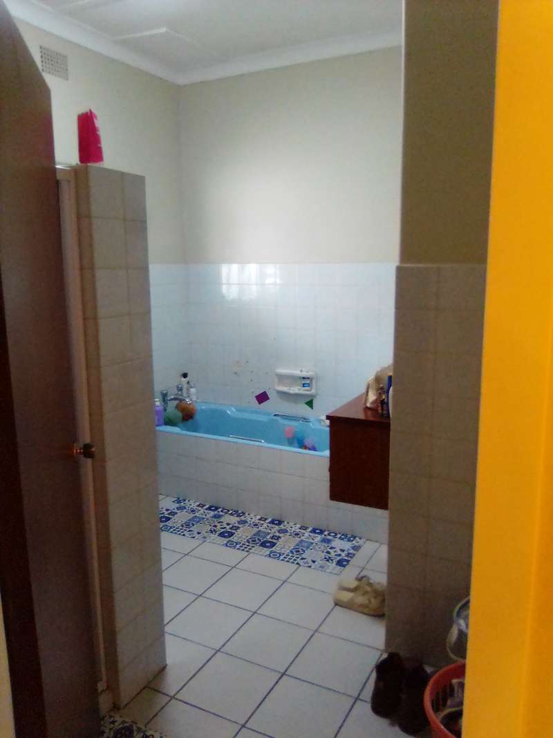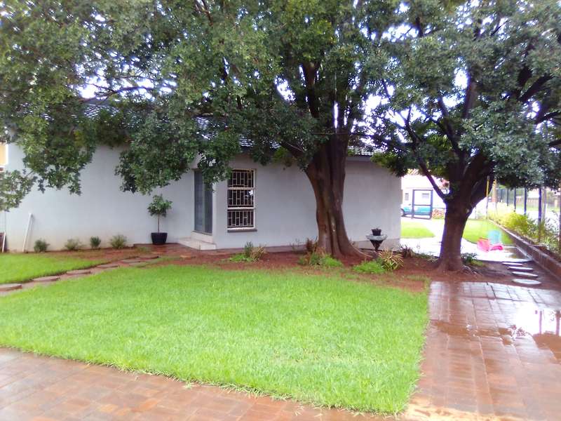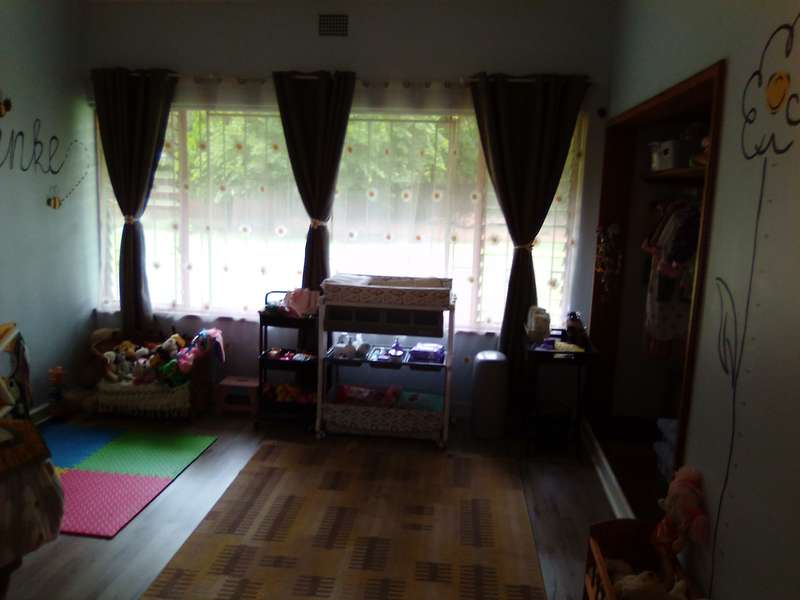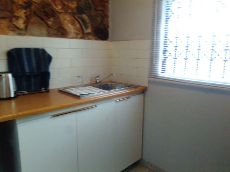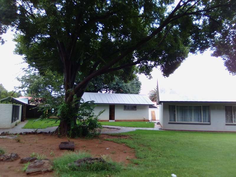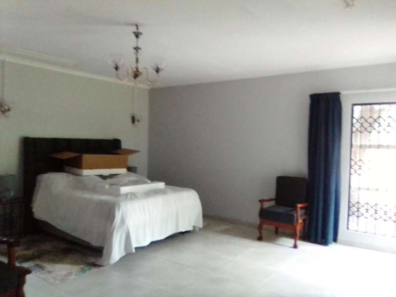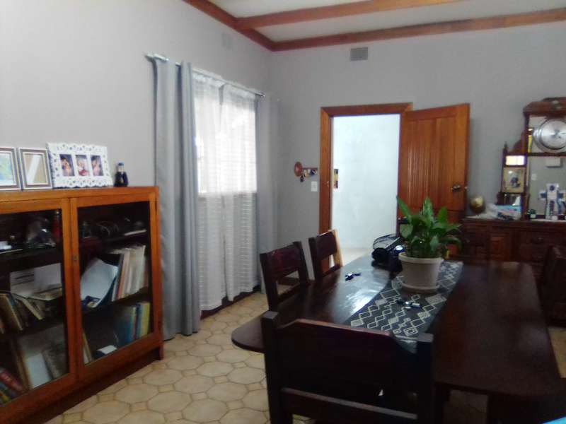 Entering the property into a entrance wall on the left side you enter a living area in to a on bedroom flat with a kitchen bath room lounge and bedroom on the right side you find a passage on the left side a spacious lounge with a door to the outside and a sunroom/entertainment area . on the right the dining room going into the kitchen with cupboards stove and a separate wash up at the kitchen side leading into the garages. There is 4 bedrooms with cupboards two bedrooms with aircons and to with ceiling fans an en - suite bathroom with bath basin and toilet at the main bedroom and a guest with a shower bath and basin with a separate toilet Outside the kitchen to the back yard is a built braai Two bachelor flats each with there own bathroom Double garage an a tandem garage electric fencing 2 boreholes of witch one is equipped and one without a pump There is two separate entrances at the garages and the other one at left side going to the flats a electronic gate and garage doors.