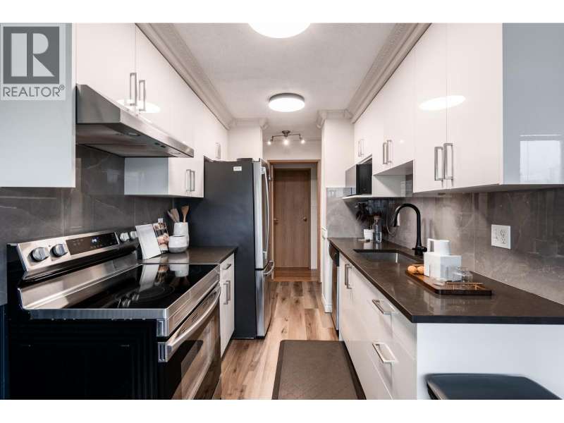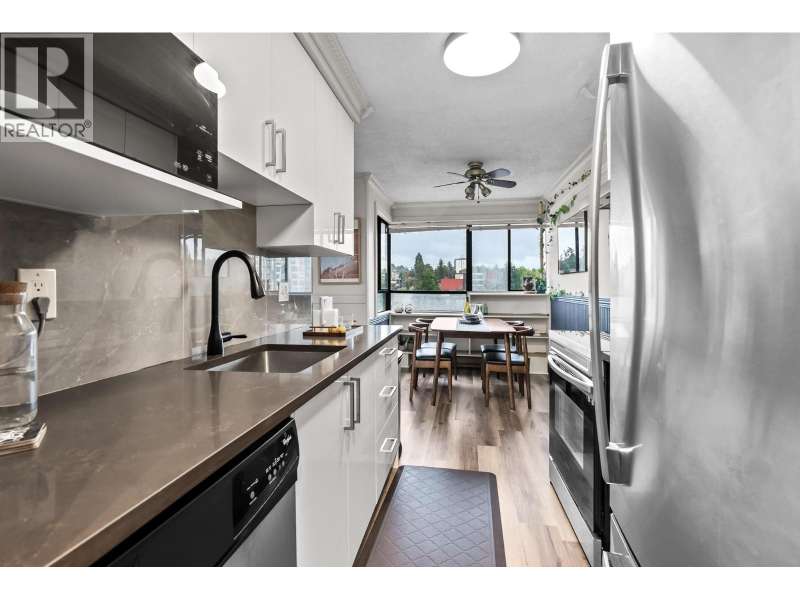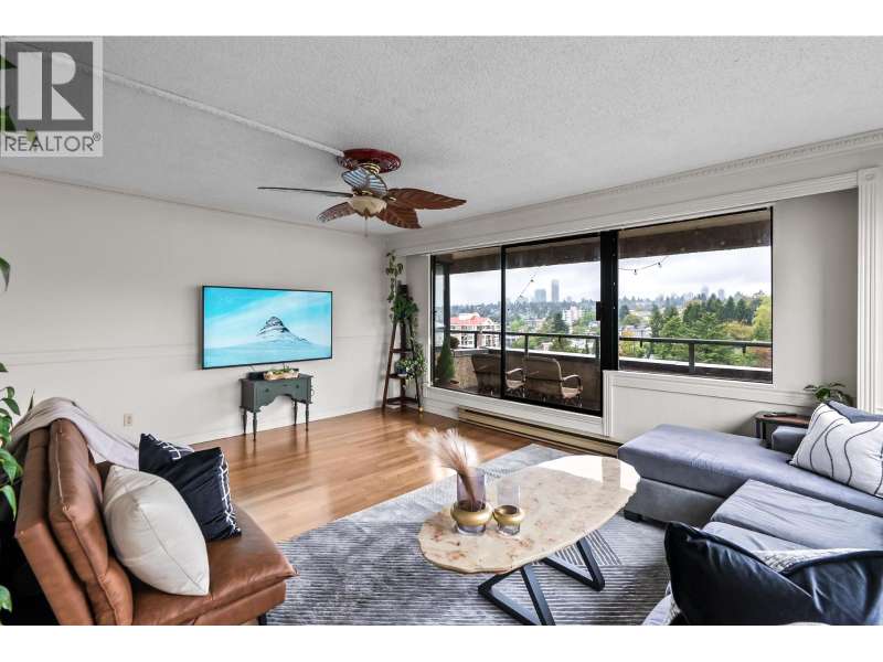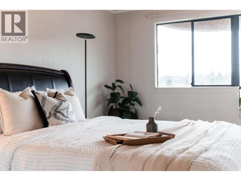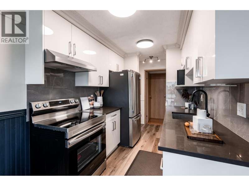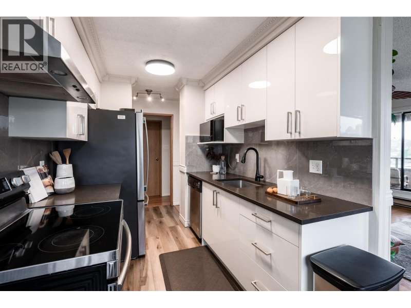 Great value in this light and bright corner 2 Bedroom + 2 Bathroom Penthouse level unit in the heart of New Westminster ! This home boasts an extremely large Living Room with plenty of room for entertaining & is flooded with natural light. The recently renovated kitchen features bright white cabinetry, quartz countertops & stainless steel appliances. The dining room is situated off of the kitchen, framed by windows overlooking the open view. Bring your house sized furniture, as the primary suite is large enough for a king sized bed & includes an ensuite. This building features outdoor pool, games room, & underground parking. Walking distance to New Westminster Skytrain Station, Douglas College, grocery stores, restaurants & more. Comes with 1 Pkg & 1 stg. Call for your private showing ! (id:58403)