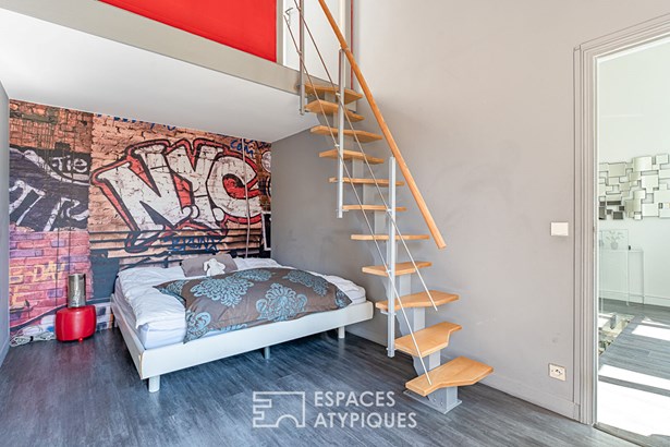 From the entrance, the staircase leads to a large landing overlooking the living room, which distributes on one side a beautiful 13 sqm bedroom, air-conditioned, with balcony and its 6 sqm mezzanine space open to the living room, ideal for an office area.