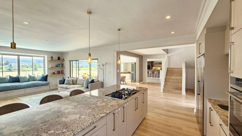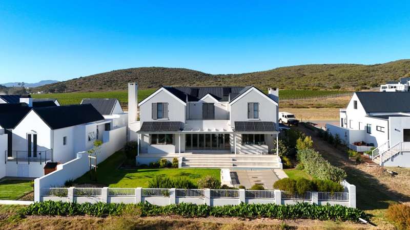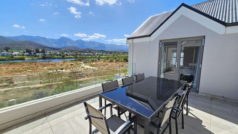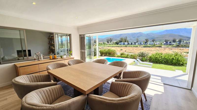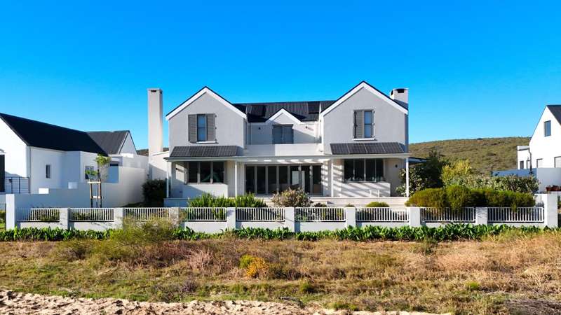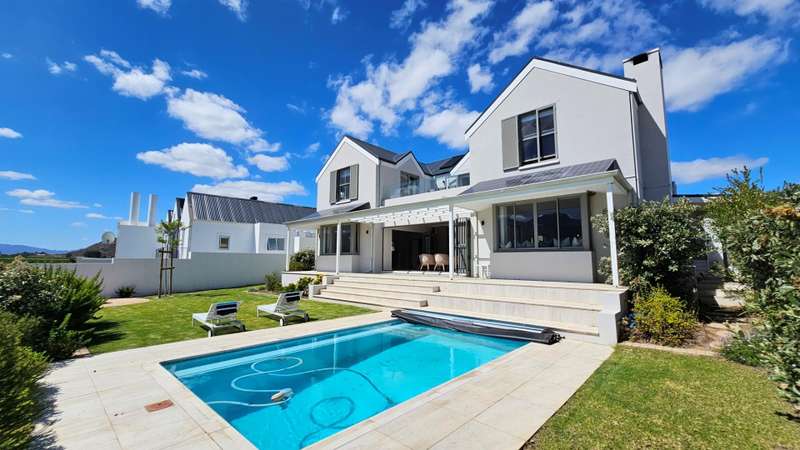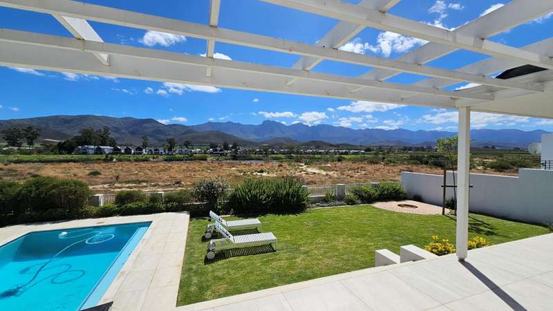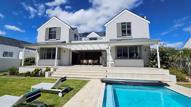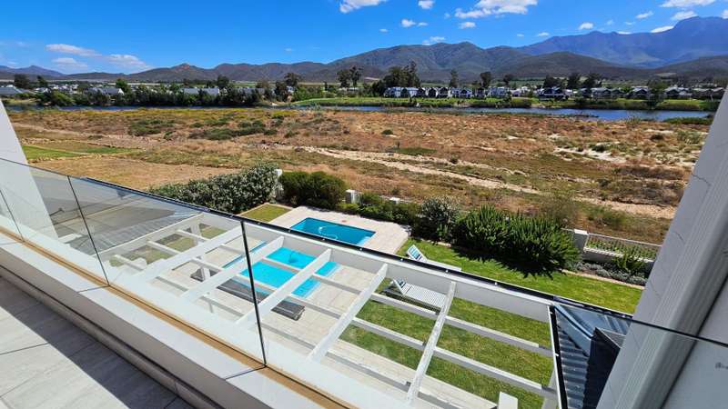 EXCLUSIVE MANDATE: This distinctive modern home, set within the 24-hour gated Silwerstrand River Estate, captures sweeping views of the Langeberg Mountains and Breede River the moment you step inside. The ground level offers light-filled, open-plan living spaces designed for easy flow and modern comfort. The lounge features a built-in window seat where you can enjoy your morning coffee while soaking in the north-eastern views. The dining area extends seamlessly to the garden and sparkling swimming pool, creating an all-season space for family and friends. The entertainment area is a true showpiece, complete with a built-in braai, bar counter, jacuzzi, and clever ice bucket slots alongside the sliding windows assuring the views are always center stage. The striking, modern kitchen is fitted with premium Siemens appliances and includes a separate scullery and pantry for convenience. A versatile air-conditioned bedroom on the ground floor doubles perfectly as a home office or children?ÇÖs playroom, with a bathroom nearby. Upstairs you?ÇÖll find three bedrooms and two bathrooms, two of which open onto a private patio. The main en-suite impresses with soaring double-volume ceilings and a beautifully designed open-plan bathroom. This home is equipped with an inverter, solar panels and battery backup system, automated irrigation, a fireplace, Fibre connectivity, and guest parking. Experience the best of estate living combined with modern luxury and timeless design in this exceptional Silwerstrand home.