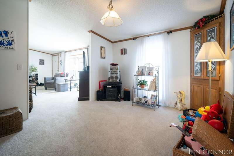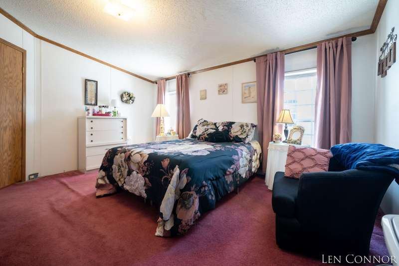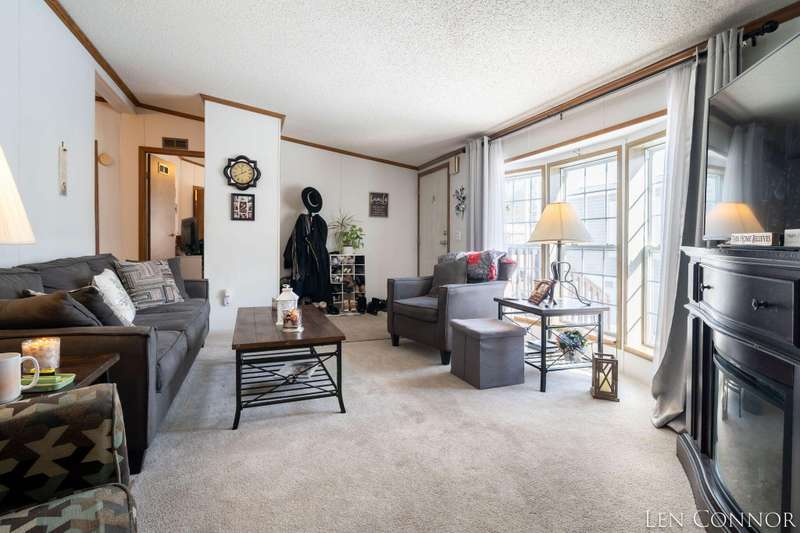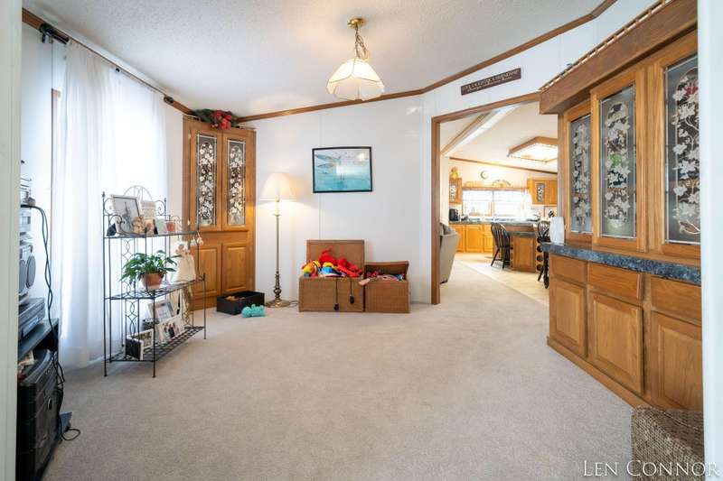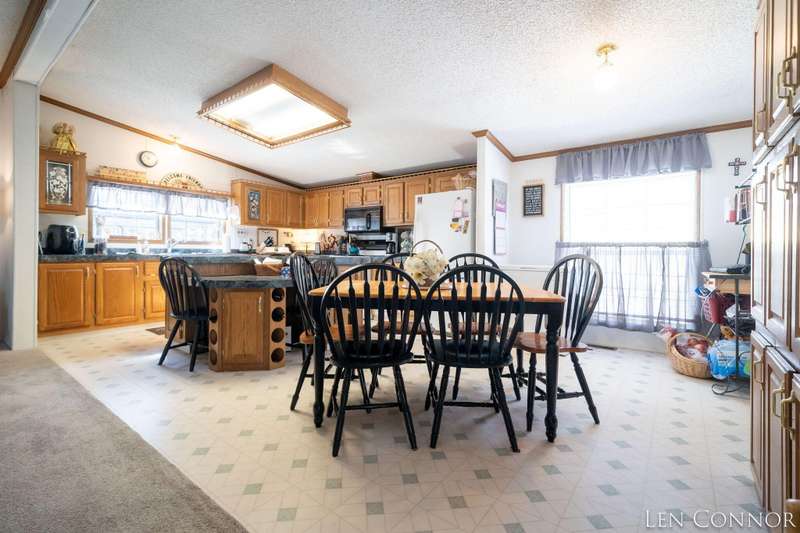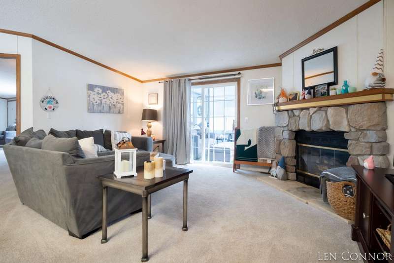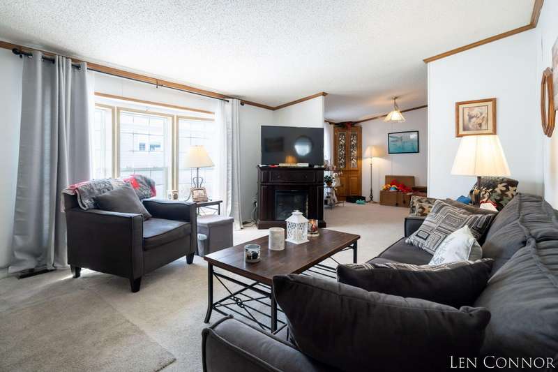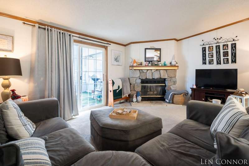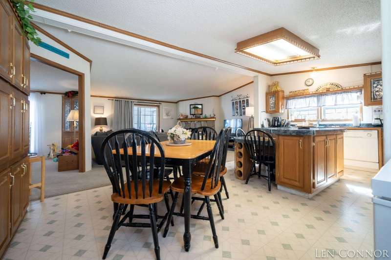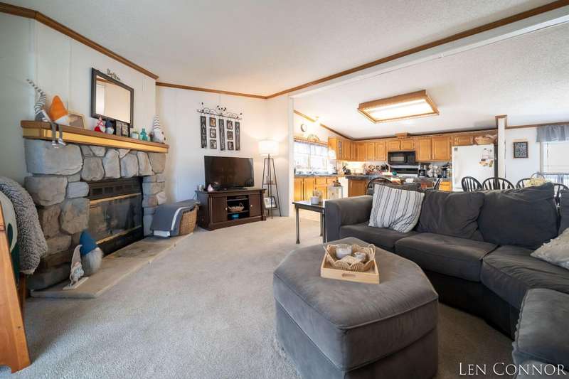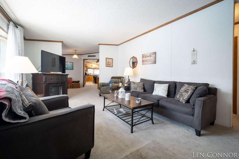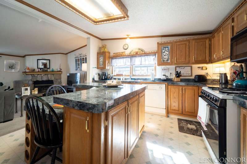 This well-maintained manufactured home offers over 1800 square feet of living space, perfect for those seeking extra room to. Step inside to discover a spacious and inviting layout, highlighted by a beautiful kitchen featuring a large center island-ideal for meal preparation and entertaining. Enjoy a peaceful view with trees right from your kitchen window. The family room, complete with a working fireplace, provides a warm and inviting space to relax and unwind during cooler evenings. Outside, you will find a lovely deck perfect for enjoying your morning coffee or hosting a summer barbecue. In a convenient location with nearby stores and restaurants, everything is just moments away. Schedule your showing today! Possession 45 days or sooner.