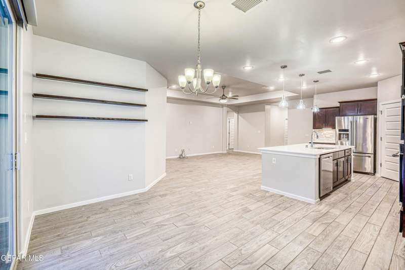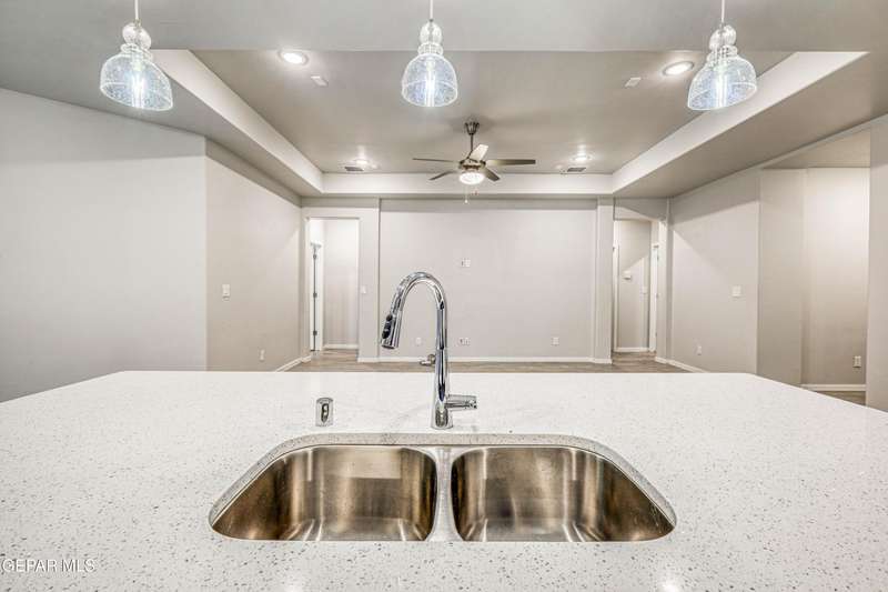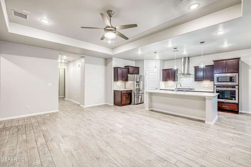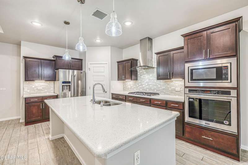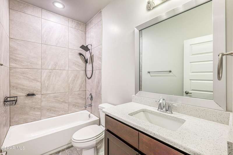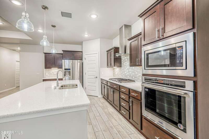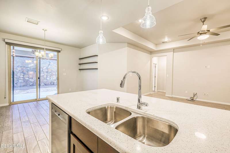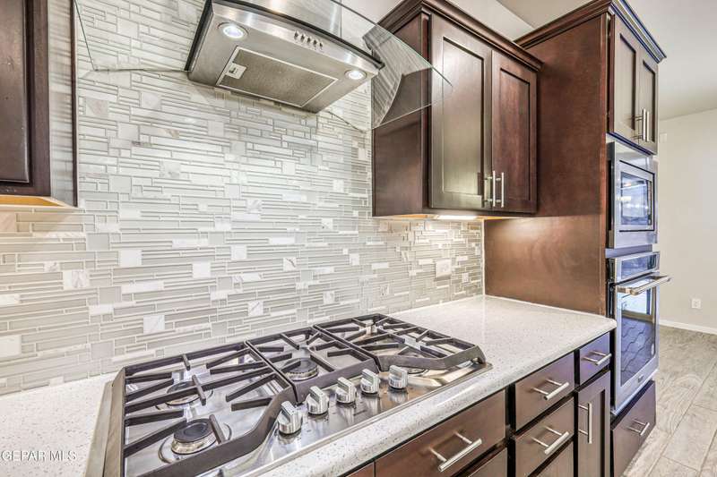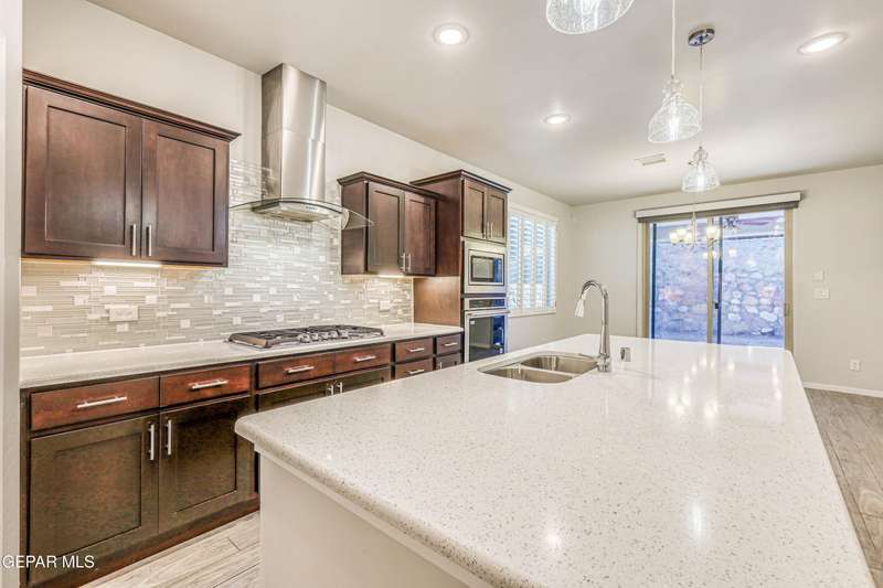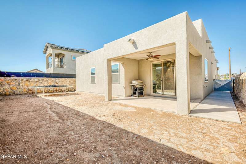 Beautifully maintained 4-bedroom, 3-bath home in the desirable Hillside at Mission Ridge subdivision. This upgraded Hakes Brothers Canyon floor plan offers approximately 2,045 sq. ft. of open, modern living space. Enjoy tile flooring throughout, quartz countertops in the kitchen and bathrooms, under-cabinet lighting, and pendant lighting in the kitchen. The primary suite features an upgraded full-glass shower door, double sinks, and a spacious walk-in closet. Every room includes ceiling fans, tinted windows, and ethernet ports. Additional highlights: refrigerated air, pre-wiring in the living room and patio, keyless front entry, and security cameras. Stainless-steel appliances-refrigerator, built-in microwave, oven, and dishwasher-convey with the sale. Pride of ownership shines throughout, and solar panels will be paid off at closing, providing lasting energy efficiency and savings!