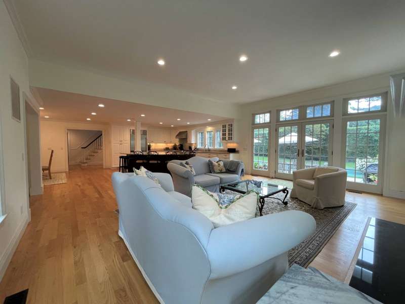 Newly expanded and upgraded East Hampton Village home close to ocean beaches and downtown with approximately 4100 sq. ft. of living space. The house sits on a half acre. with 5 bedrooms, 5 full baths, light-filled living room with fireplace, open kitchen, dining room, den/TV room, central air-conditioning, and 40' heated pool with waterfall and nightlights. The kitchen is fully upgraded with Subzero refrigerator, Viking range, Viking dishwasher, microwave drawer and additional under counter refrigerator. Large kitchen island and granite counter tops. New primary en-suite on second floor includes a queen bed, marble master bath with double sink, shower, bubble soak tub, and walk in closet. Additionally, upstairs, there are three additional guest bedrooms, one ensuite and two of the bedrooms have a shared bath. The laundry room located on the second floor has a new large capacity washer and dryer. Blue stone patio, wood deck and propane BBQ grill. Comfortably furnished and conveniently located.
