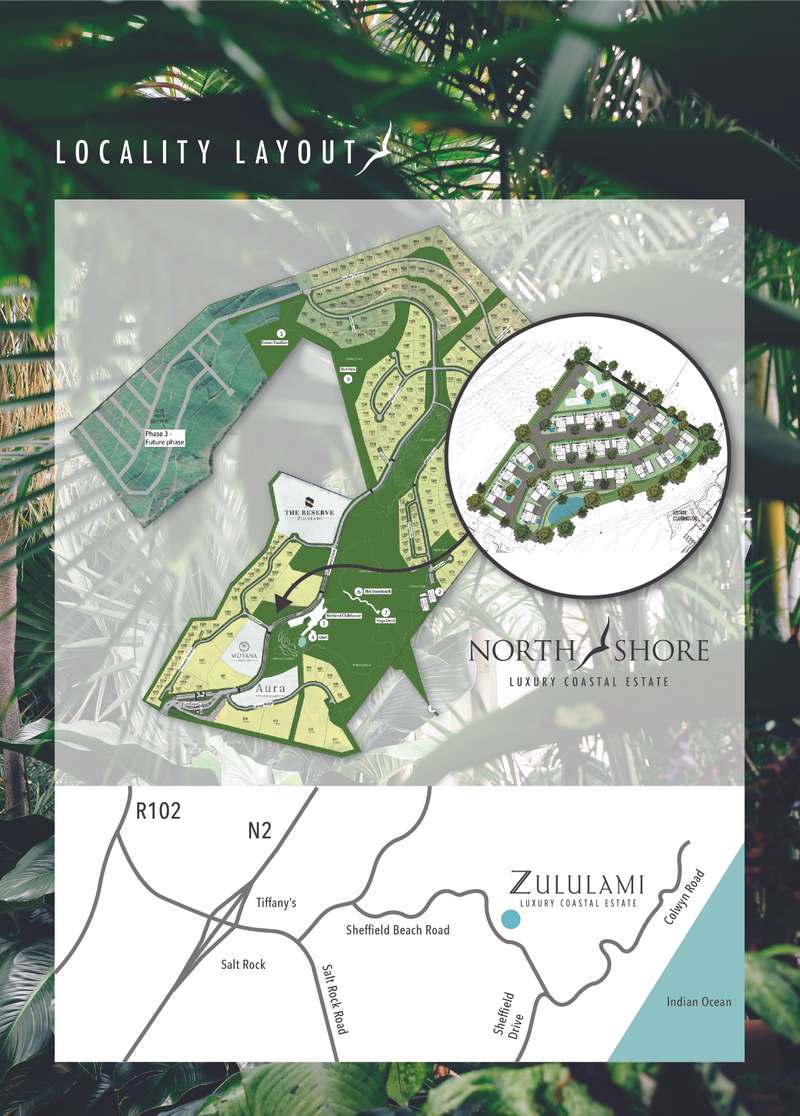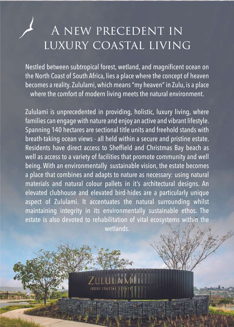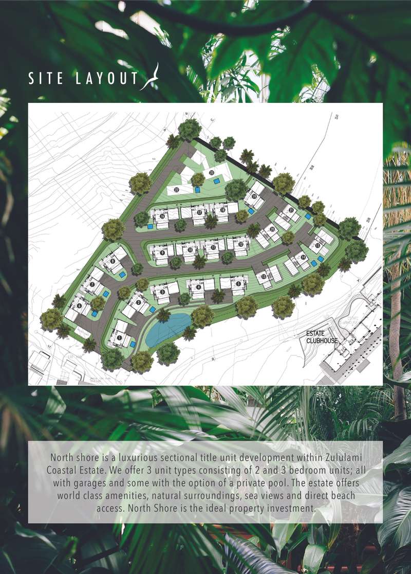 Freestanding 3 bedroom, 2 bathroom Duplex within Zululami Luxury Coastal Estate. The open plan living flows from the kitchen through the lounge and dinning rooms out onto the patio and overlooking the natural wetlands with magnificent sea views in the background. The unit has a garden area with the option of putting in your own pool. There is a double garage. North Shore is situated within the secure and Luxurious Zululami Coastal Estate and residents can benefit from all the facilities within the estate. The wetland & beach clubhouse, outdoor fitness park, kids park and nature trails to name a few!