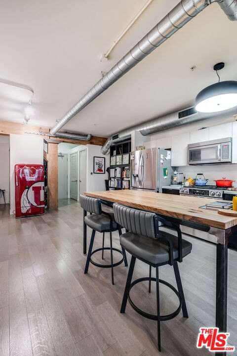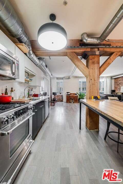Located in the prestigious Barker Block, this stunning residence blends historic charm with modern sophistication. Originally home to the Barker Brothers Furniture Company, this iconic turn-of-the-century brick building was transformed through adaptive re-use by award-winning developer The KOR Group. This unique loft showcases authentic architectural details, including exposed original brick walls, beamed ceilings, and warm wood flooring. The open-concept layout offers a flexible living space ideal for both relaxing and entertaining.Barker Block offers resort-style amenities, including a rooftop pool and spa with panoramic city views, a fully equipped fitness center, inviting community entertaining areas, and an on-site art galleryone of the only complexes in the area to feature such a creative space. Enjoy 24/7 security and a reserved parking space for added convenience. All of this, set in a vibrant and sought-after Arts District location - don't miss this opportunity to own a piece of downtown LA's most iconic residential communities.