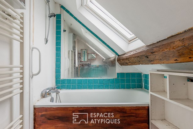 Nestled on the 5th and top floor of a typical 19th-century building in the 11th arrondissement, between Rue des Boulets and Place de la Nation, this unique 30.46 m2 (322 sq ft) apartment (66.21 m2 floor area) captivates with its unique character and treehouse-like atmosphere overlooking the rooftops of Paris.