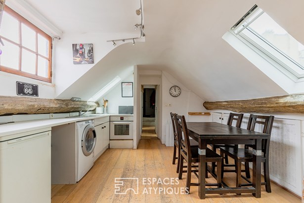 From the entrance, a hallway leads to the various rooms: a separate toilet, a bathroom with a bathtub, and a living space bathed in light, punctuated by beautiful old beams. The dual-aspect living room, extended by an open-plan kitchen and dining area, offers a warm and welcoming atmosphere, enhanced by the sloping ceilings that evoke the charm of a boat's hull.